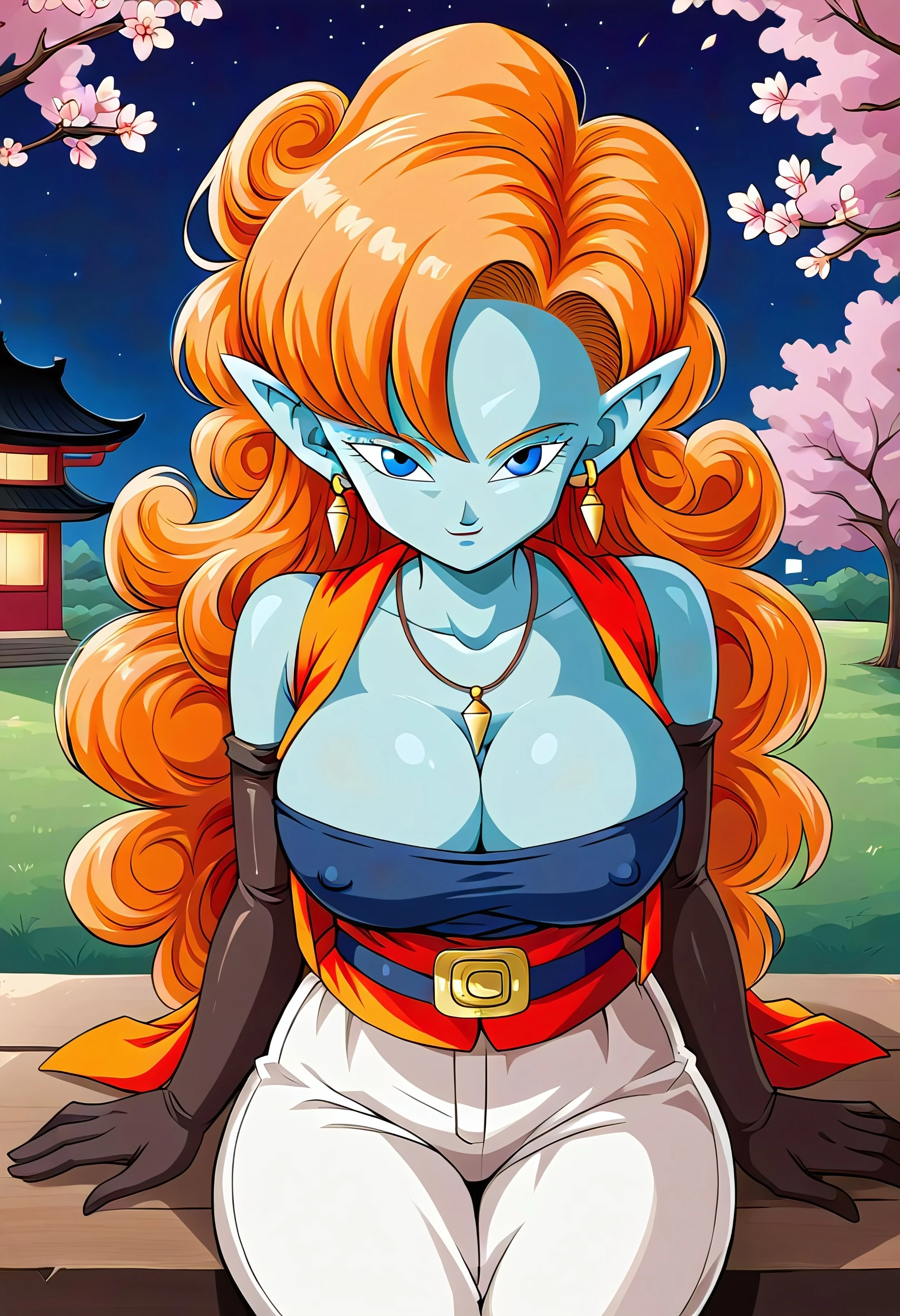 Zangya, curly hair, blue eyes, orange hair, long hair, pointy ears, necklace, earrings, jewelry, blue skin, colored skin