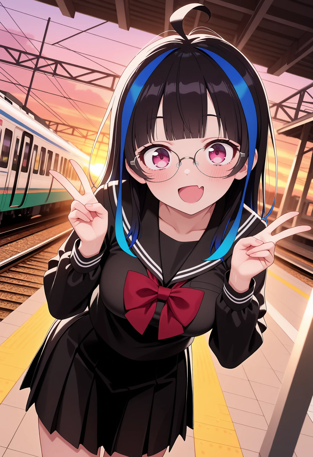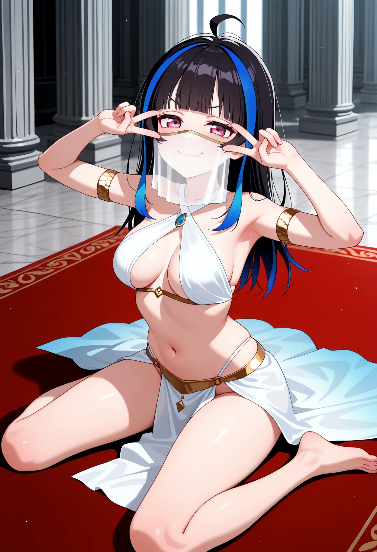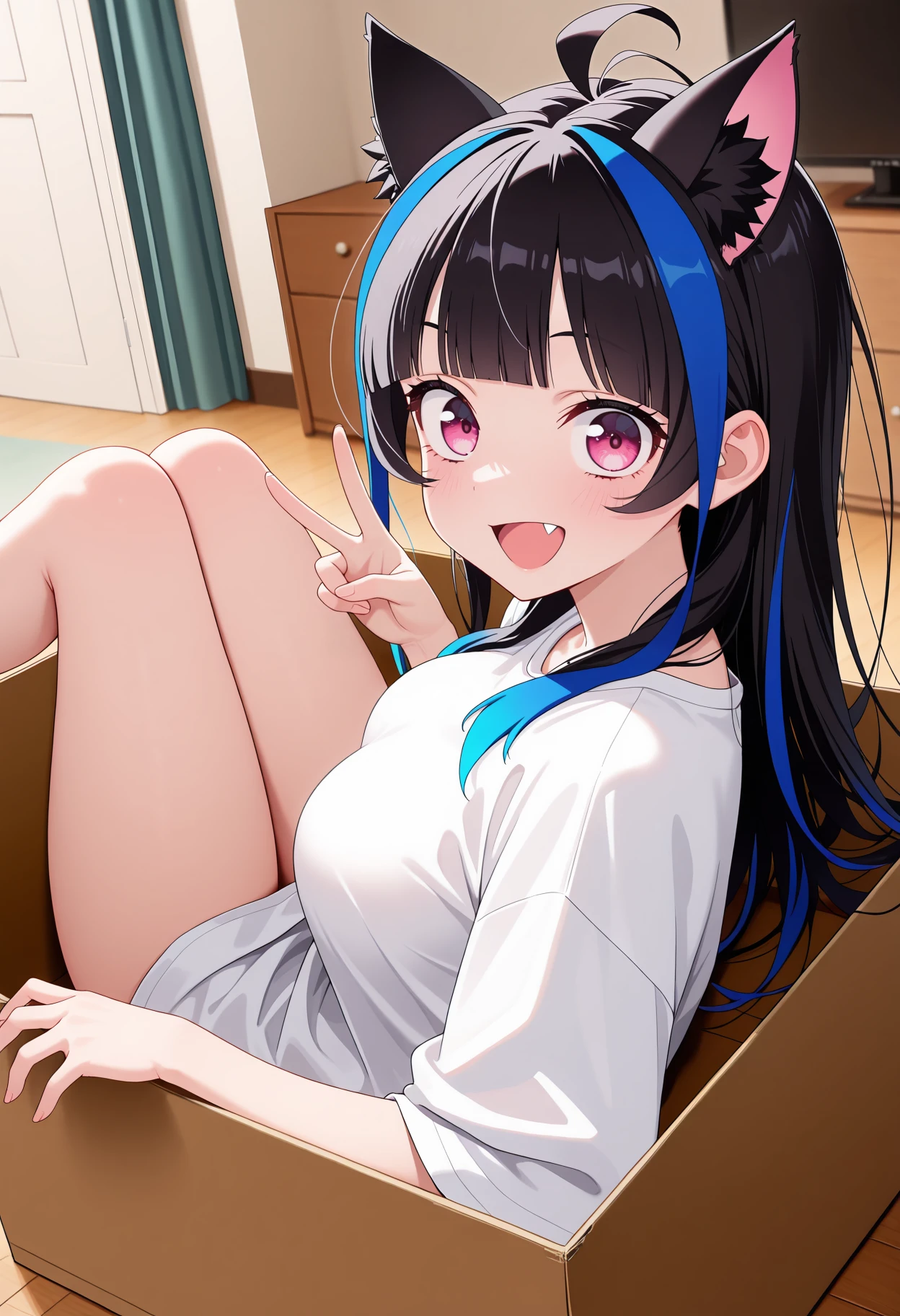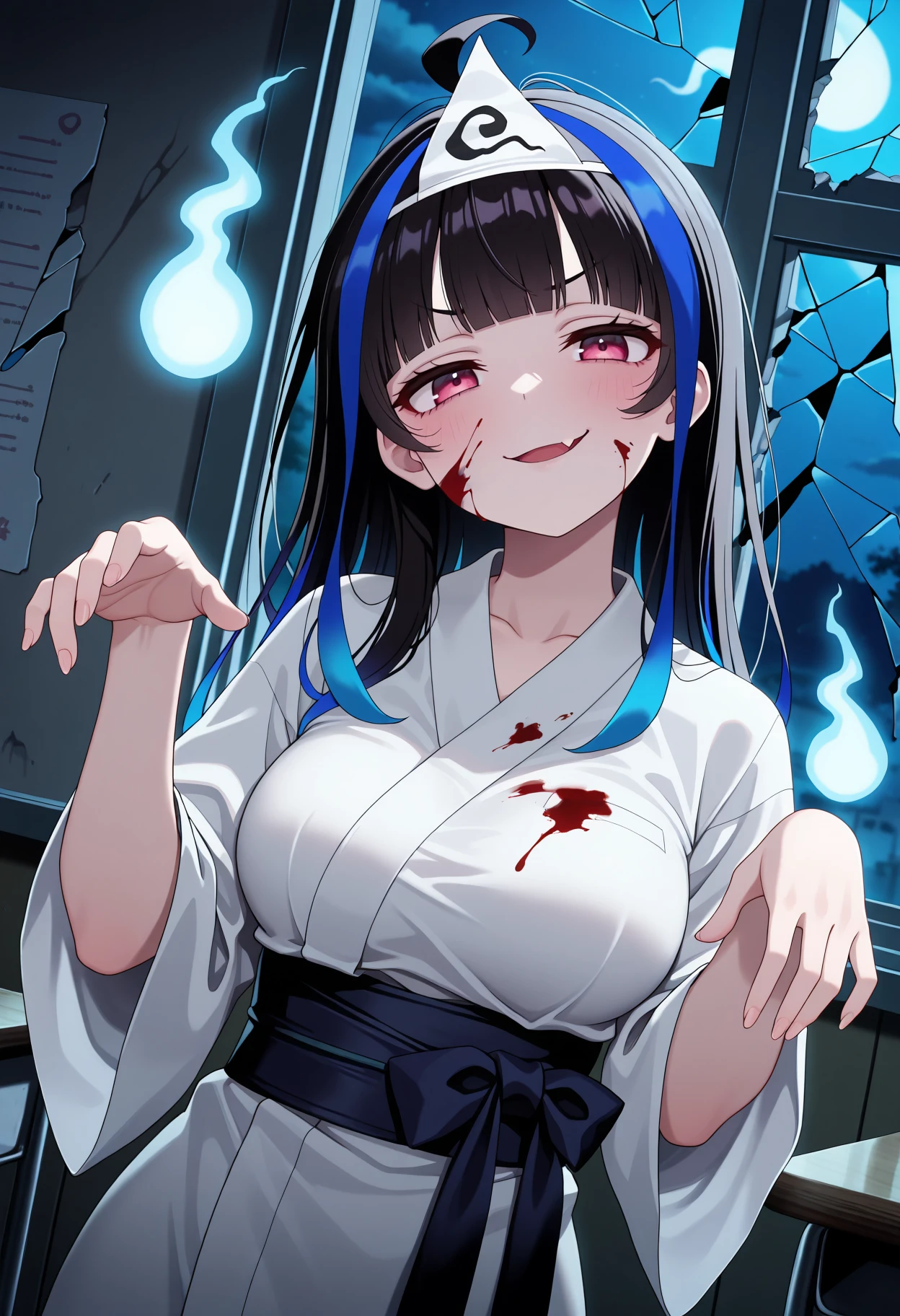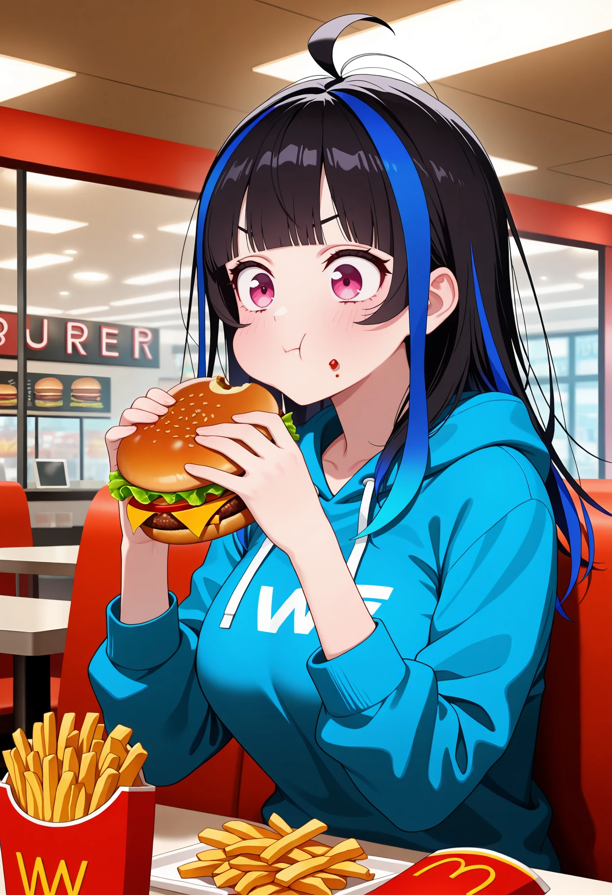 KJOmini, black hair, streaked hair, blue streaks, pink eyes, blunt bangs, long hair,