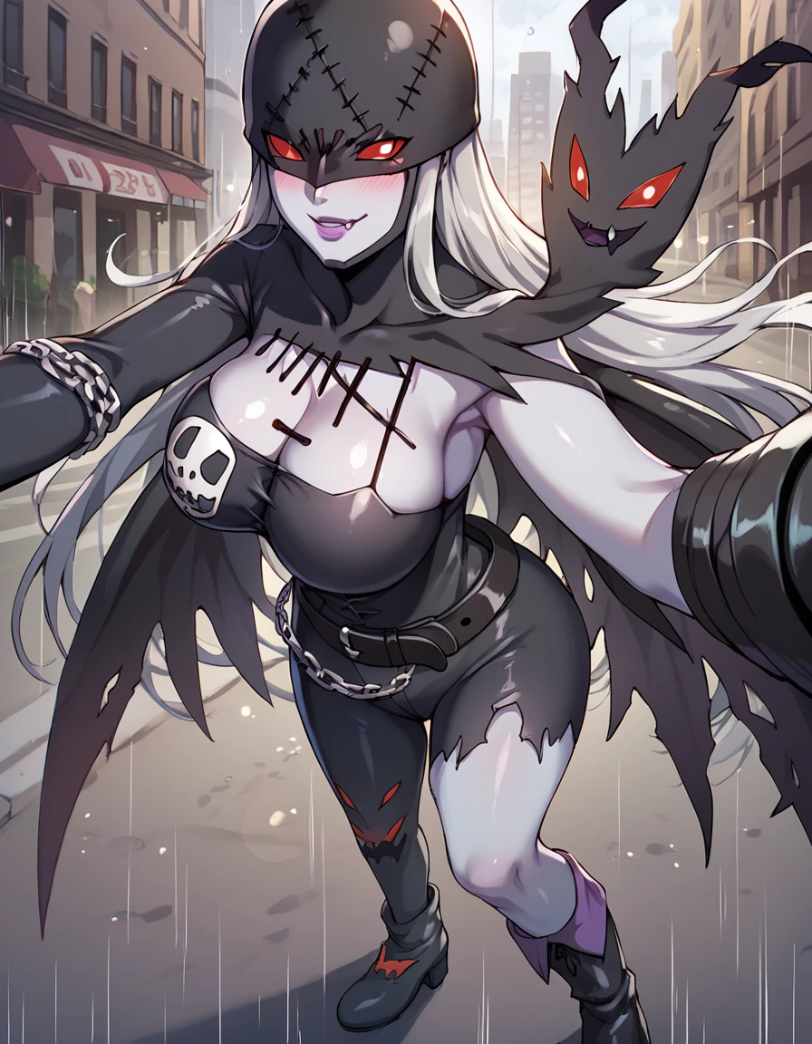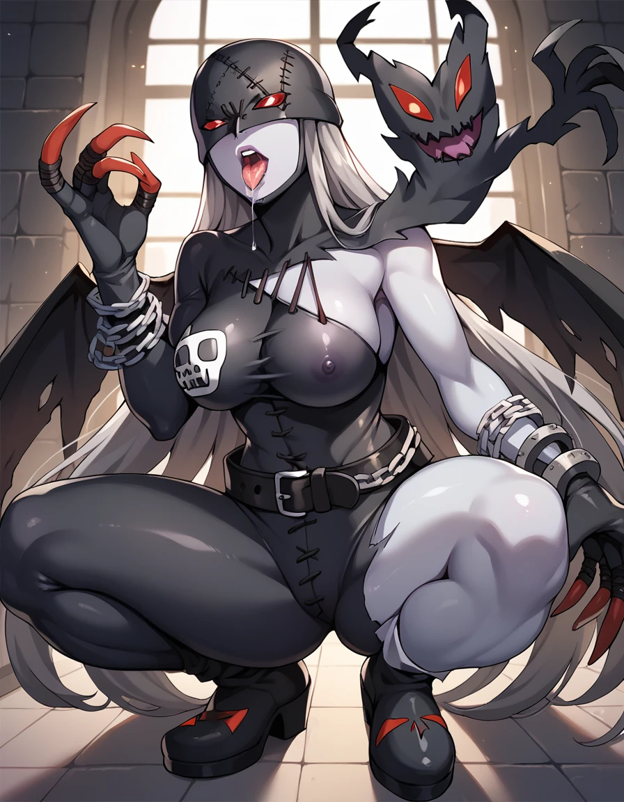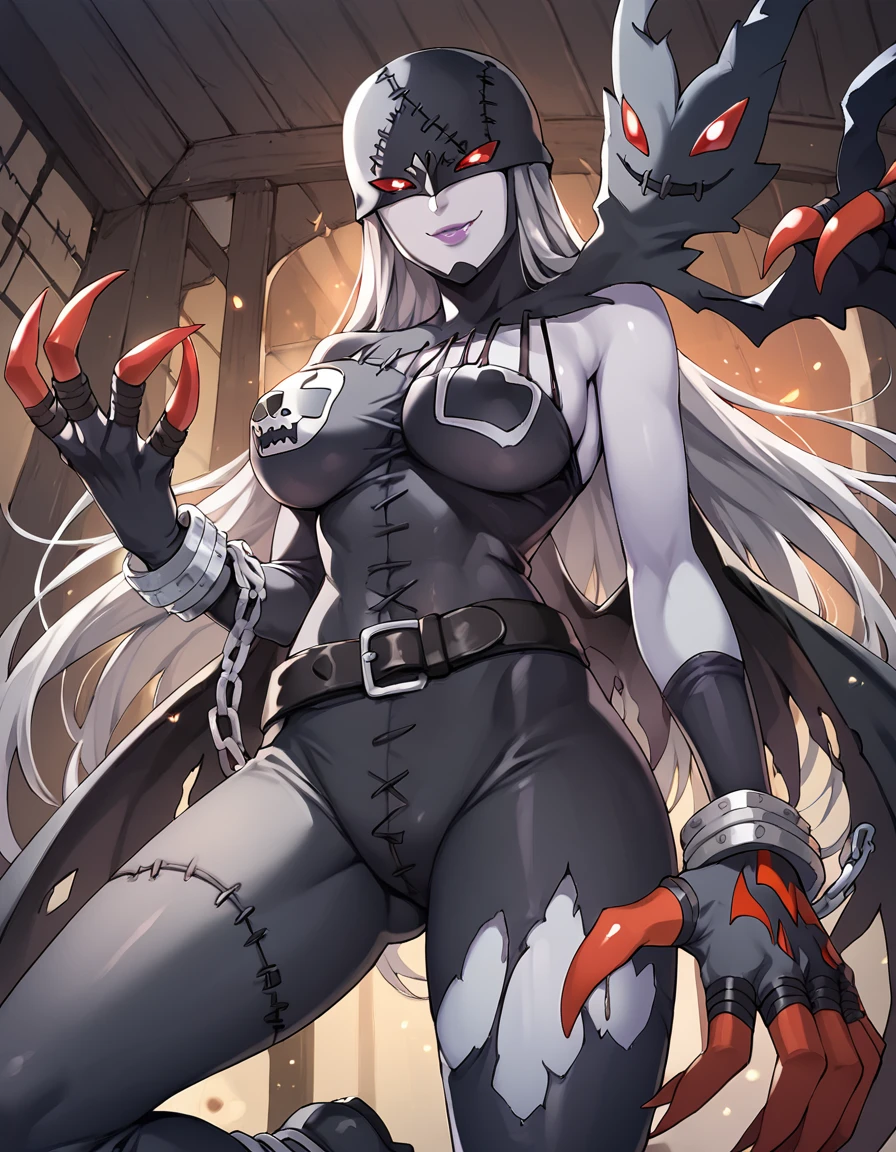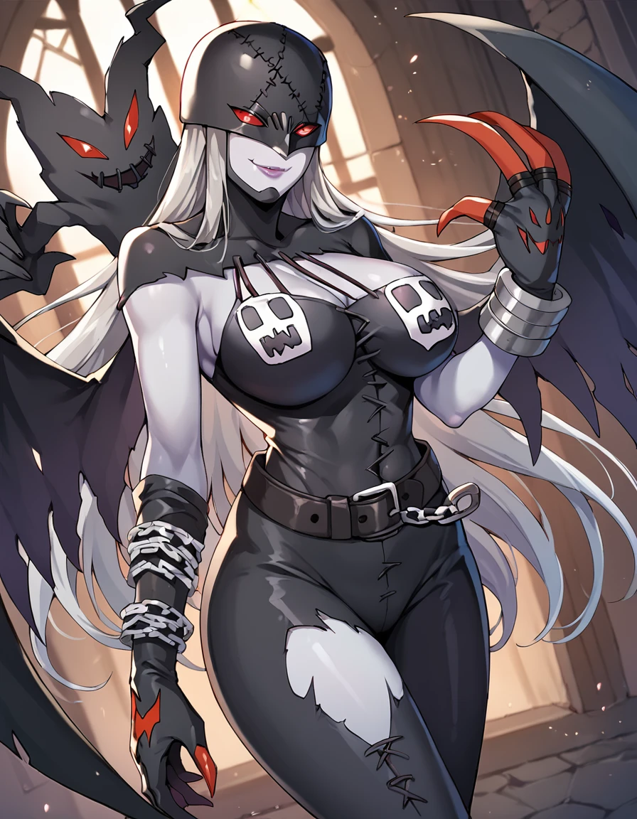 lady_devimonxl, long hair, grey hair, red eyes, large breasts, black wings, purple lips, mask,very long hair, grey skin, digimon \(creature\), wings, belt, colored skin, chain, claws, boots, black footwear, black bodysuit, gloves, stitches, torn clothes