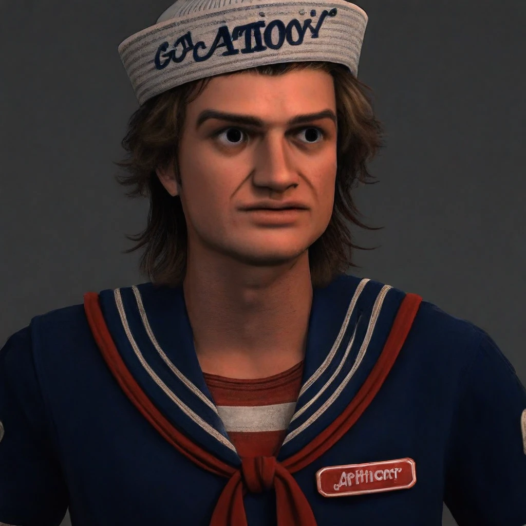 St3veH4rrington, 1boy, young face, stubble, black eyes, brown hair, medium hair, blue collared shirt, red neckerchief, blue shorts,