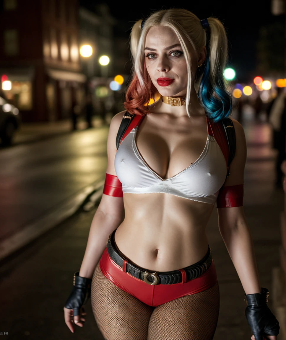 <lora:quiron_HarleyQuinn_v1150_Lora:0.57> HarleyQuinnQuiron, HarleyQuinn, makeup, solo, lipstick, looking at viewer, pantyhose, ultra detailed, one pretty girl, solo, cleavage, looking at viewer, (night street), scenery, fingerless gloves, Leaning against a wrought-iron balcony railing, she overlooks a bustling European street with a sense of allure,