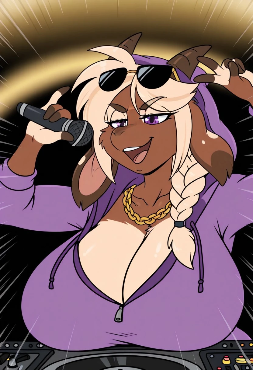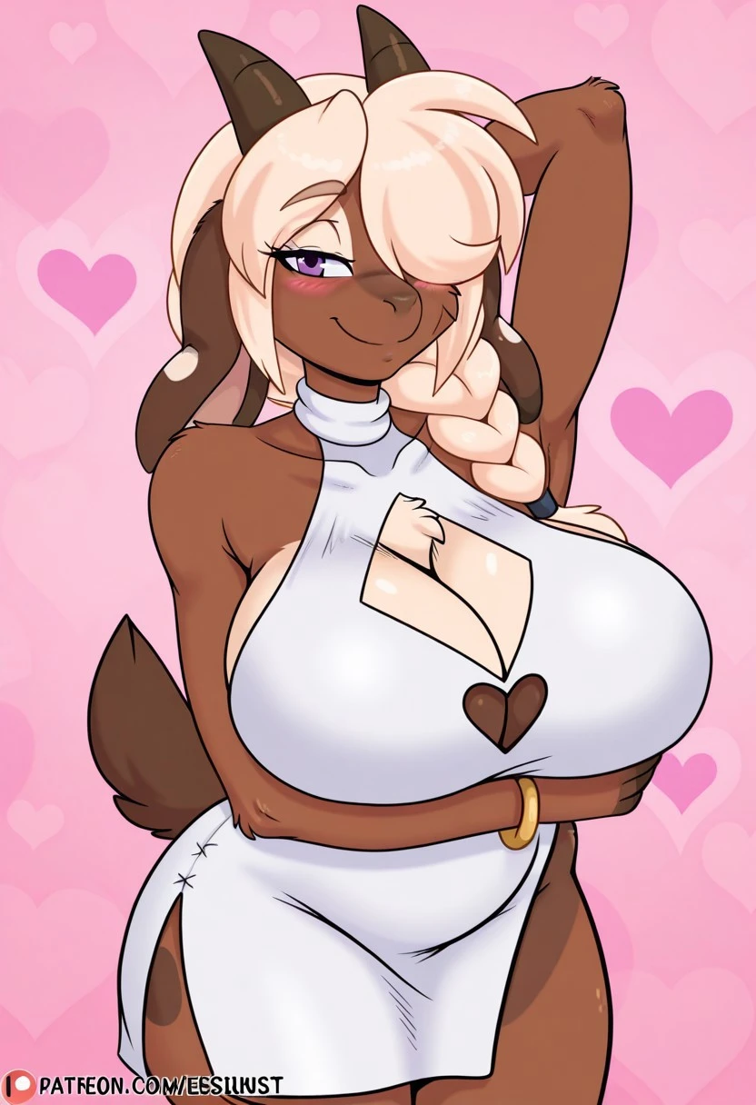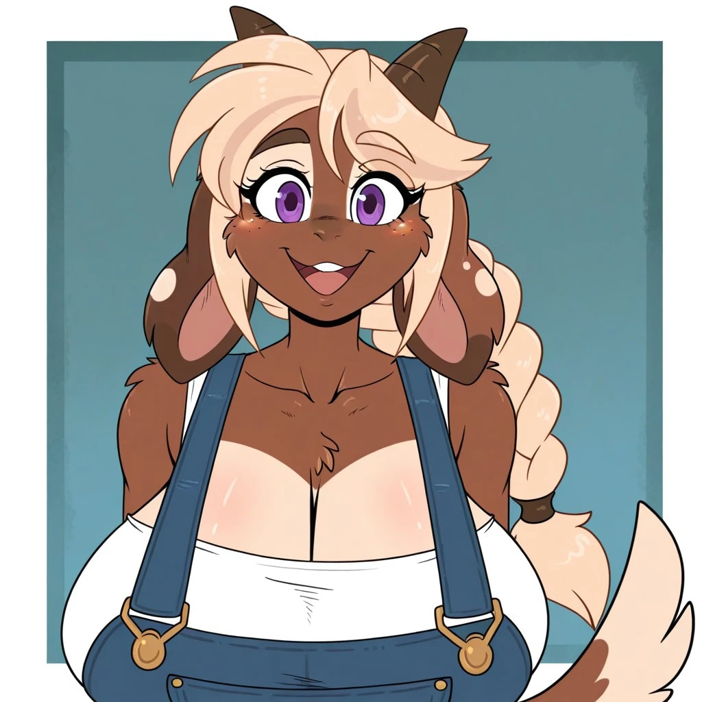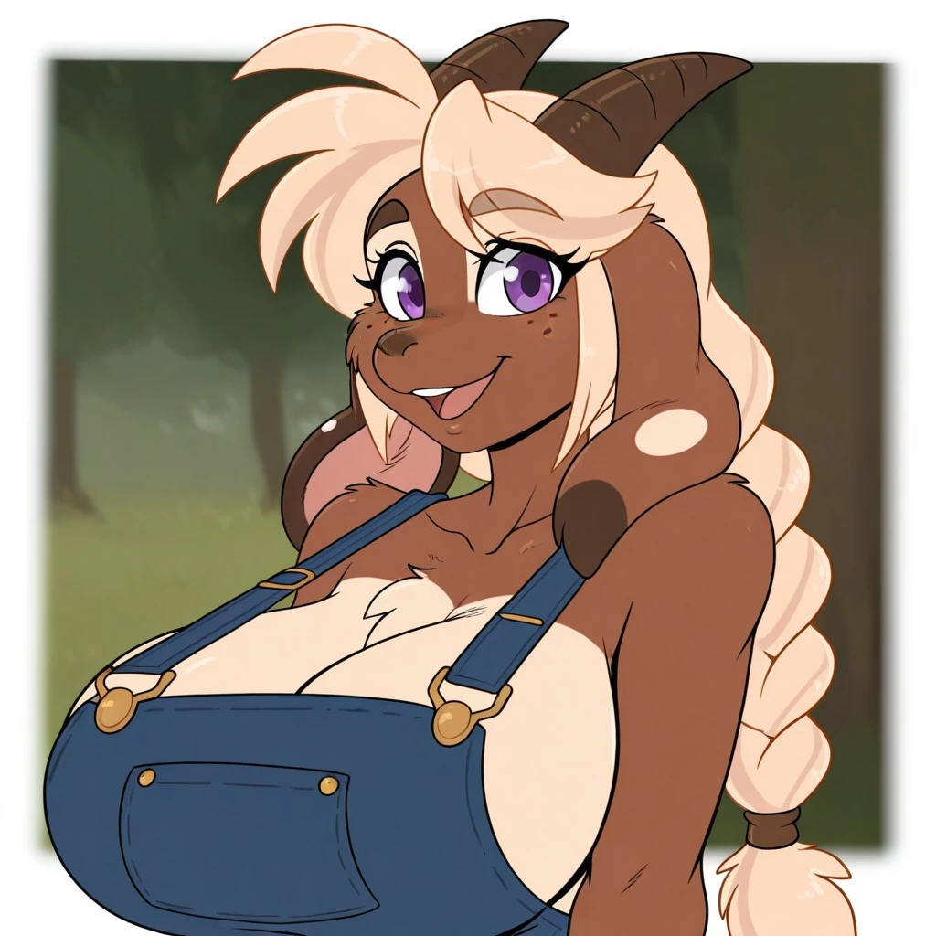 tessa_uq, 1girl, solo, tail, horns, goat girl, goat ears, furry, furry female, breasts, animal ears, huge breasts, long hair, purple eyes, brown fur, braid, blonde hair, snout, body fur, animal nose