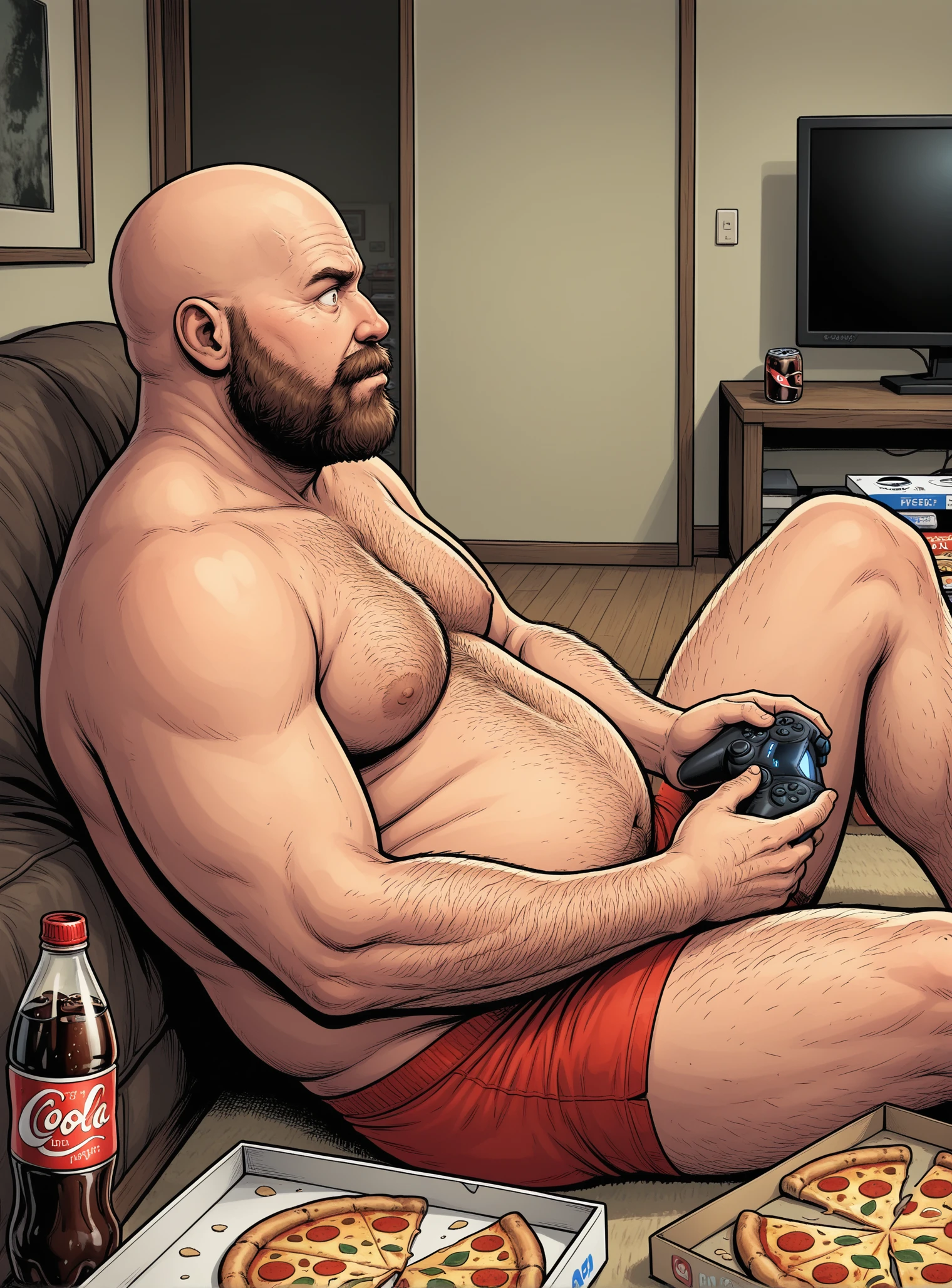AF2125OLZM45, bald, 1boy, solo, beard, topless male, brown eyes, chest hair, fat man,
