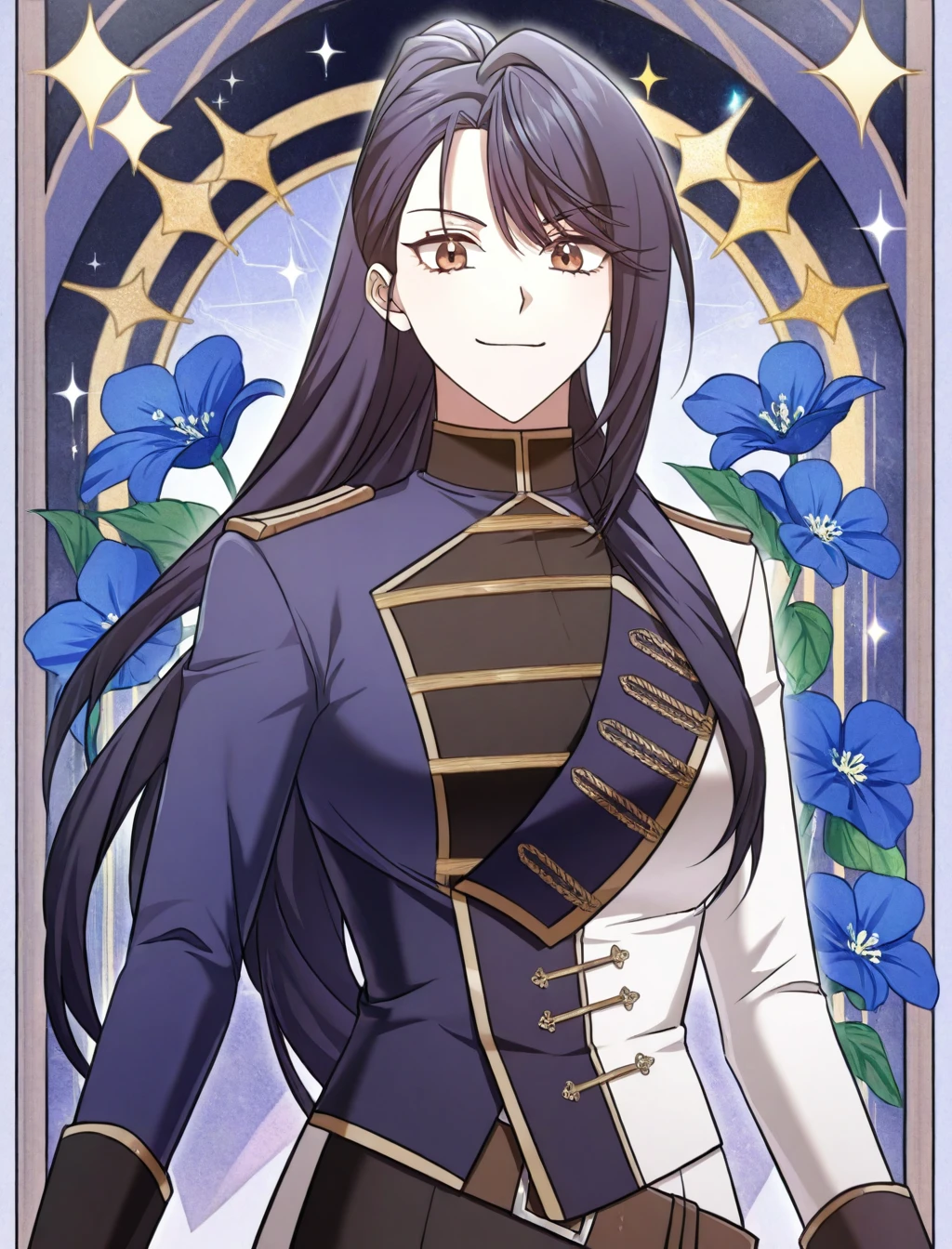 military uniform, multicolored jacket, belt, black boots, black pants