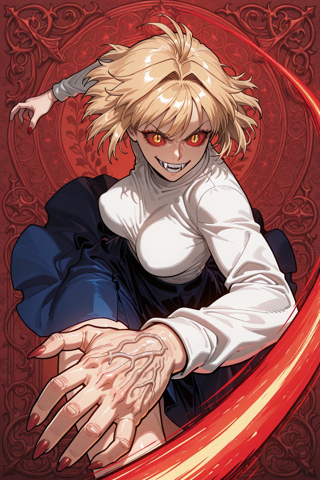 warc, slit pupils, colored sclera, red sclera, yellow eyes, blonde hair, short hair, hair intakes, antenna hair, white turtleneck sweater, purple skirt, black pantyhose, black shoes,