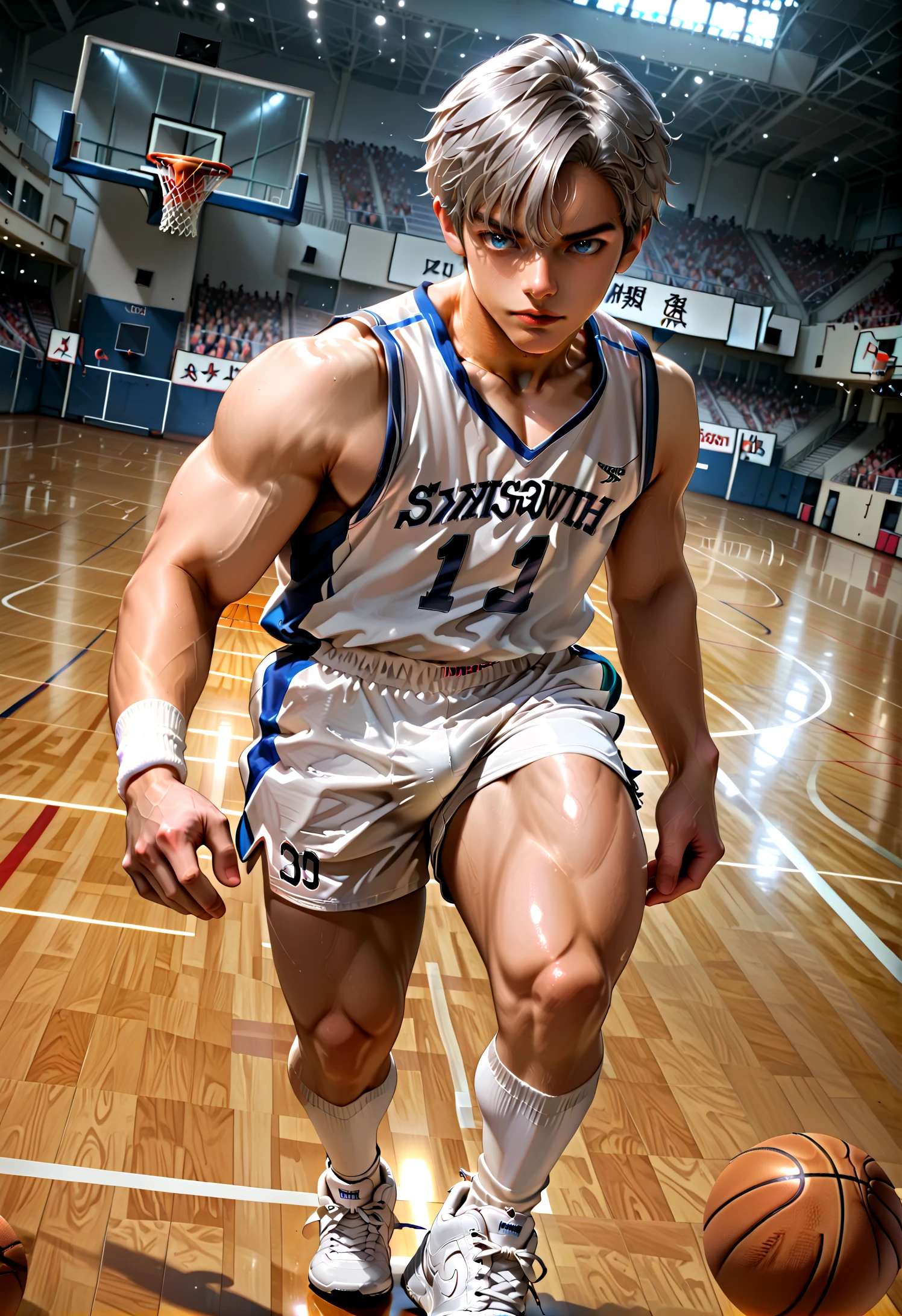 basketball uniform, sleeveless shirt, little shorts, socks, sneakers