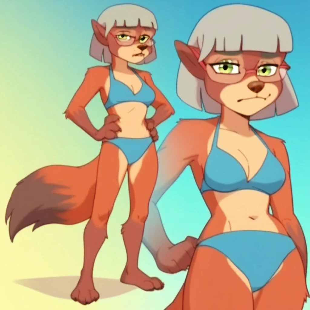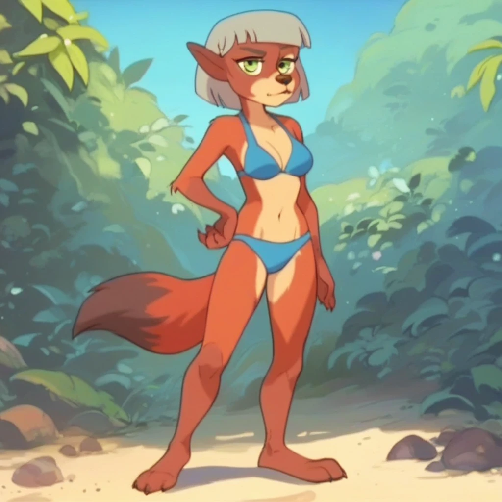 red fox foxgirl, red-brown fur, grey hair, short hair, tan snout, brown nose, green eyes, pointed ears, bushy fox tail,