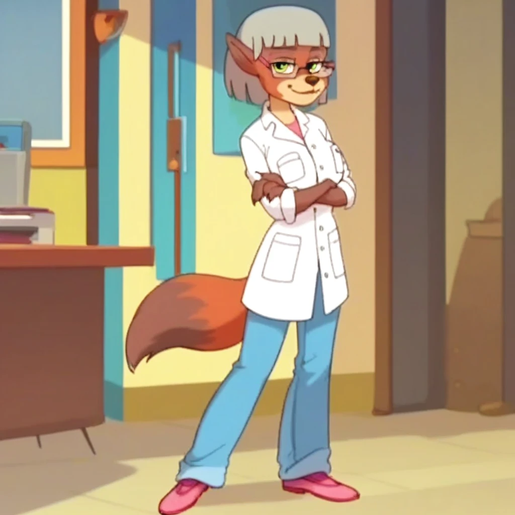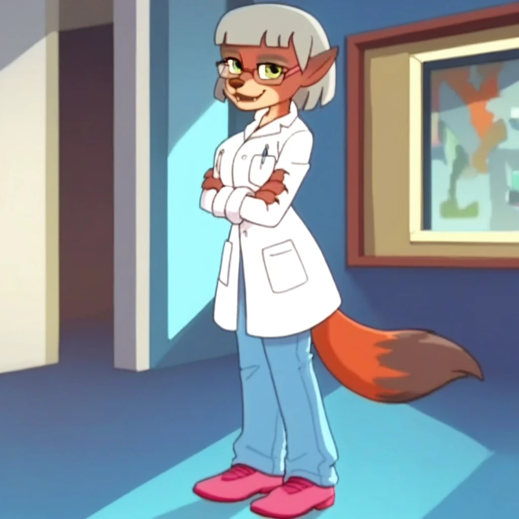 dioptric glasses, white lab coat, breast pocket, pink under shirt, denim jeans, pink shoes,