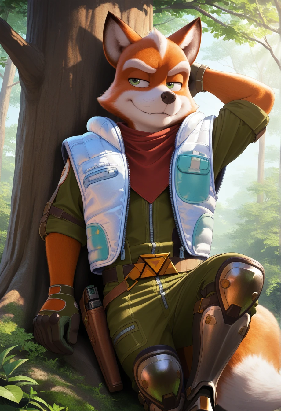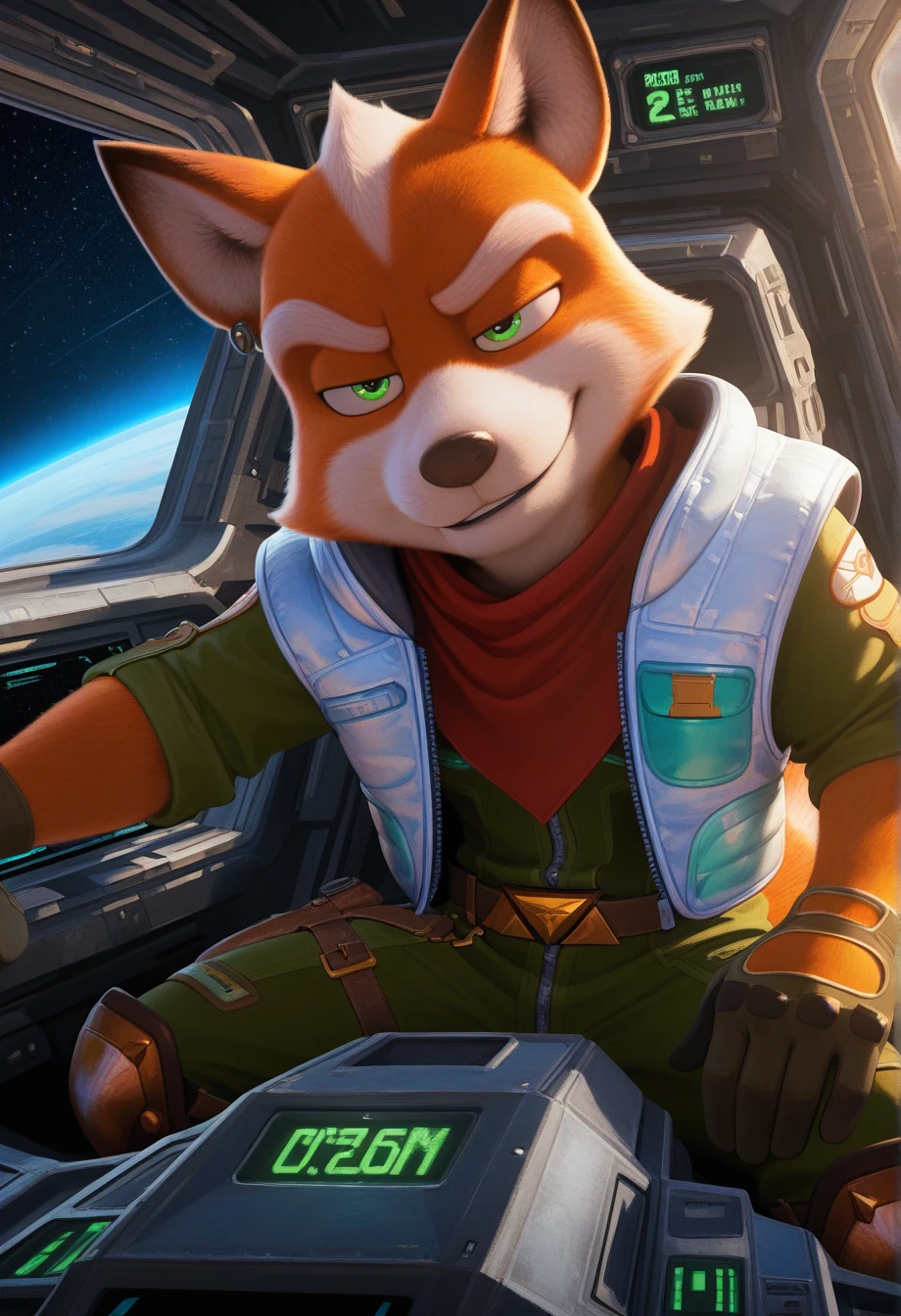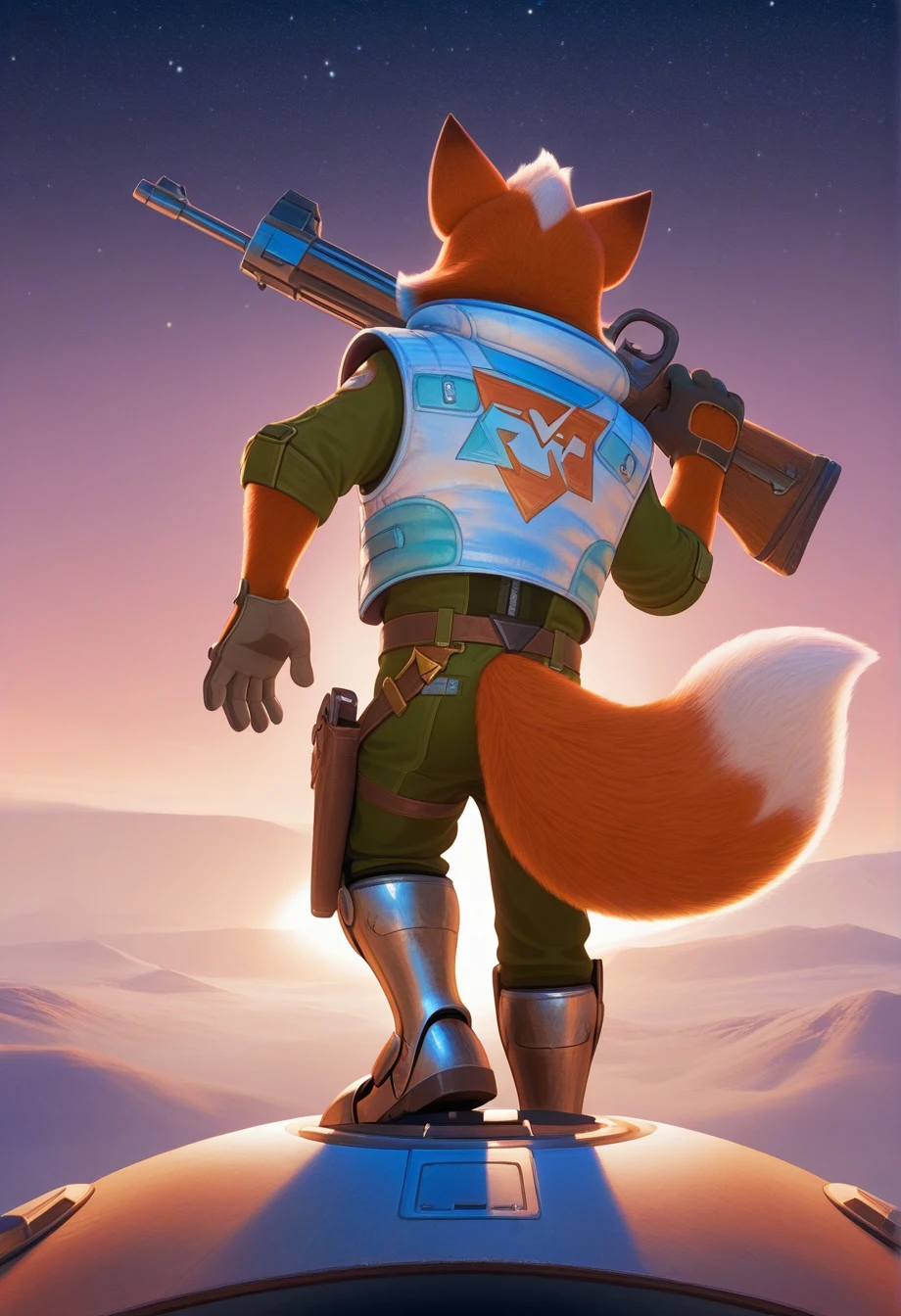 foxmgm, green eyes, green jumpsuit, light-blue down vest, red bandana around neck, armored boots, tail, glove cutout, gunbelt, holster, gun