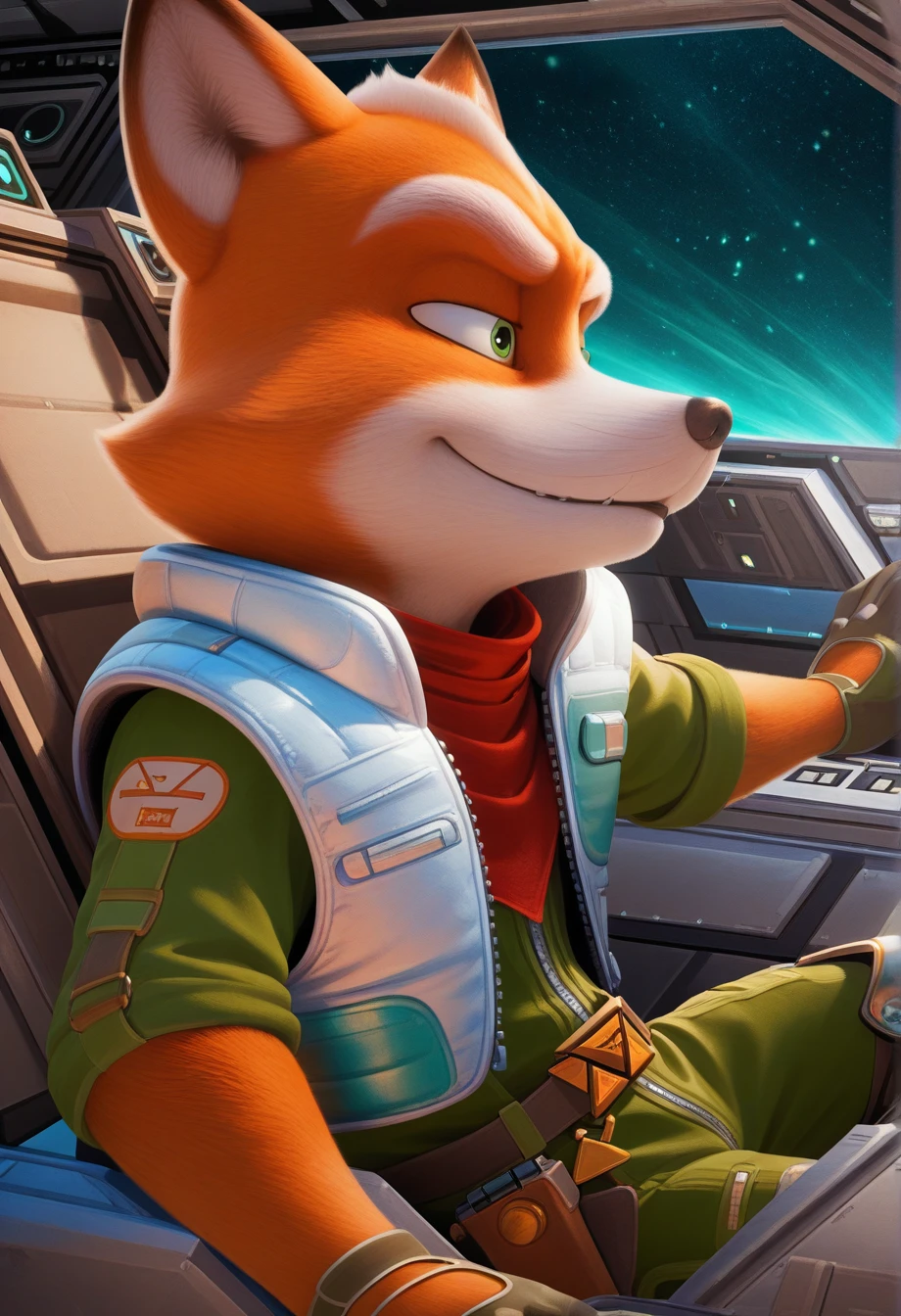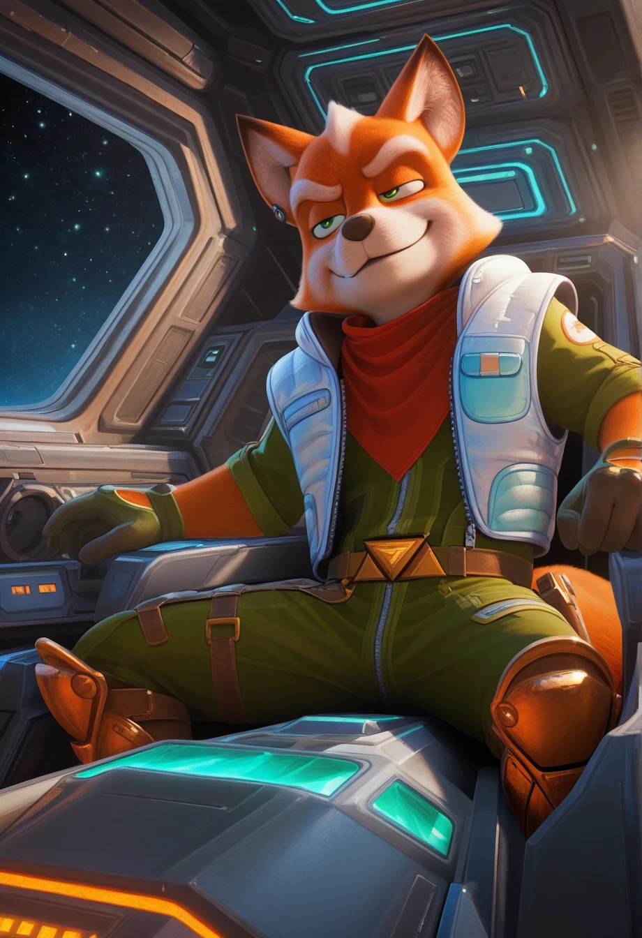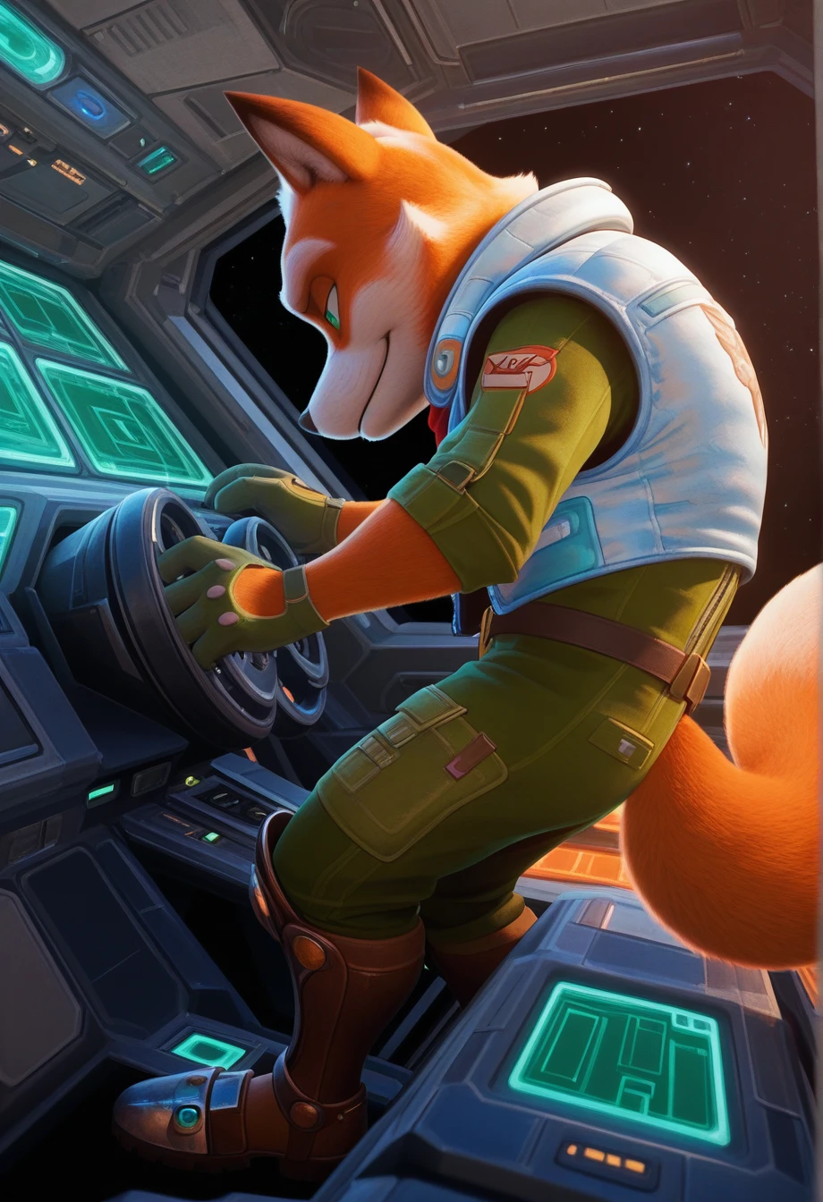foxmgm, green eyes, green jumpsuit, light-blue down vest, red bandana around neck, armored boots, tail, glove cutout, gunbelt, holster, gun