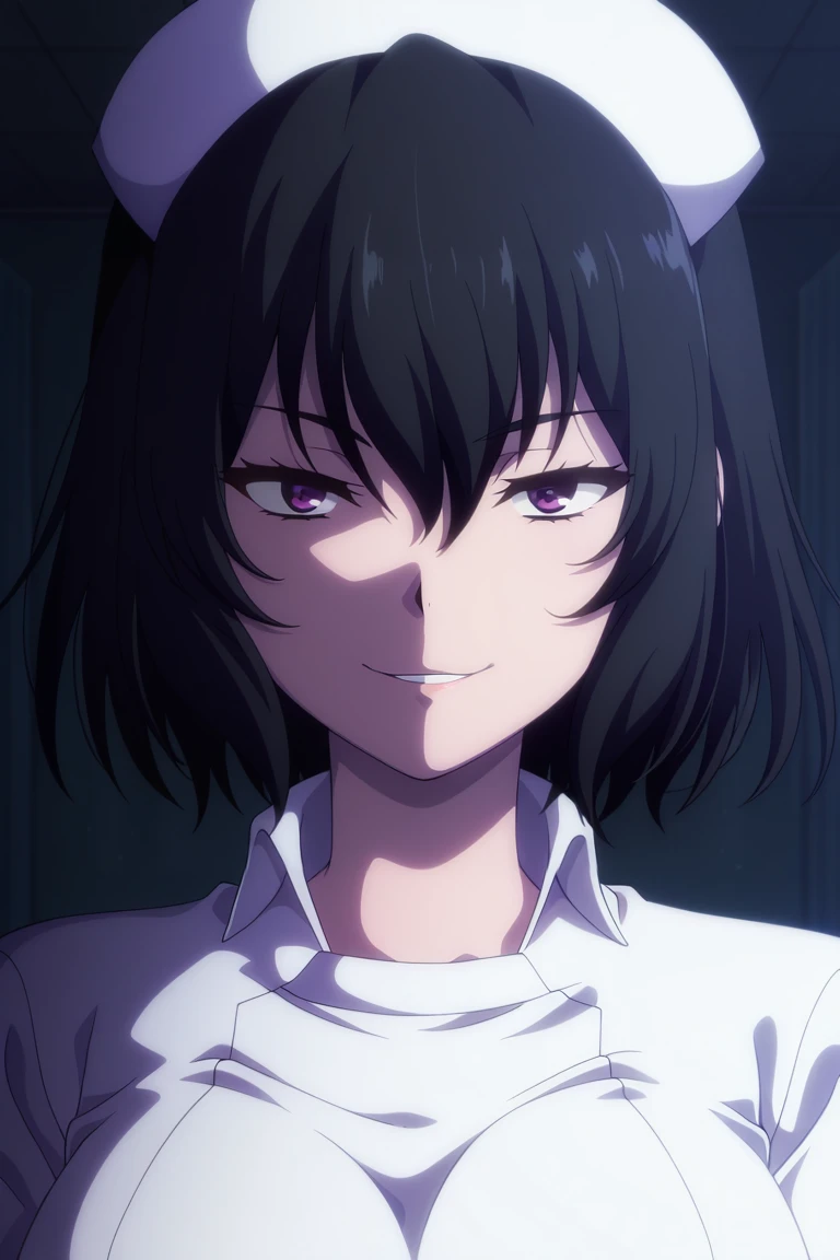 1girl, Mako Tendou, short hair, black hair, purple eyes, glossy lips, big breasts, curvy, wide hips, thick thighs, official_style, anime_coloring