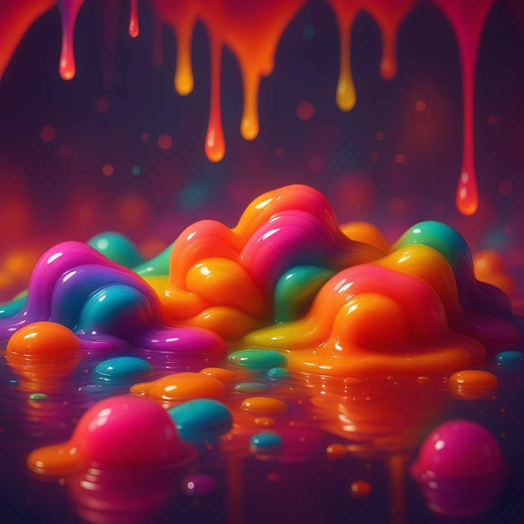 rainbow slime, multicolor liquid, iridescent colors, hyper-saturated colors, glossy surface, liquid blobs, dripping fluid, viscous material, surreal 3d style, smooth organic shapes, melting forms, fluid simulation look, vibrant neon colors, candy-like texture, soft reflections, high gloss finish, colorful gradients, abstract liquid art, dreamlike atmosphere, playful surrealism, fantasy material, liquid sculpture, volumetric lighting, macro detail look, cinematic lighting, soft depth of field, ultra smooth shading, digital art render, stylized realism, high detail 3d