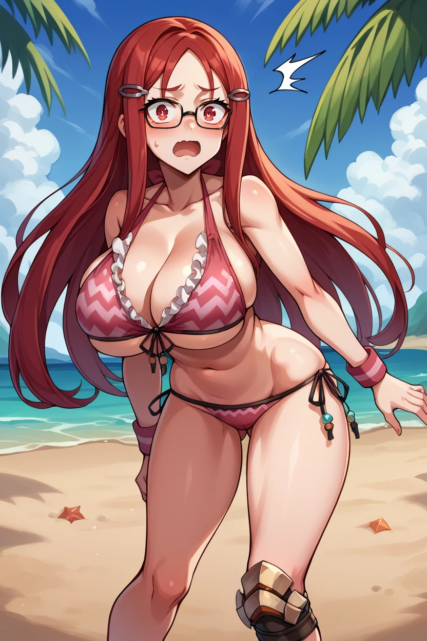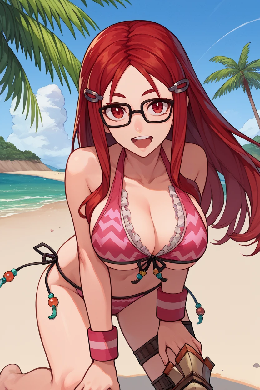 hairclip, glasses, pink bikini, frills, side-tie bikini bottom, wristband, knee pad,