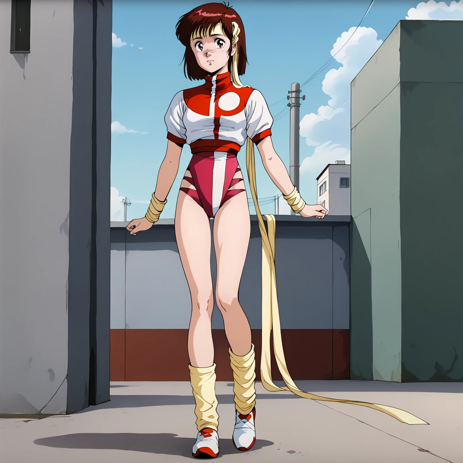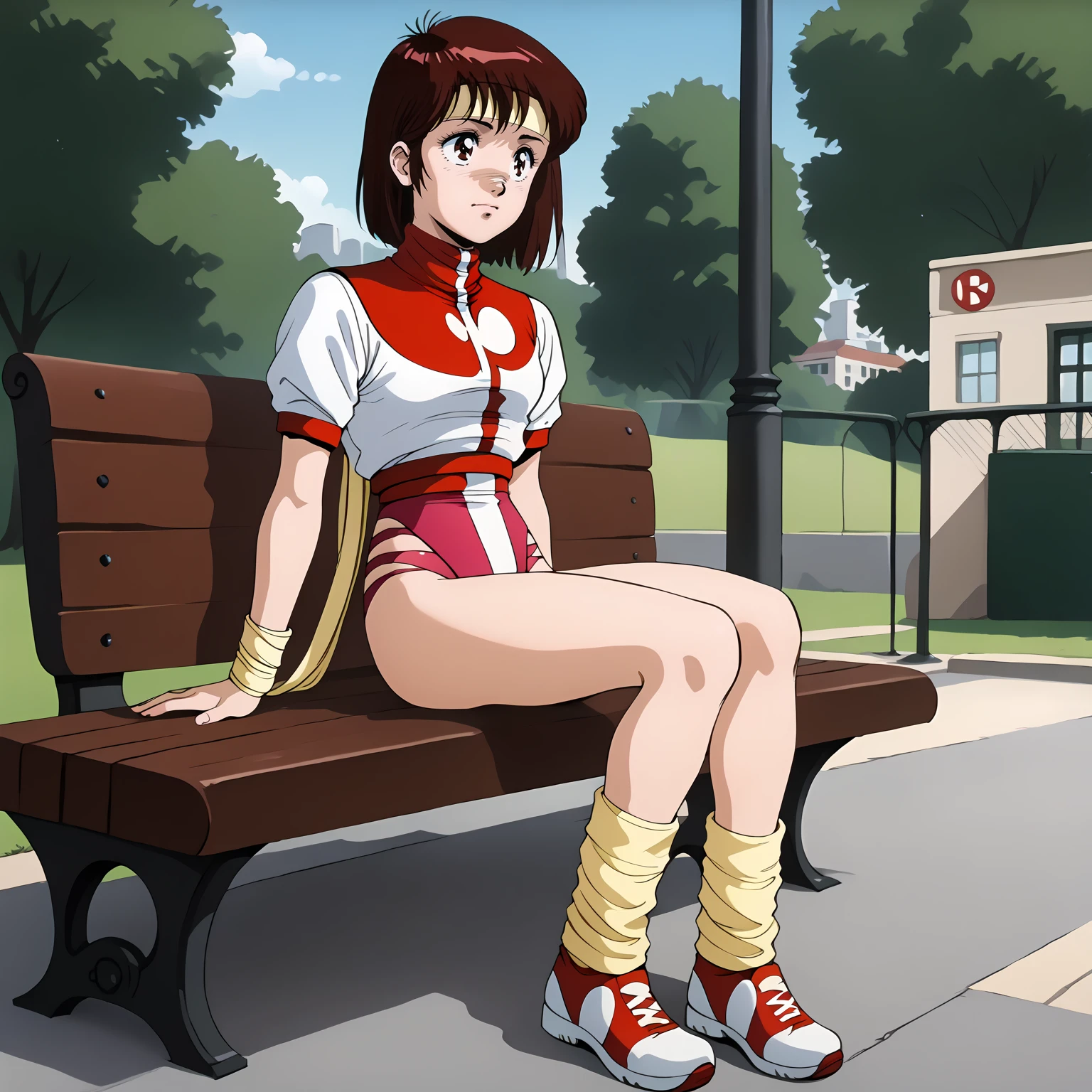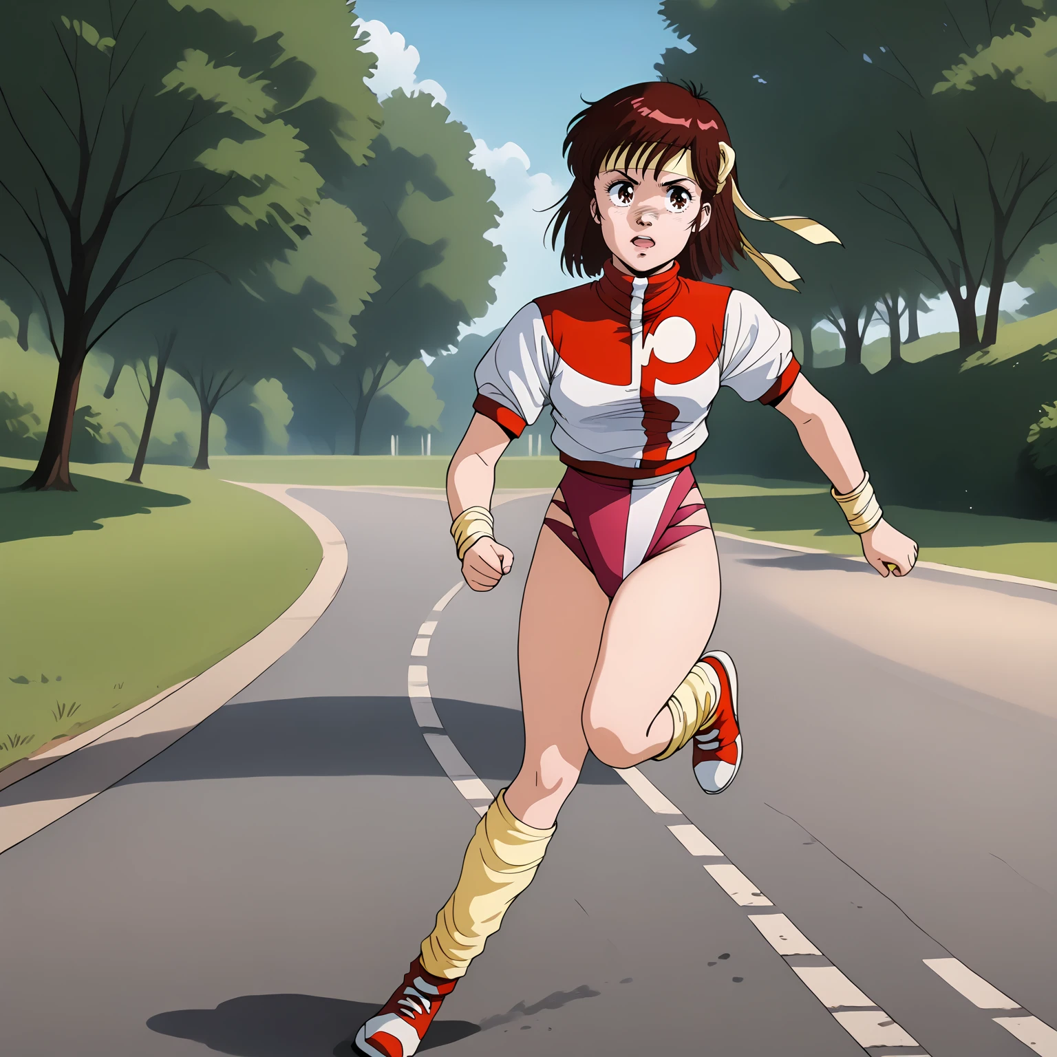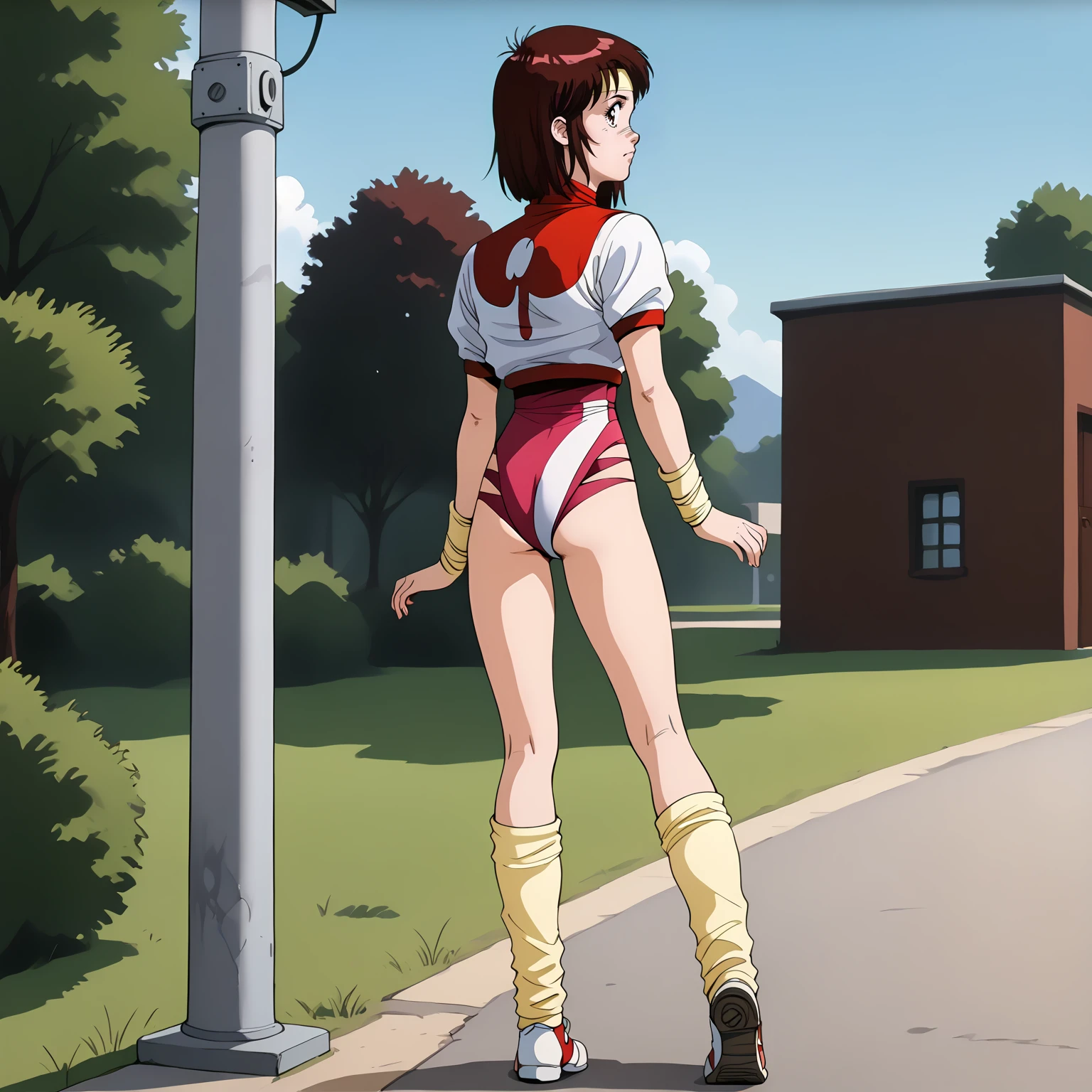 headband, short sleeves,leotard under clothes, wristband, leg warmers,shoes,