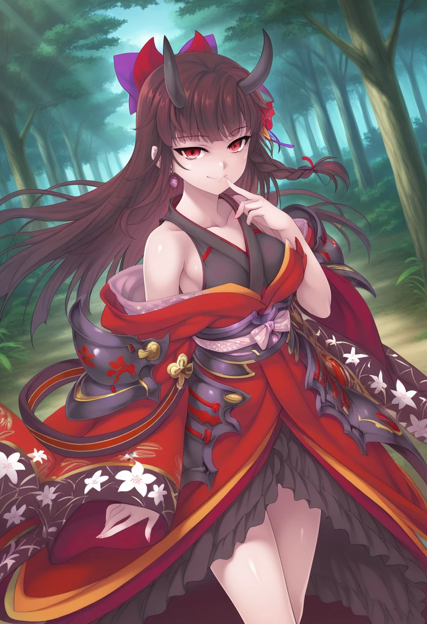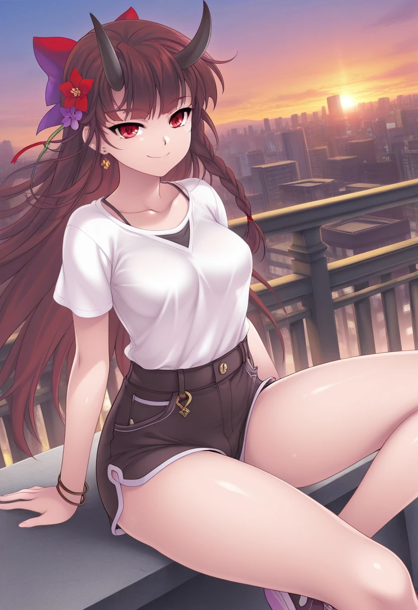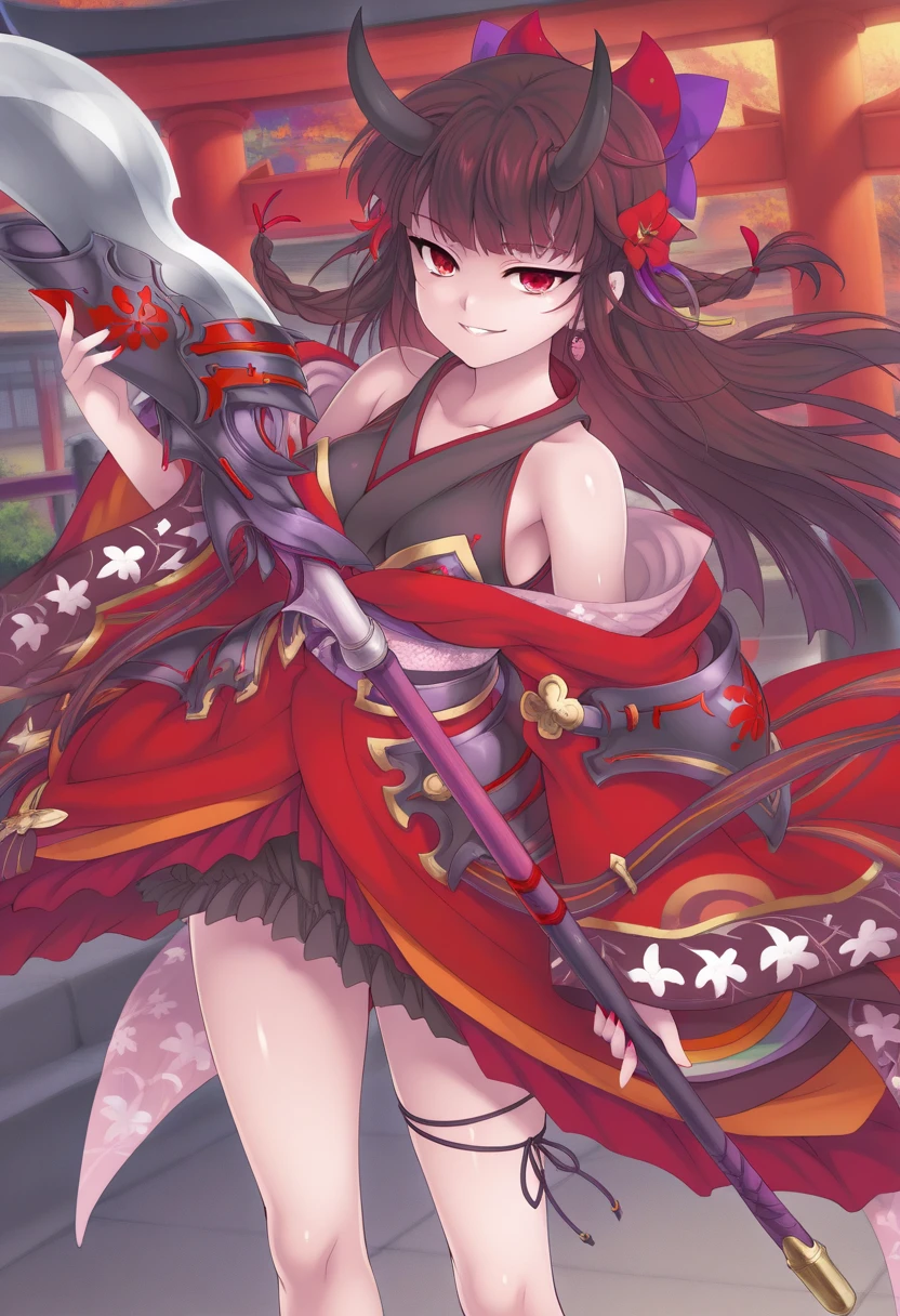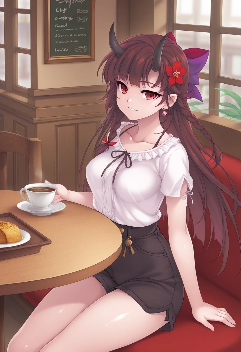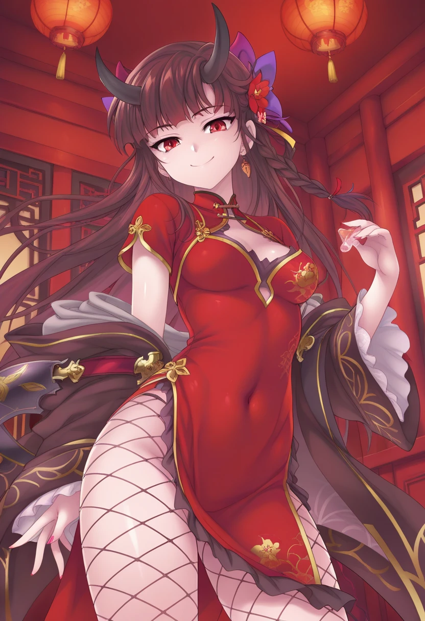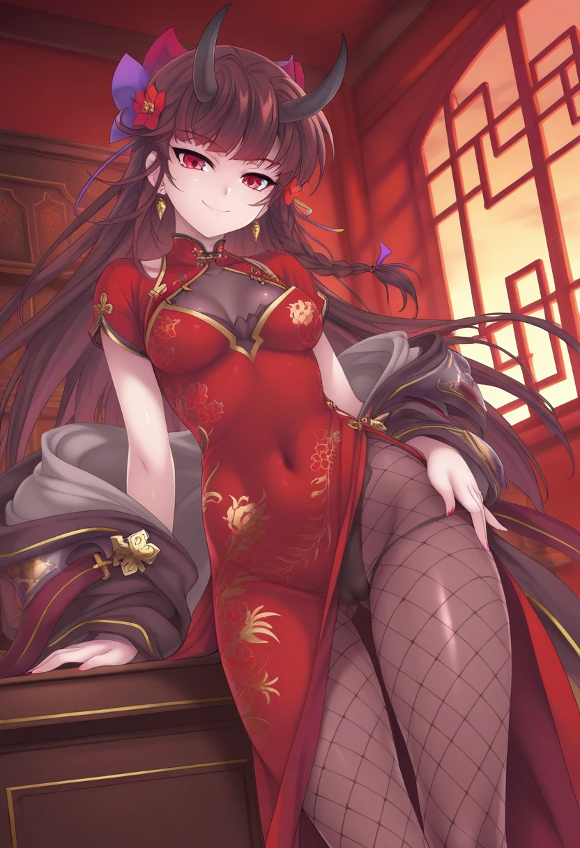 visBGR, brown hair, long hair, single braid, red eyes, horns