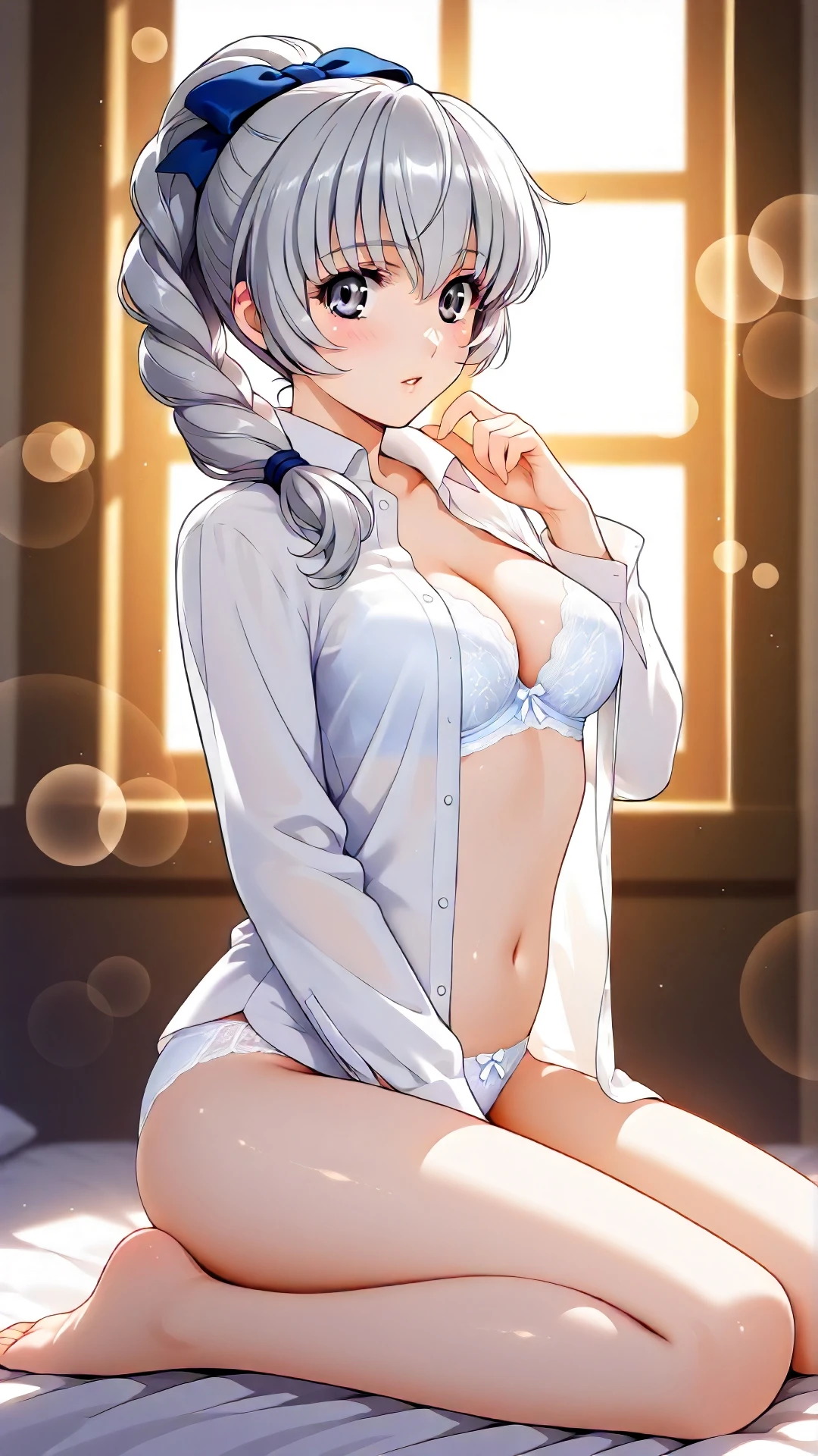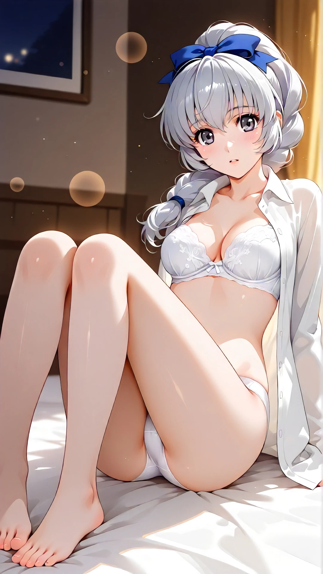 teletha_testarossa, an anime girl, 1girl, solo, long hair, shirt, underwear, panties, grey hair, open clothes, barefoot, bra, white panties, grey eyes, open shirt, lingerie, white bra