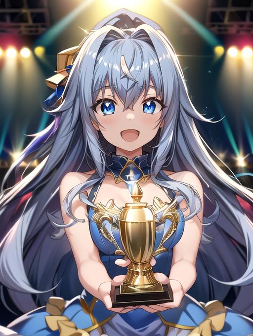 Additional words that may help: holding trophy, (your trophy color), happy,