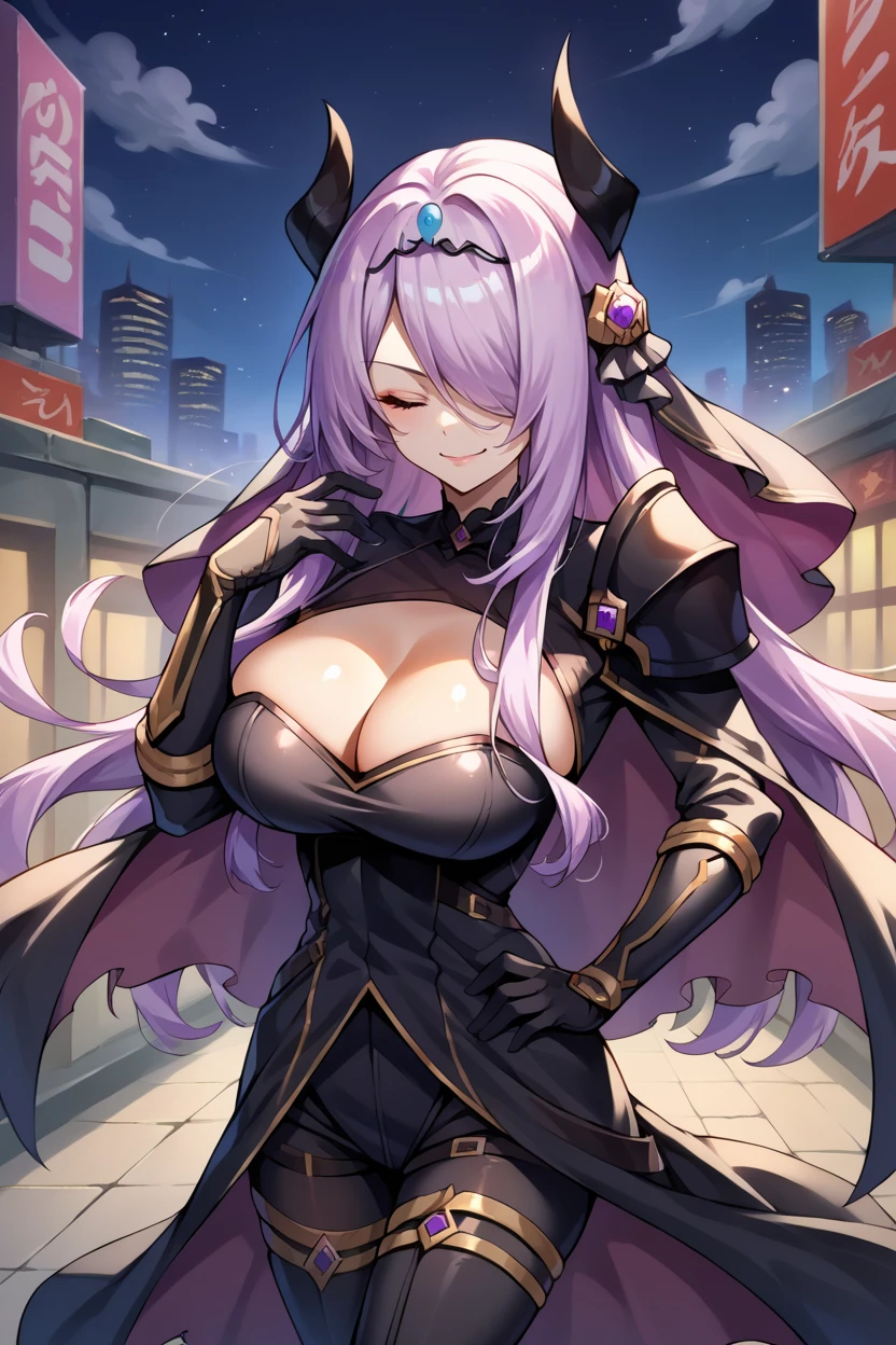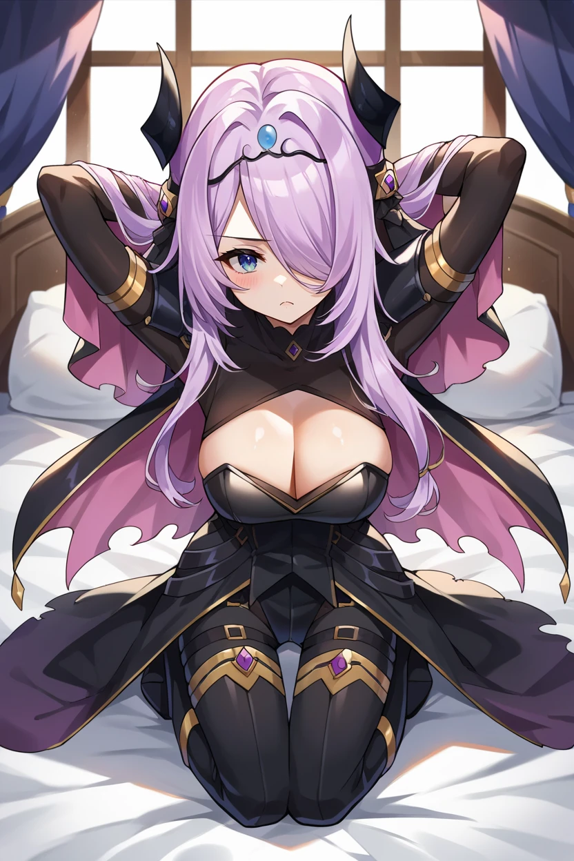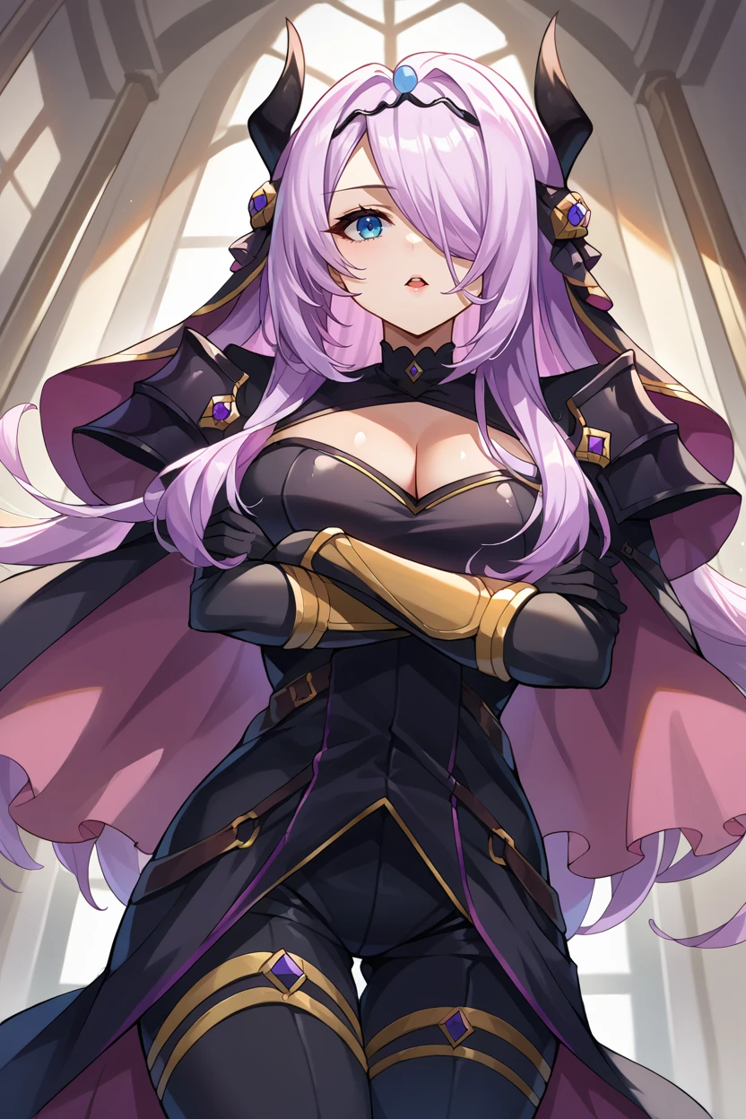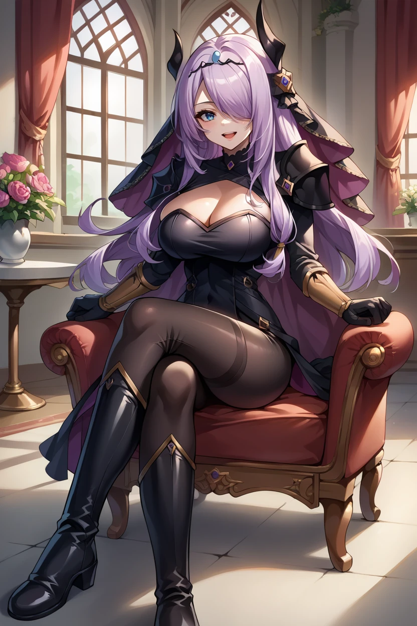 Add "hair over one eye, horns, tiara, veil, black bodysuit, shoulder armor, long sleeves, cleavage cutout, black gloves, black overskirt, black pants, black boots" for her typical look.