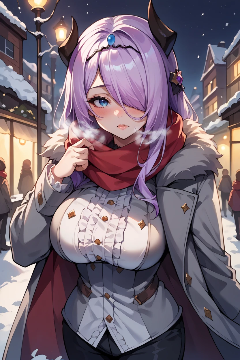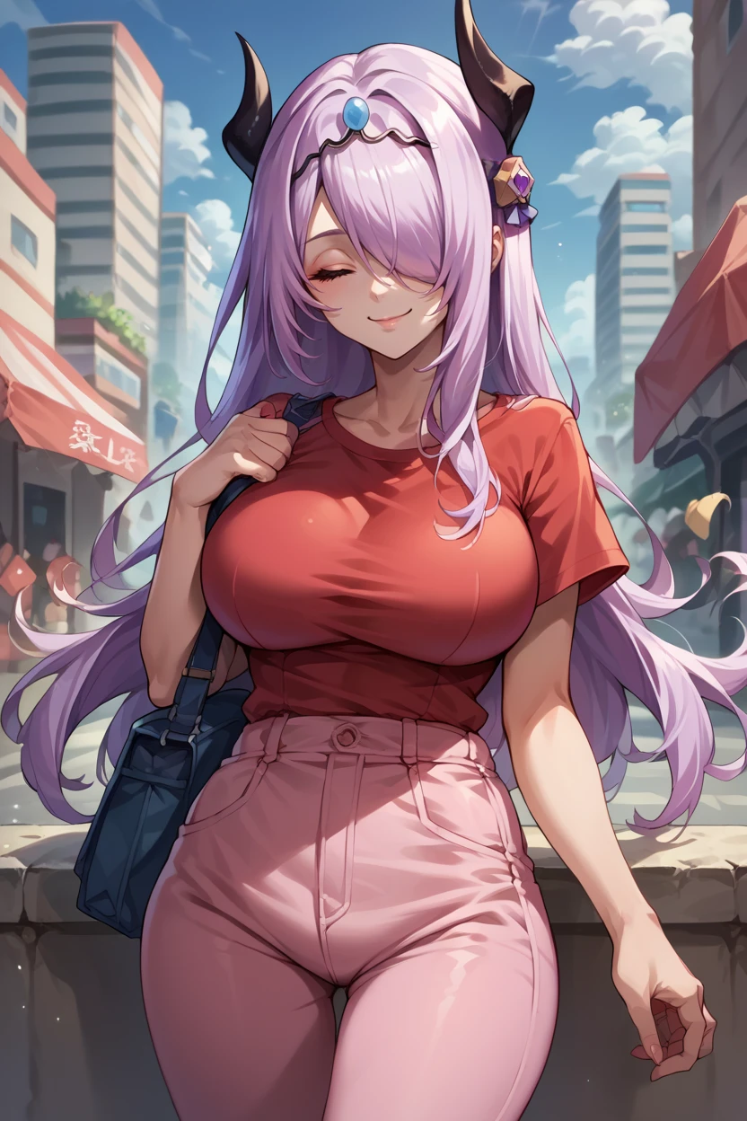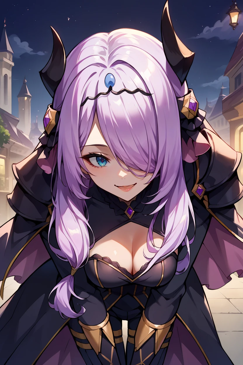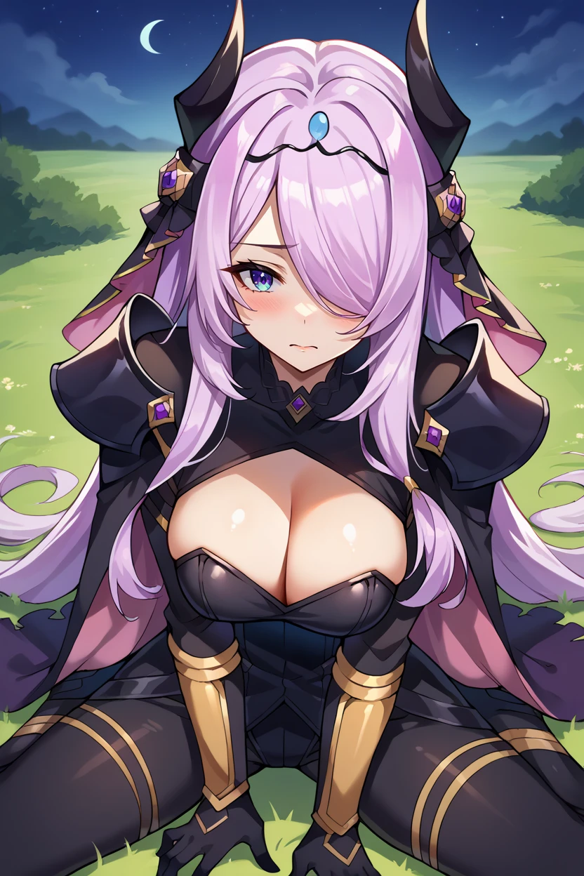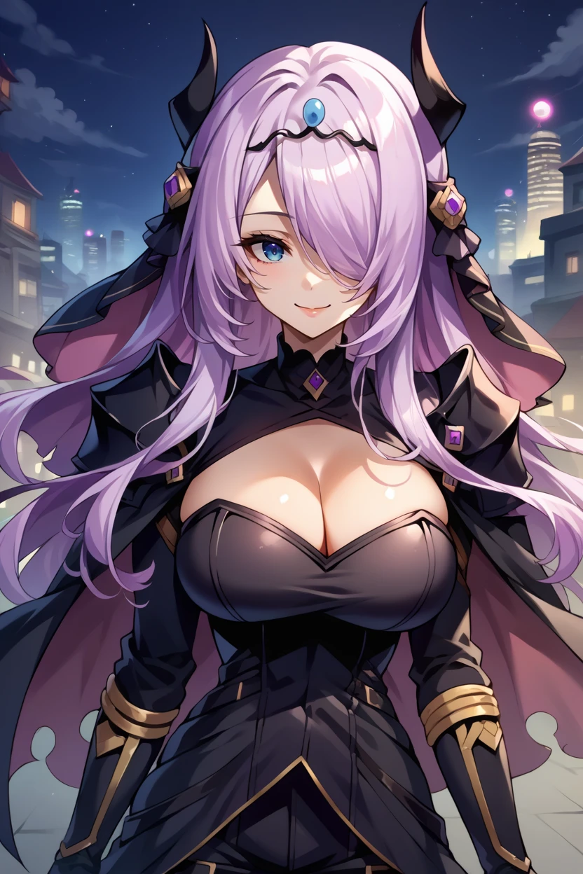 Add "hair over one eye, horns, tiara, veil, black bodysuit, shoulder armor, long sleeves, cleavage cutout, black gloves, black overskirt, black pants, black boots" for her typical look.