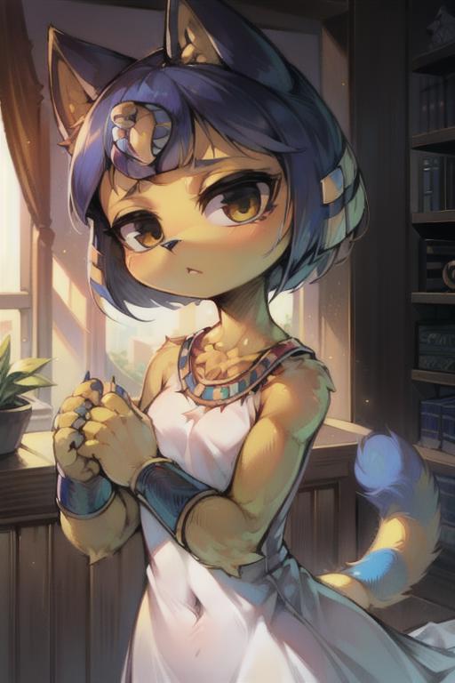 'Ankha (Animal Crossing), snake hair ornament, white dress' - Example prompt