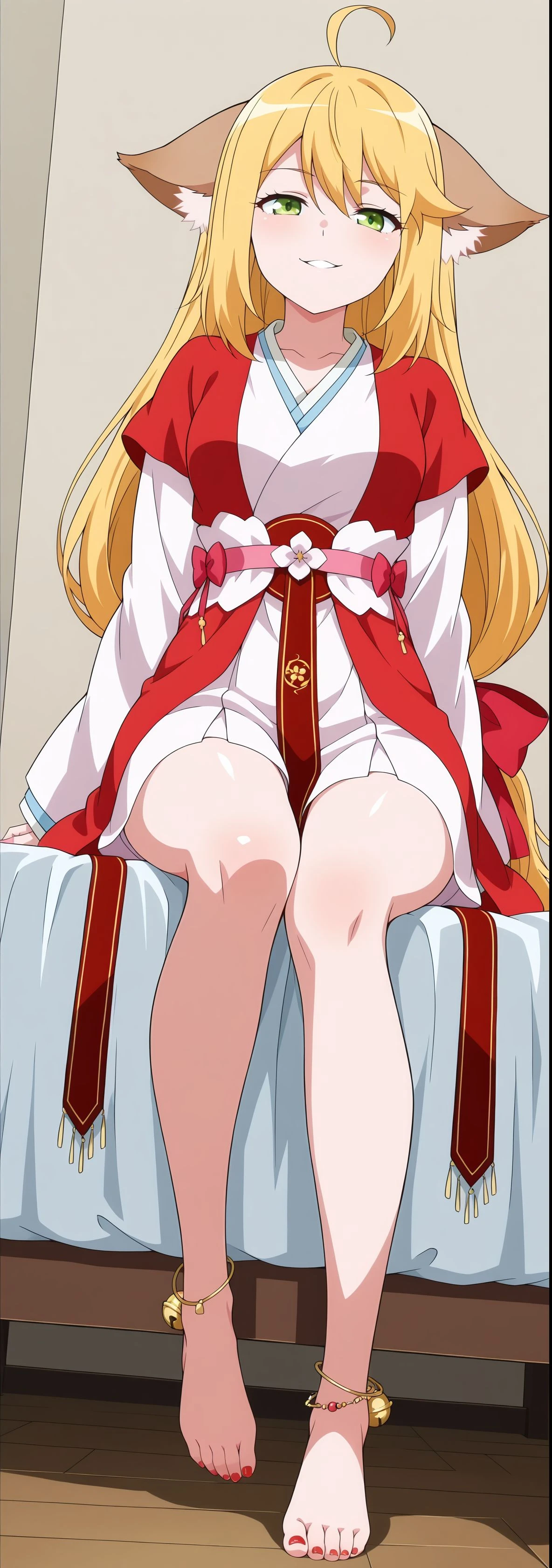 tushanhonghong,animal ears, long hair, blond hair, ahoge, hair ribbon, kimono, hanfu, hanfu underneath,red and white clothing, tie waist, tie, bow, foot, bell, anklet,