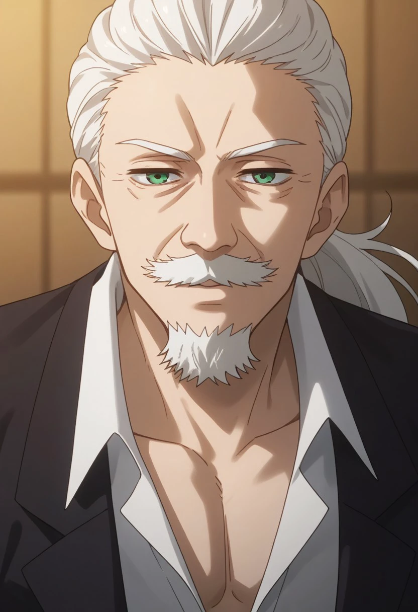 Ban Yozakura, solo, male focus, old man, old, green eyes, 1 boy, hair tied in a ponytail, long hair, white hair, green eyes, looking at viewer, beard, mustache,