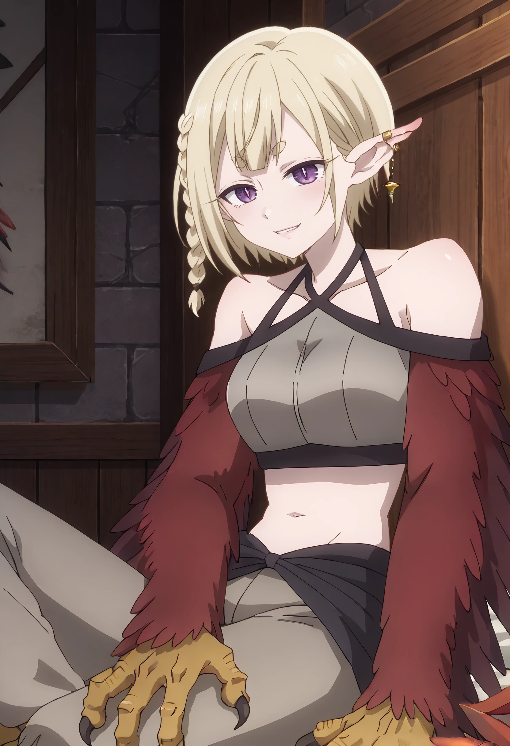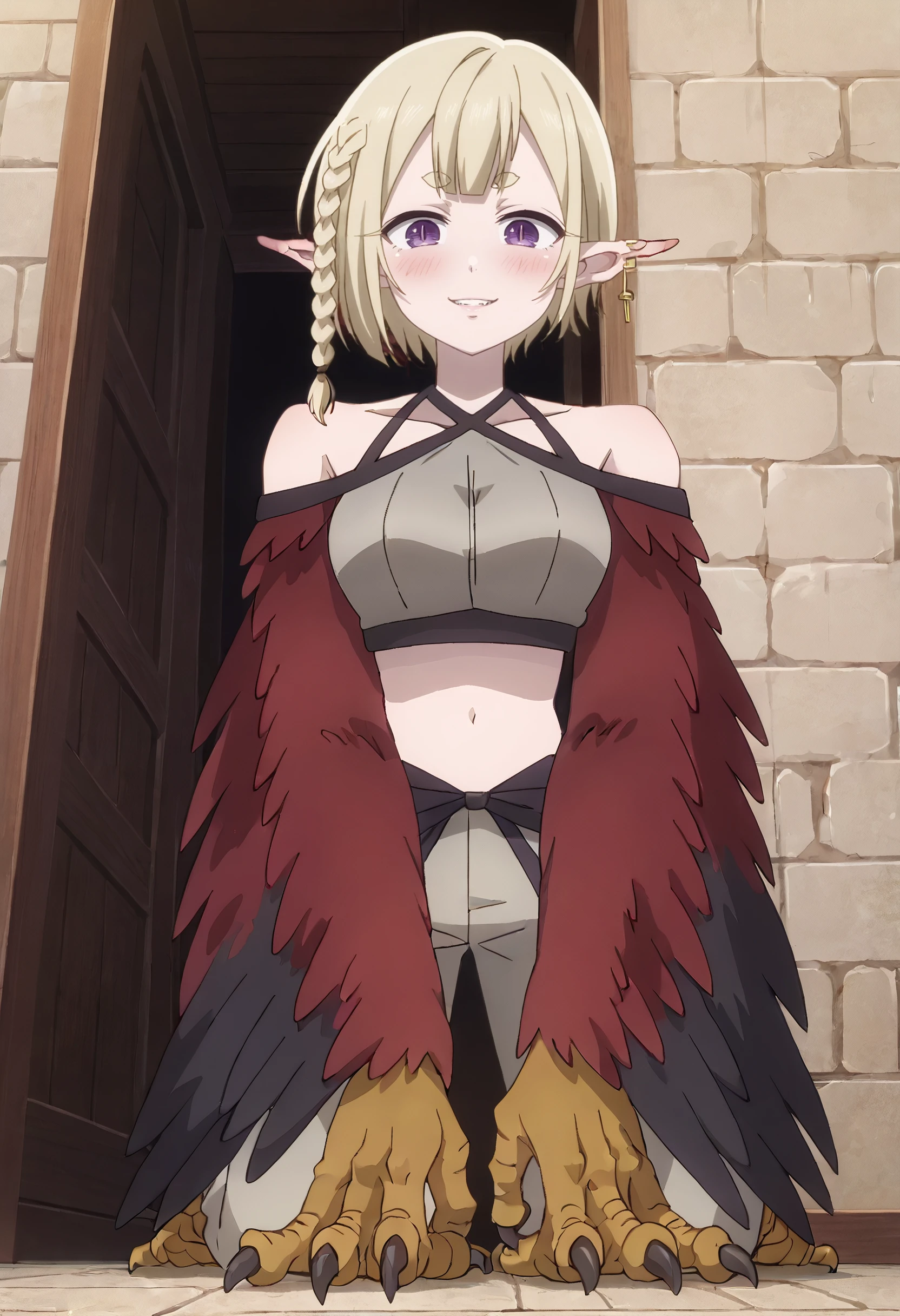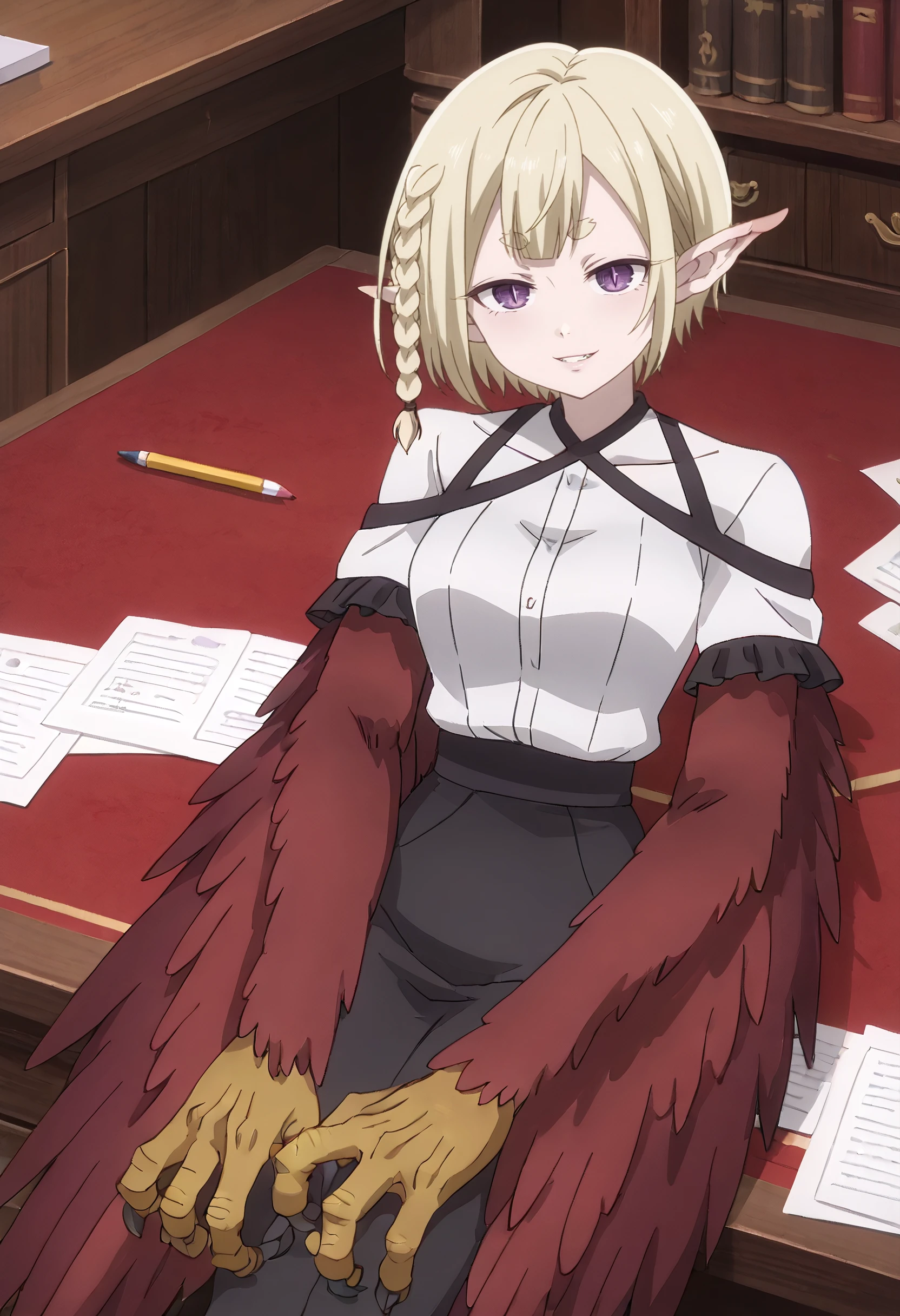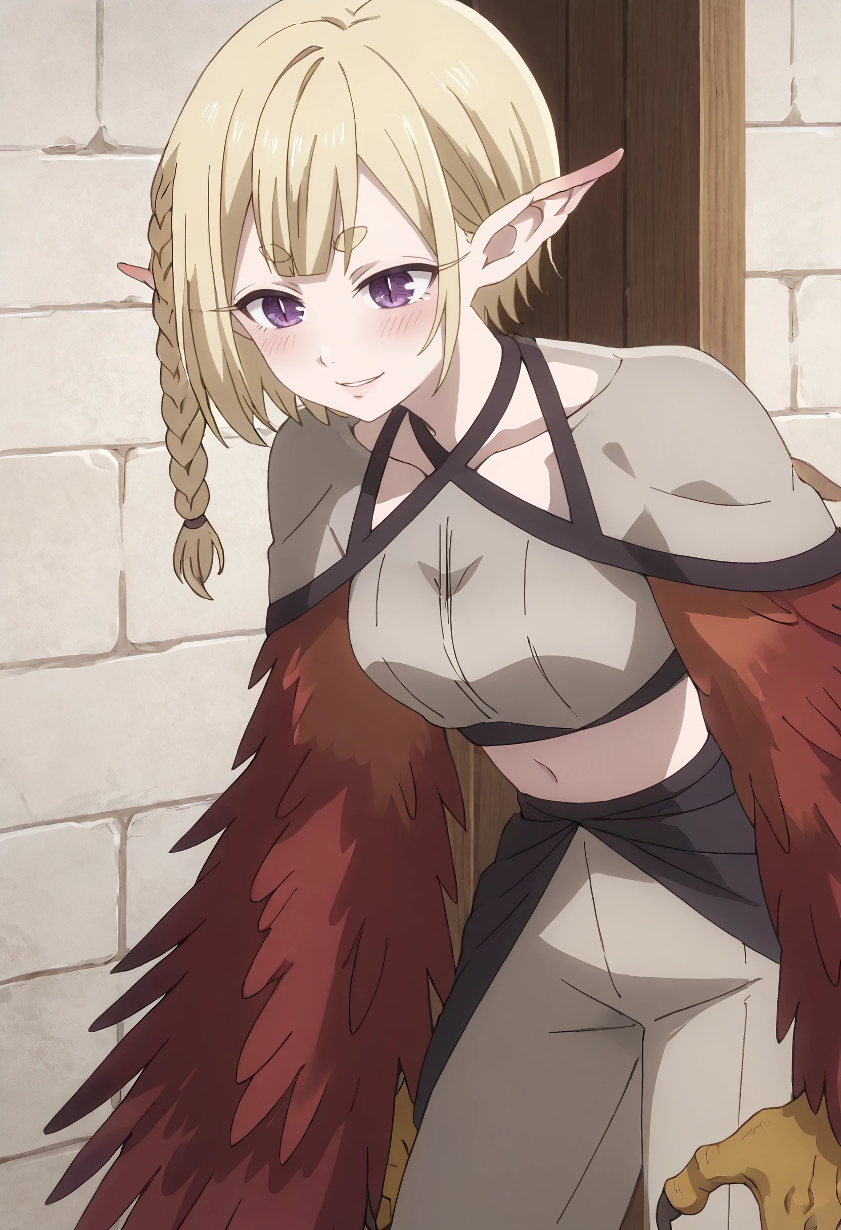 KYTHapi, blonde hair, pointy ears, short hair, braid, thick eyebrows, short eyebrows, single braid, side braid, monster girl, purple eyes, slit pupils, harpy, winged arms, talons, wings, feathers, bird legs, feathered wings, red feathers, claws, animal hands, bird ears,