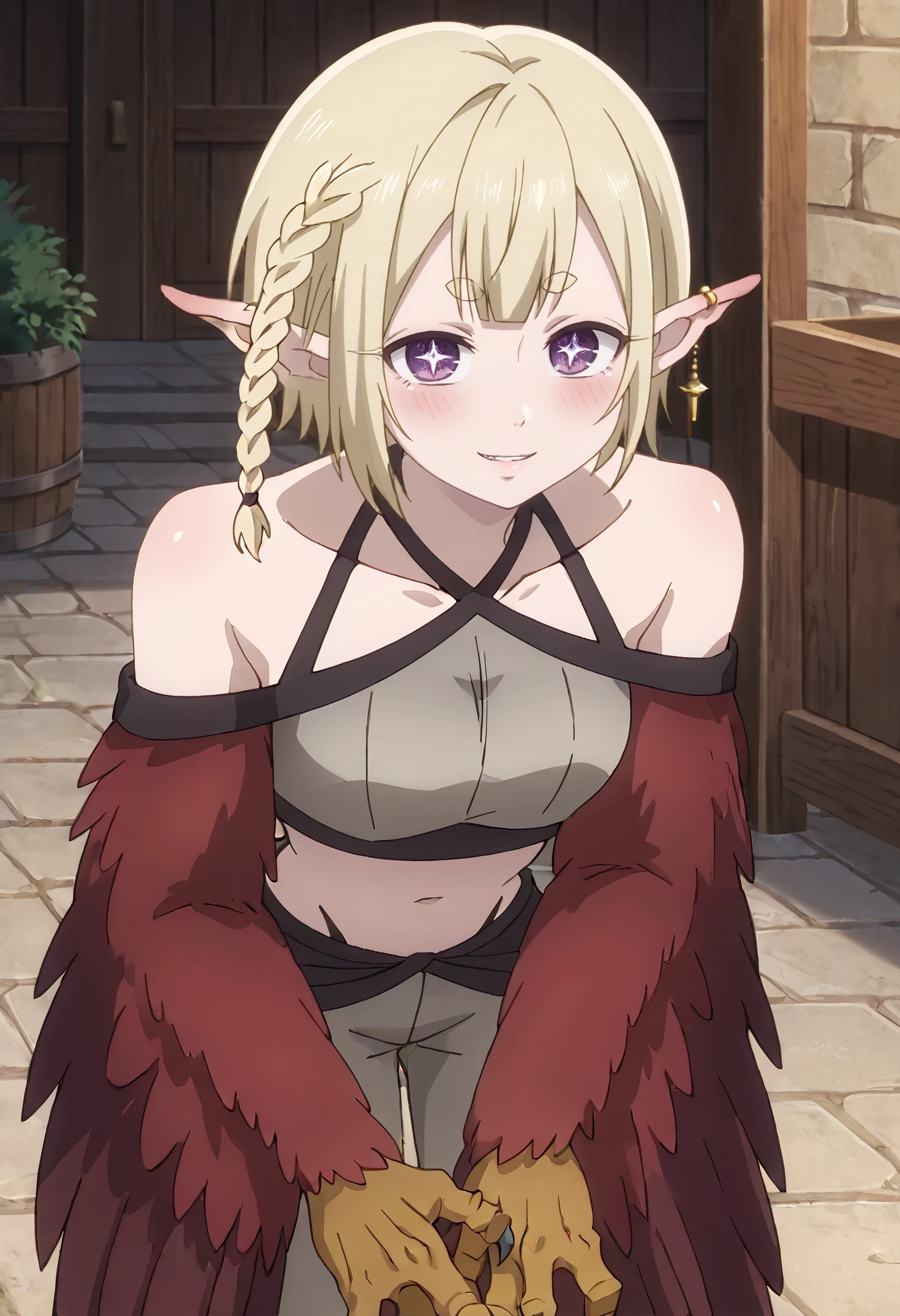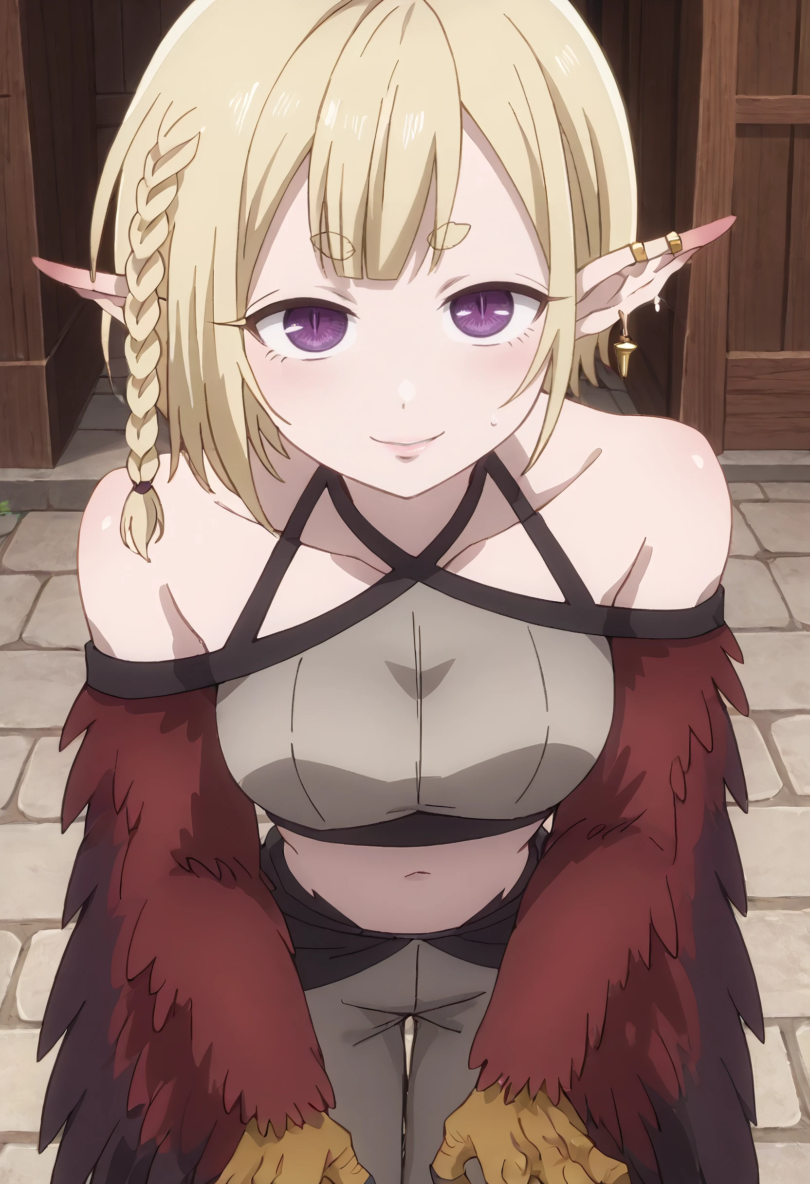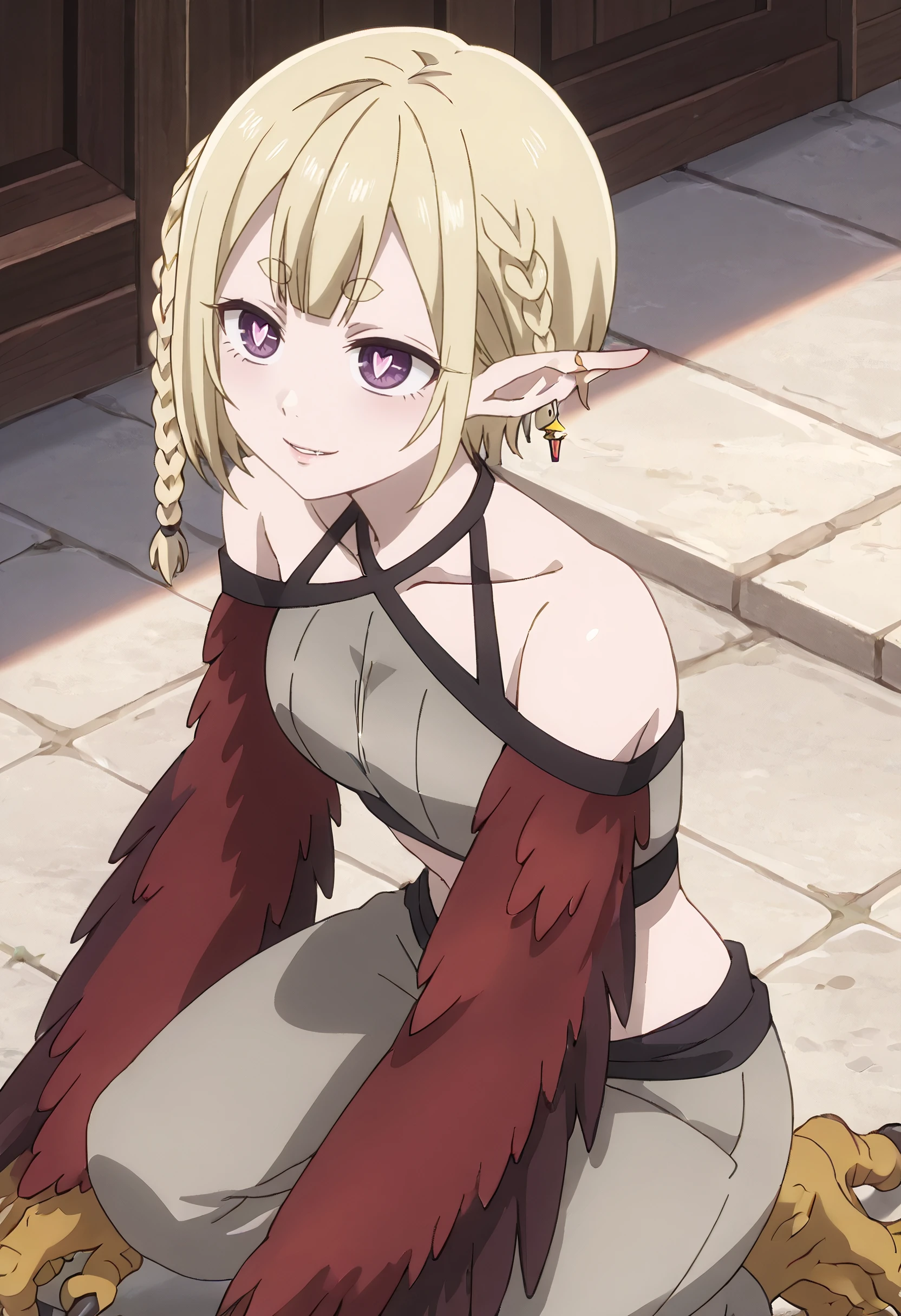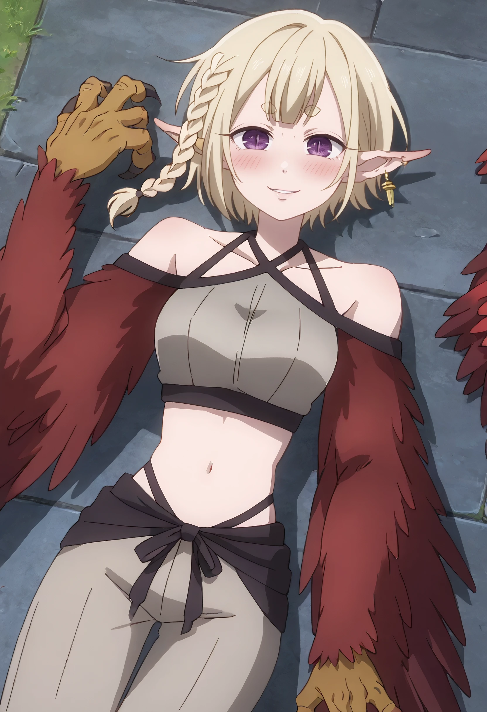 KYTHapi, blonde hair, pointy ears, short hair, braid, thick eyebrows, short eyebrows, single braid, side braid, monster girl, purple eyes, slit pupils, harpy, winged arms, talons, wings, feathers, bird legs, feathered wings, red feathers, claws, animal hands, bird ears,