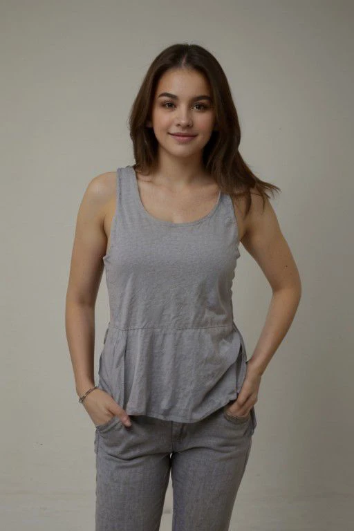 Training Word zoe crop linen brown midi skirt, high waist skirt with pocket, fall spring, grey tank top, smile, white vest, white tight trouser, grey blazer, satin pajamas soft polyester sleep, jeans, blazer, medium shoot, if one of the training word use , it will change the background into a dirty seamless background use weight below 0.6 so that the background will follow the prompt