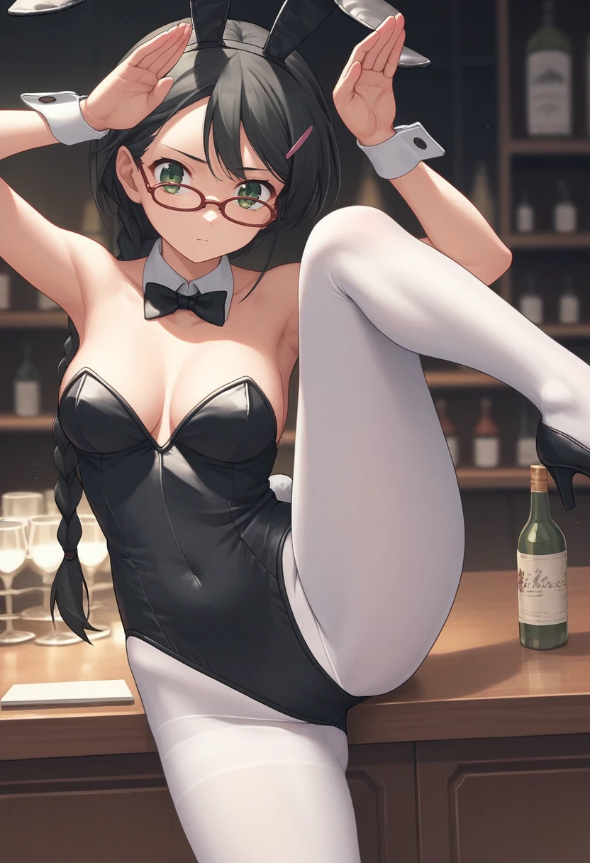 hazukishino, green eyes, black hair, hairclip braid, glasses, nurse, nurse cap, nametag, white pantyhose