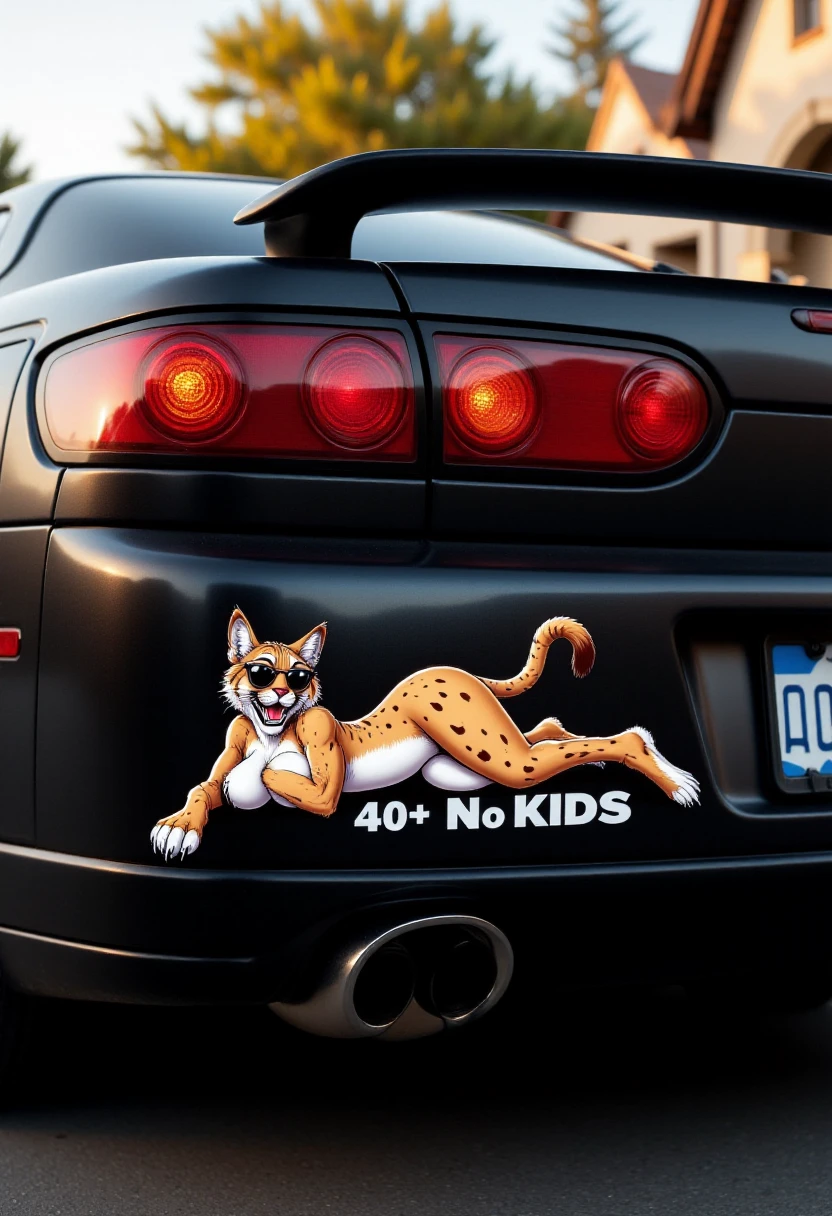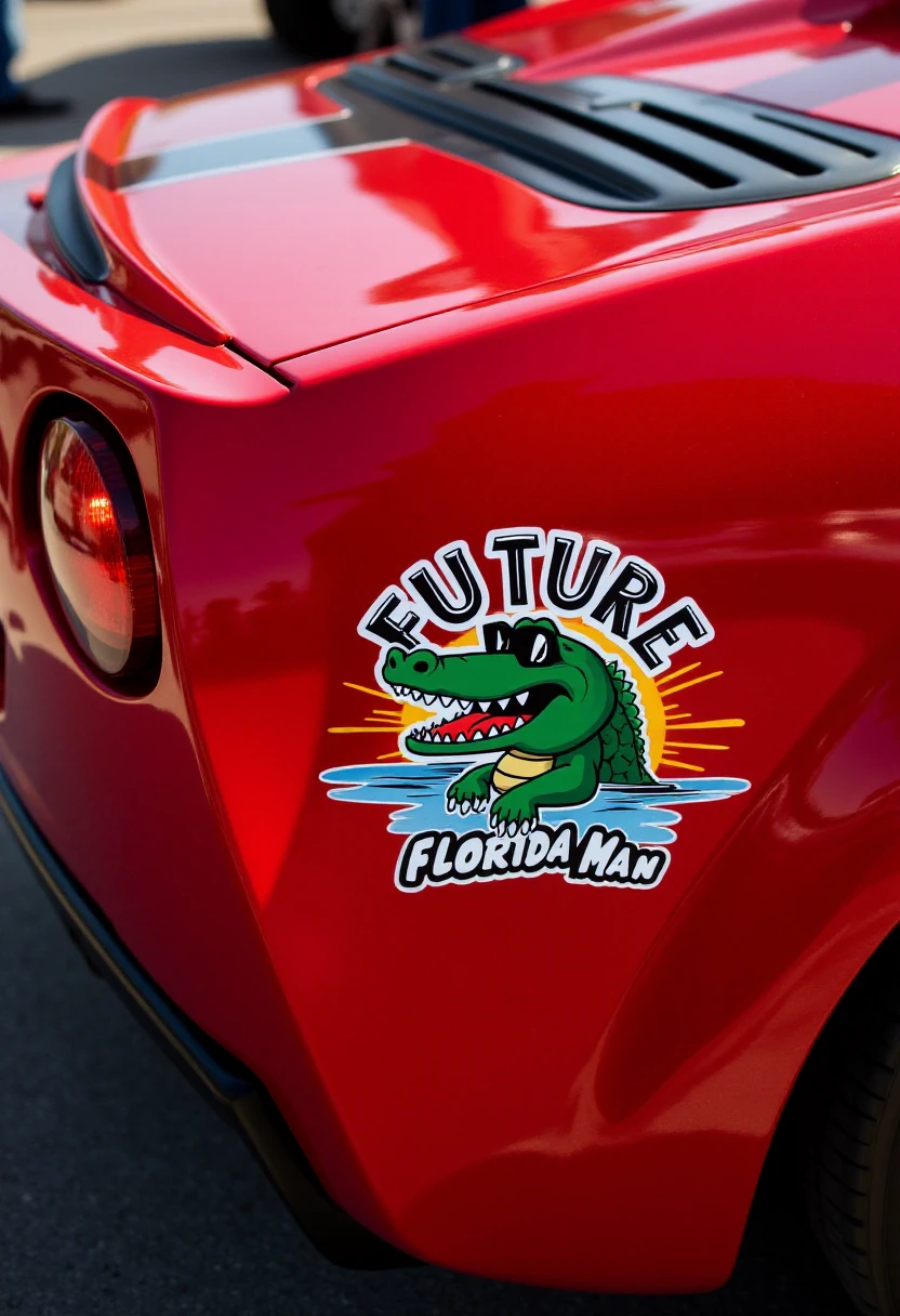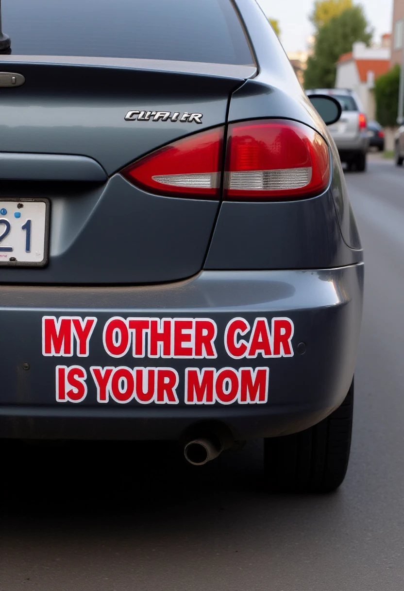The car's rear bumper prominently displays a sticker with bold text. The text reads "(TEXT)" in large, (SUBJECT), bold letters.