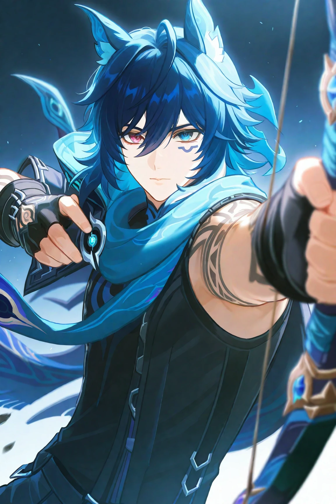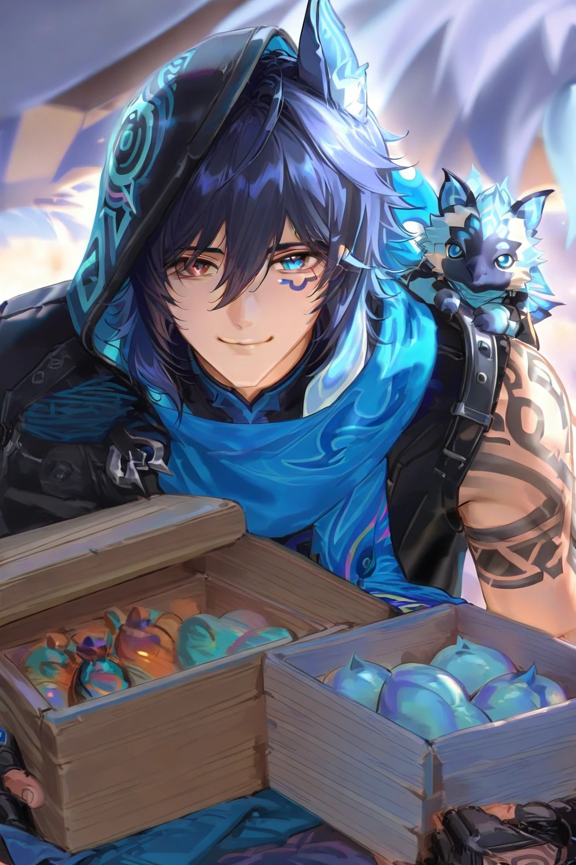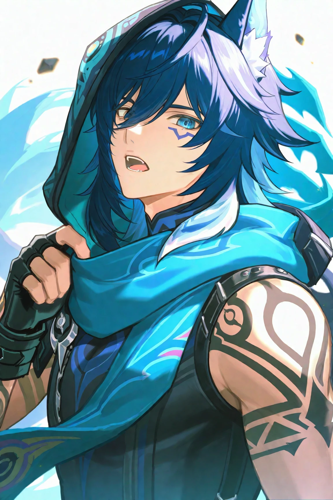 ororon \(genshin impact\), heterochromia, gloves, 1boy, hood, fingerless gloves, wolf, pants, animal ears, male focus, torn clothes, tattoo, hood, black gloves, arm tattoo, scarf, jacket, shirt,