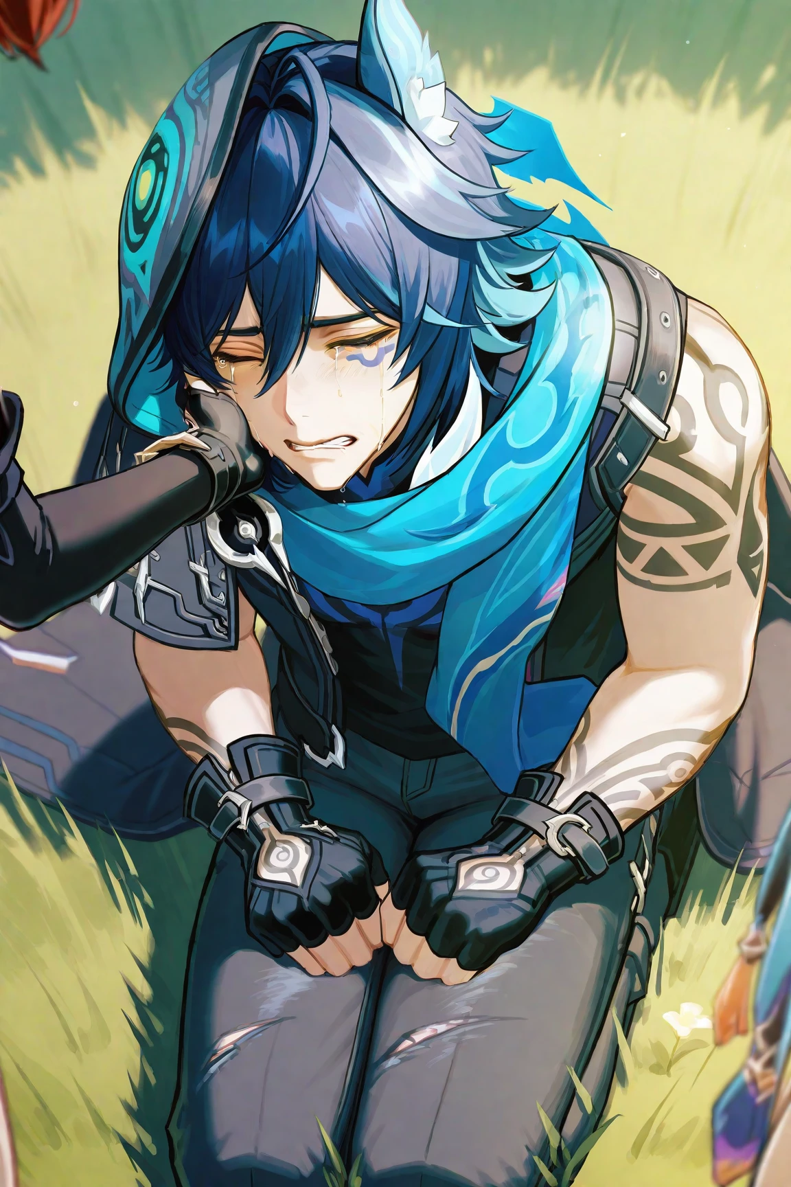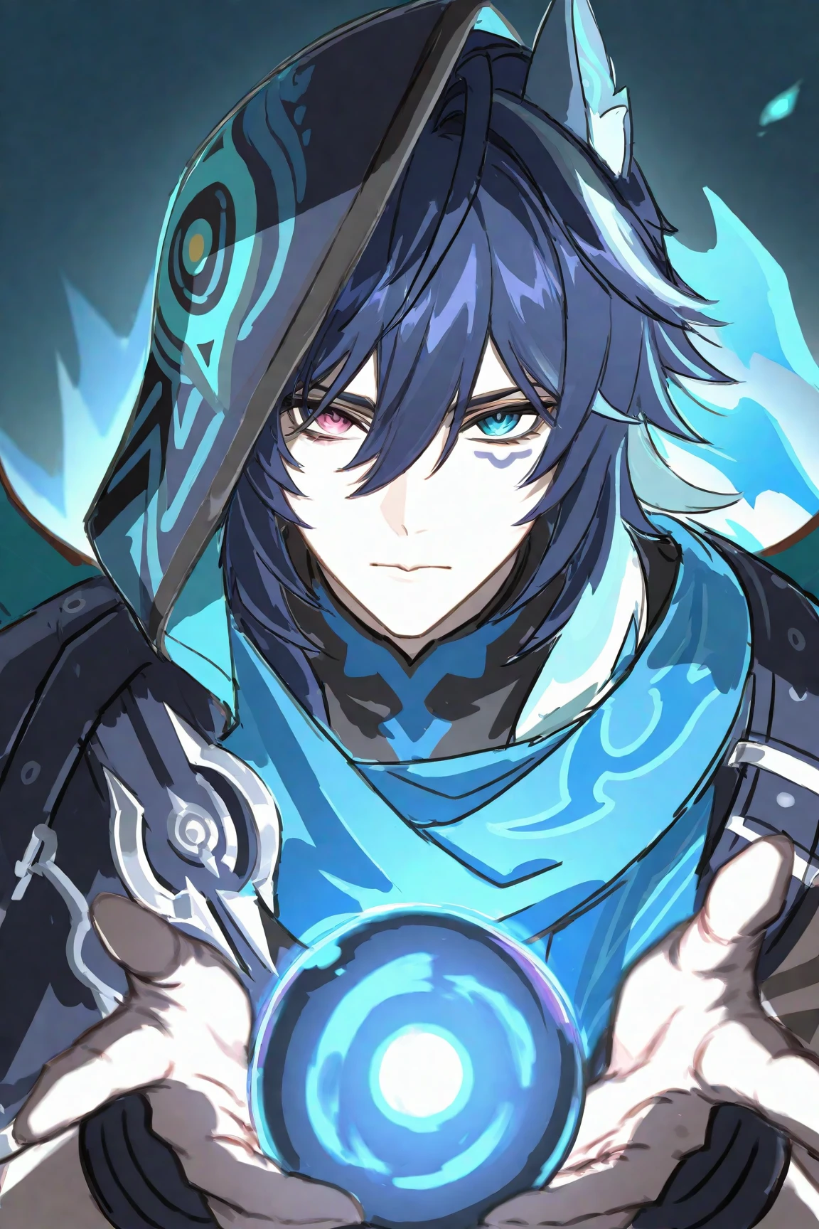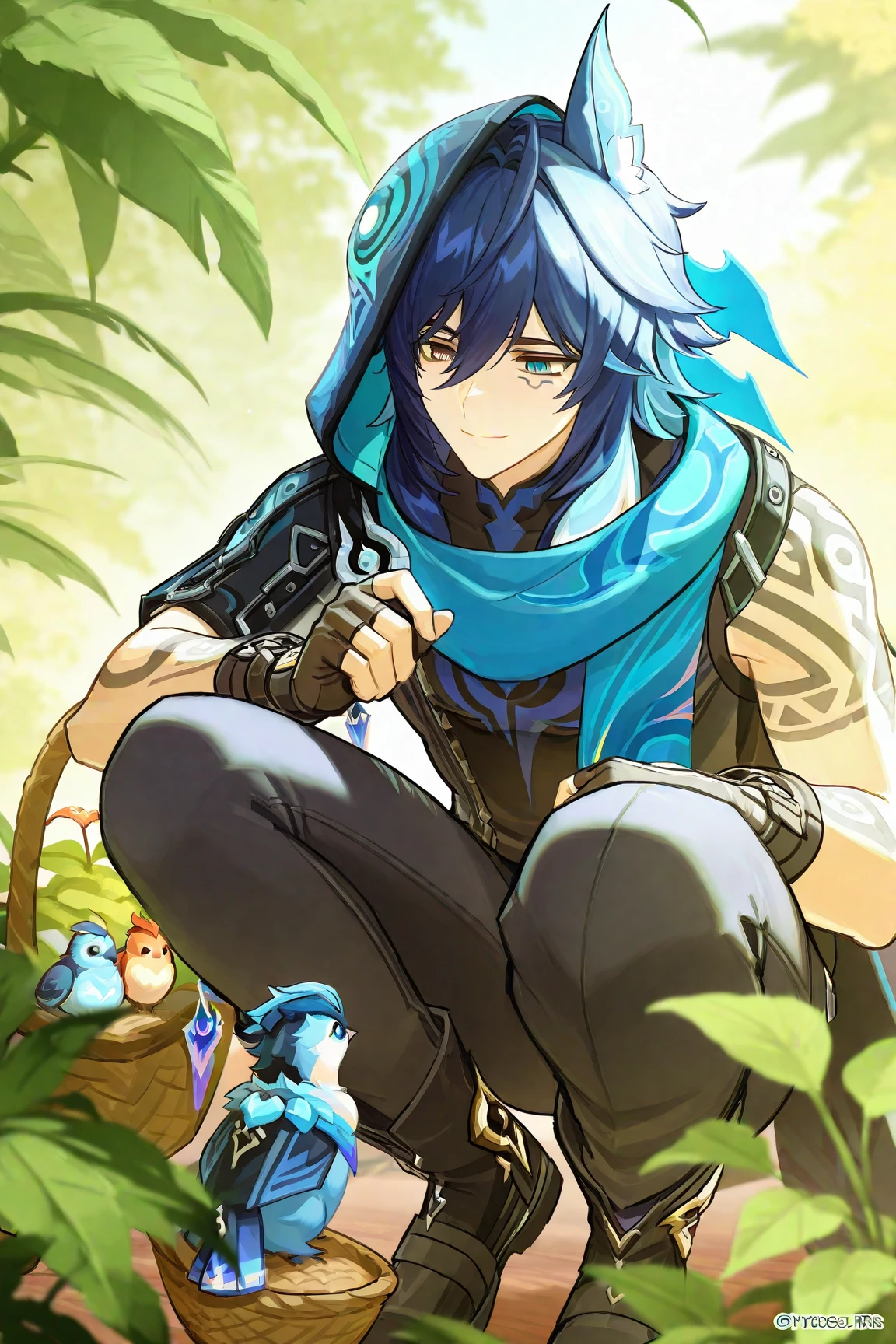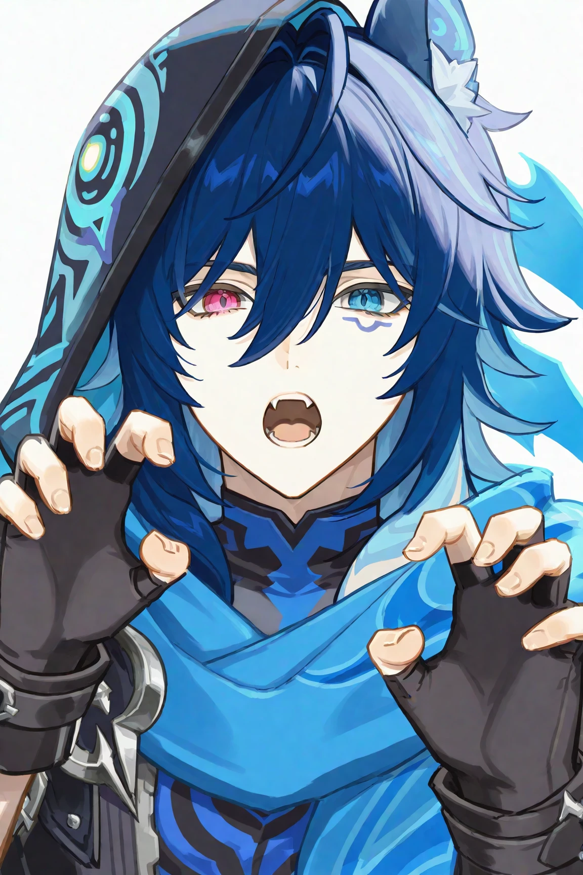 ororon \(genshin impact\), heterochromia, gloves, 1boy, hood, fingerless gloves, wolf, pants, animal ears, male focus, torn clothes, tattoo, hood, black gloves, arm tattoo, scarf, jacket, shirt,