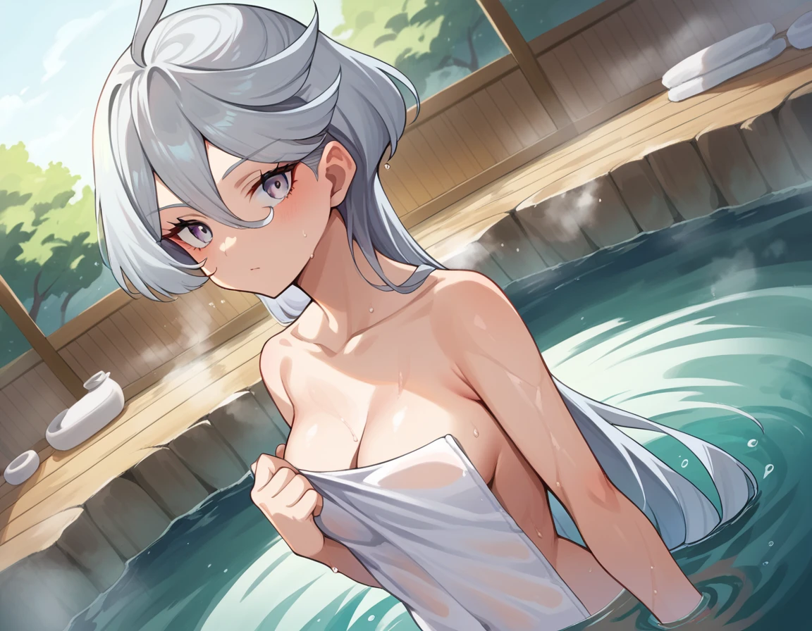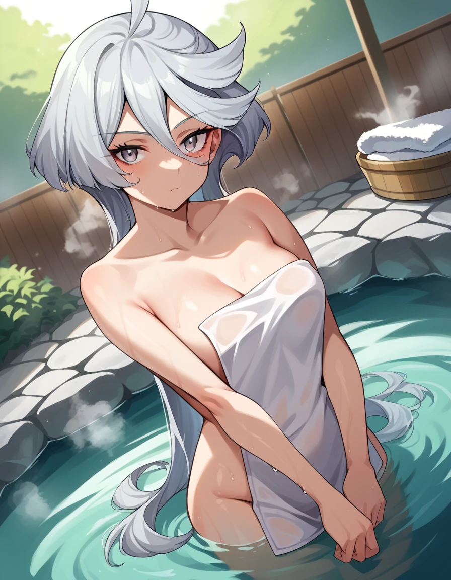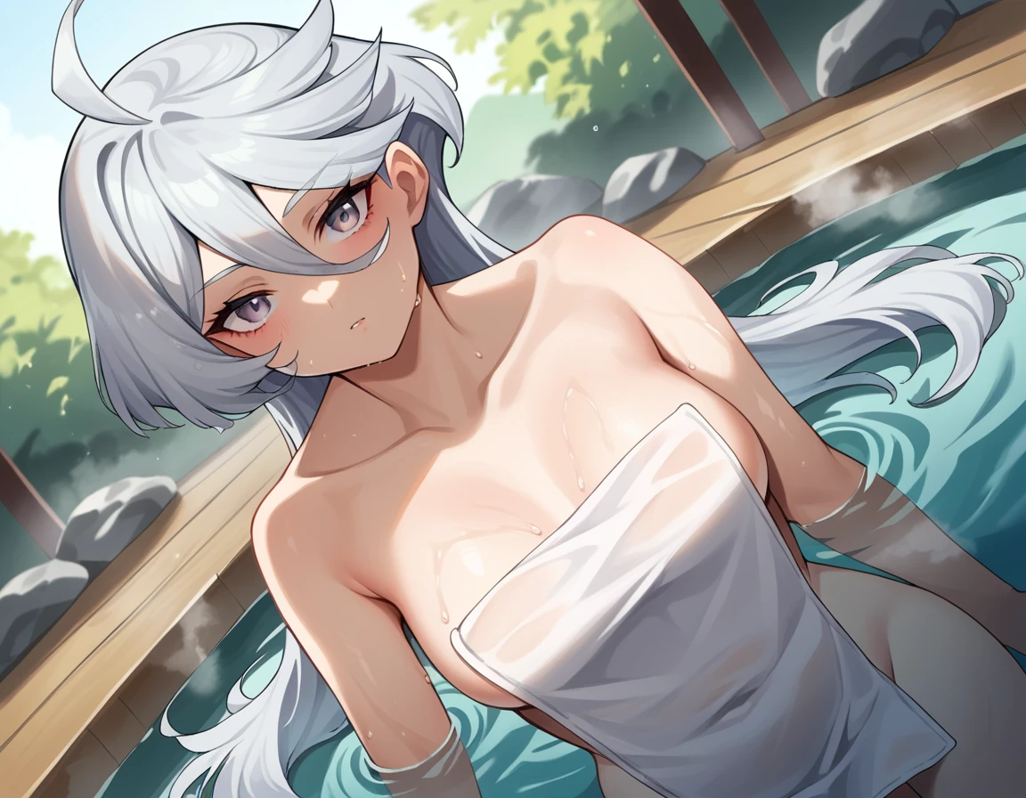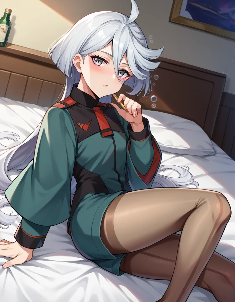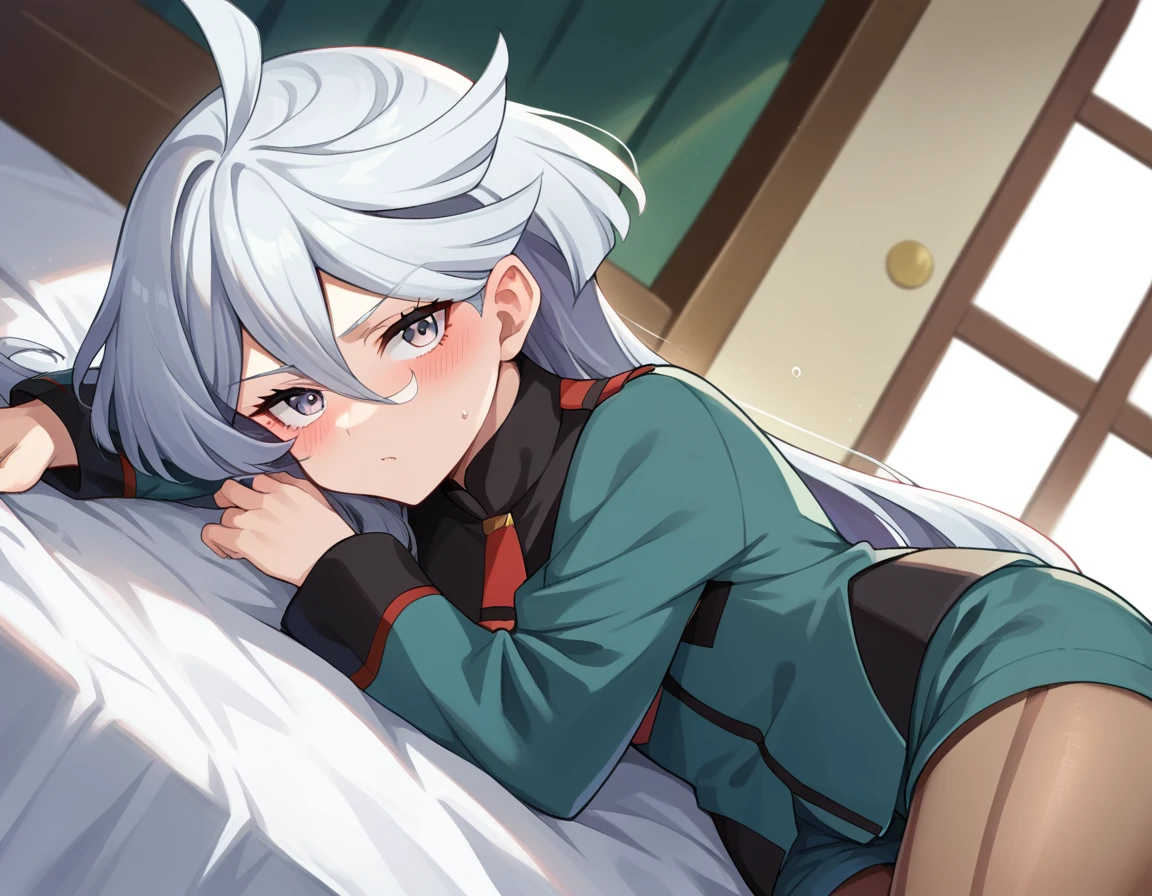 miorine rembran, ahoge, grey eyes, grey hair, hair between eyes, long hair, swept bangs,