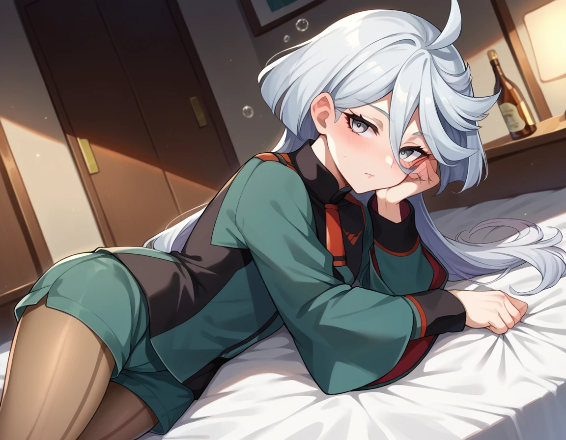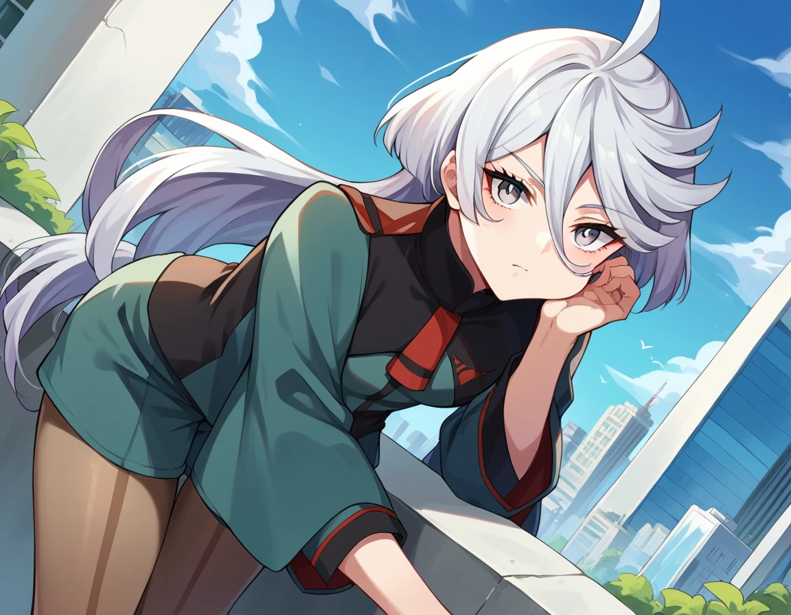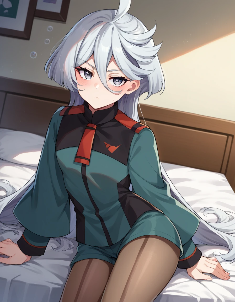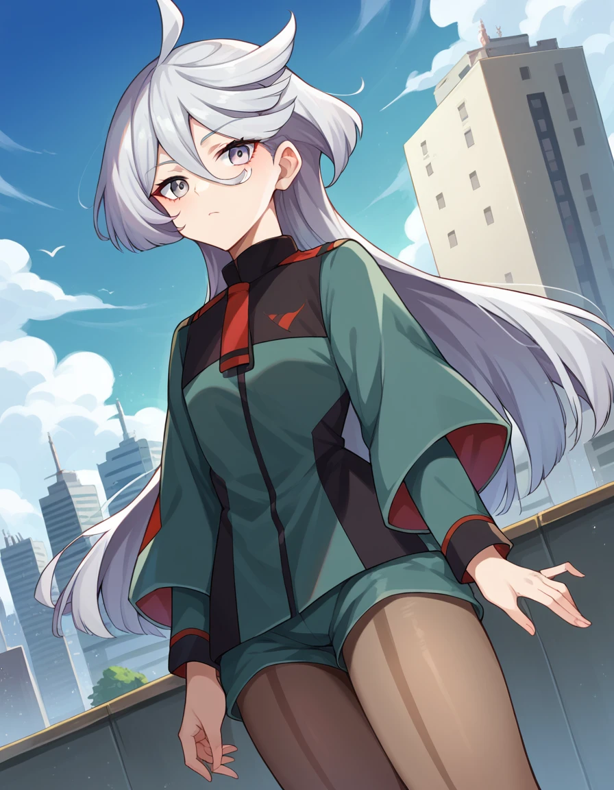 asticassia school uniform, front-seamed legwear, green jacket, green shorts, jacket, long sleeves, pantyhose, pantyhose under shorts, school uniform, seamed legwear, shorts, shoulder boards, swept bangs, wide sleeves,