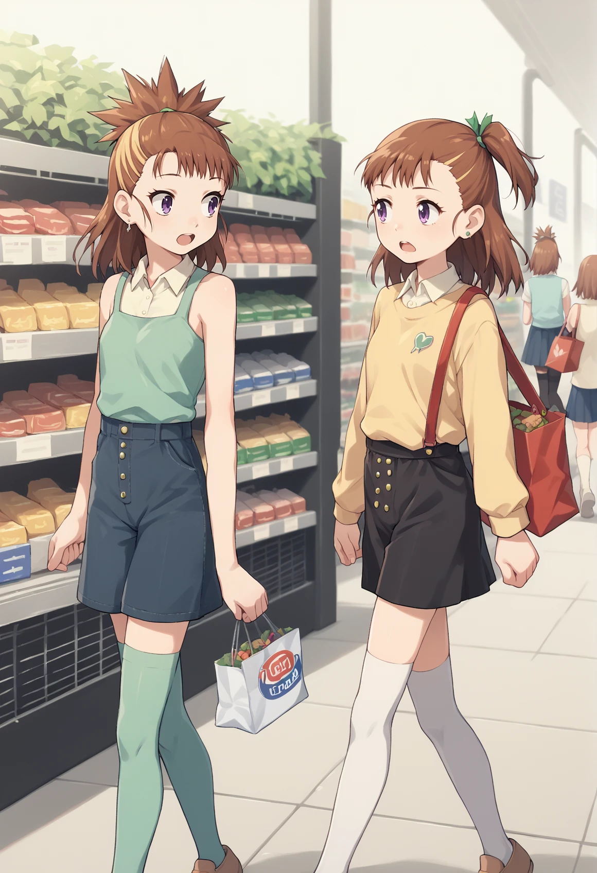 JURI juri, long hair, brown hair, one_side_up, brown eyes, two-tone dress, green dress, short sleeves, puppet, green footwear