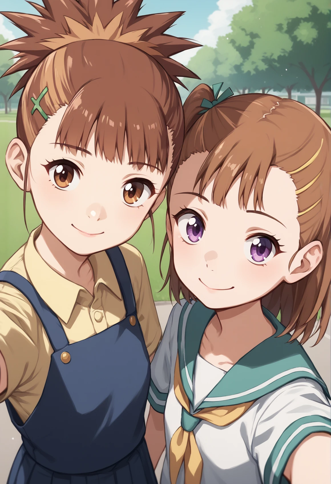 RIKA rika, Two-Tone Hair, multicolored hair, medium hair, blonde hair, brown hair, purple eyes, ponytail, wristband, Two-Tone Shirt, t-shirt, heart print, turtleneck, belt, jeans, Thigh Strap, red footwear