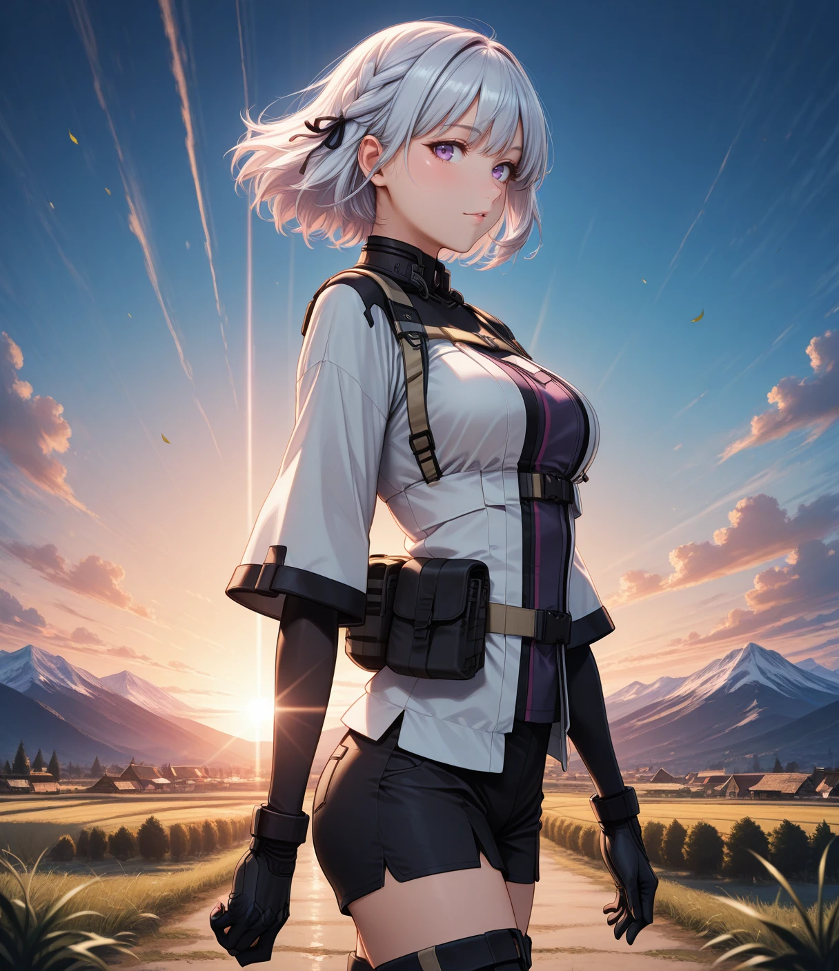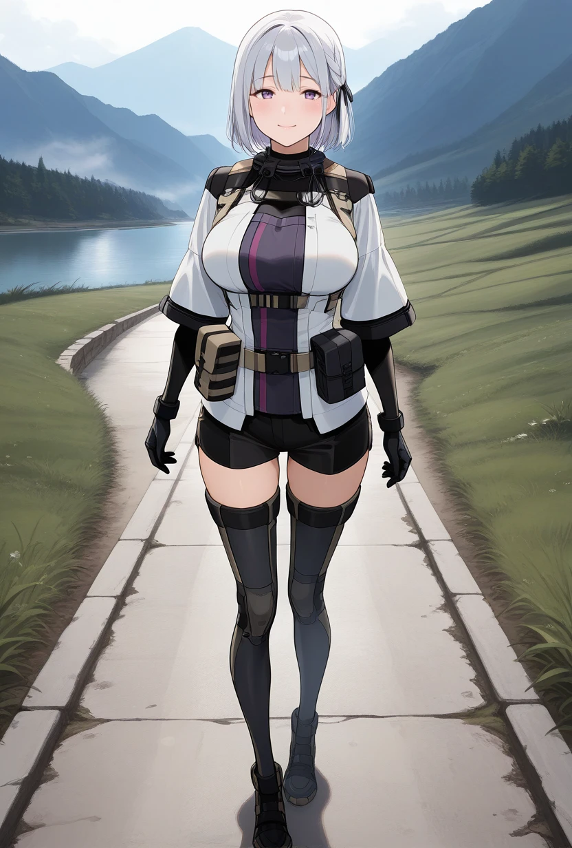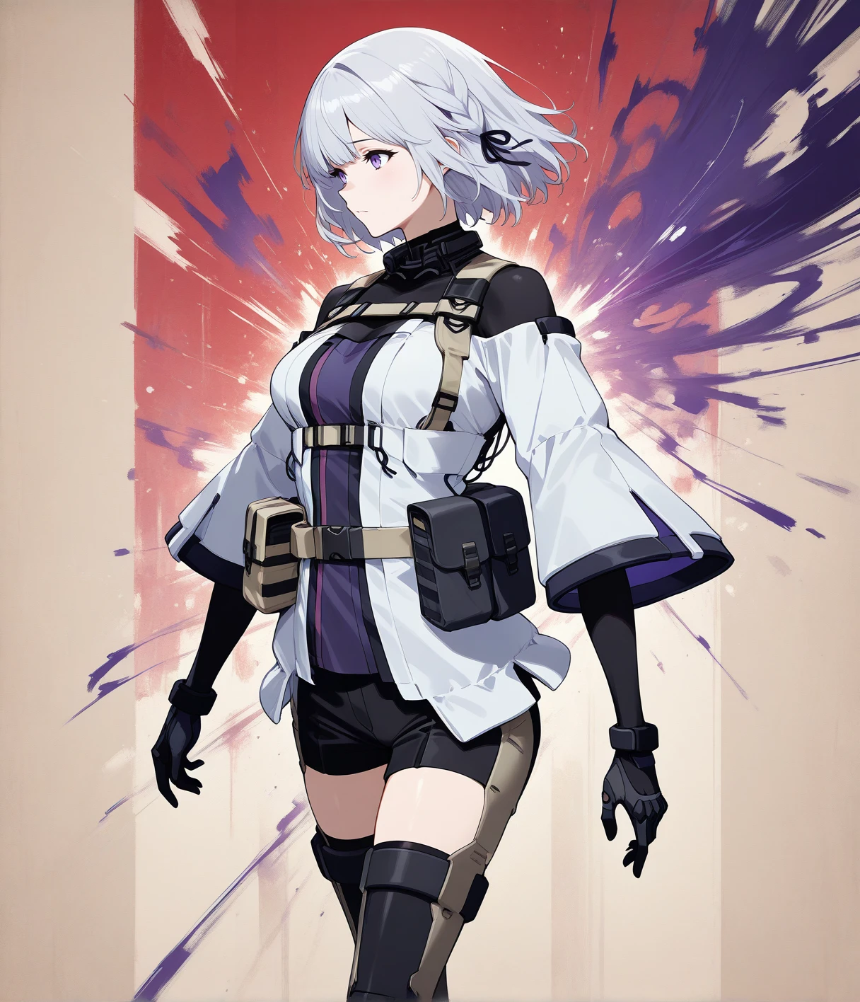 Outfit: military uniform, elbow gloves, black gloves, armored boots, black footwear, white jacket, tactical clothes, black shorts, partial bodysuit, thigh boots, chest harness, belt pouch