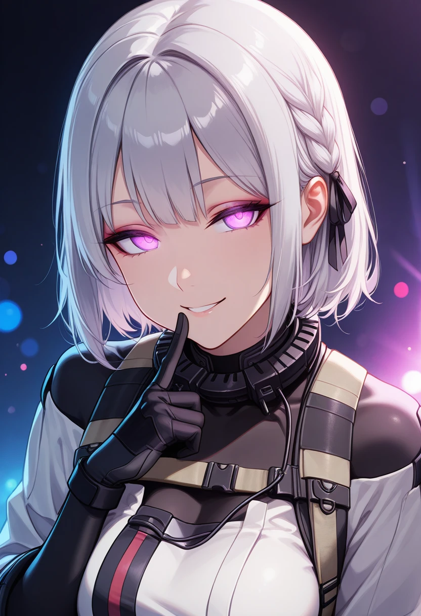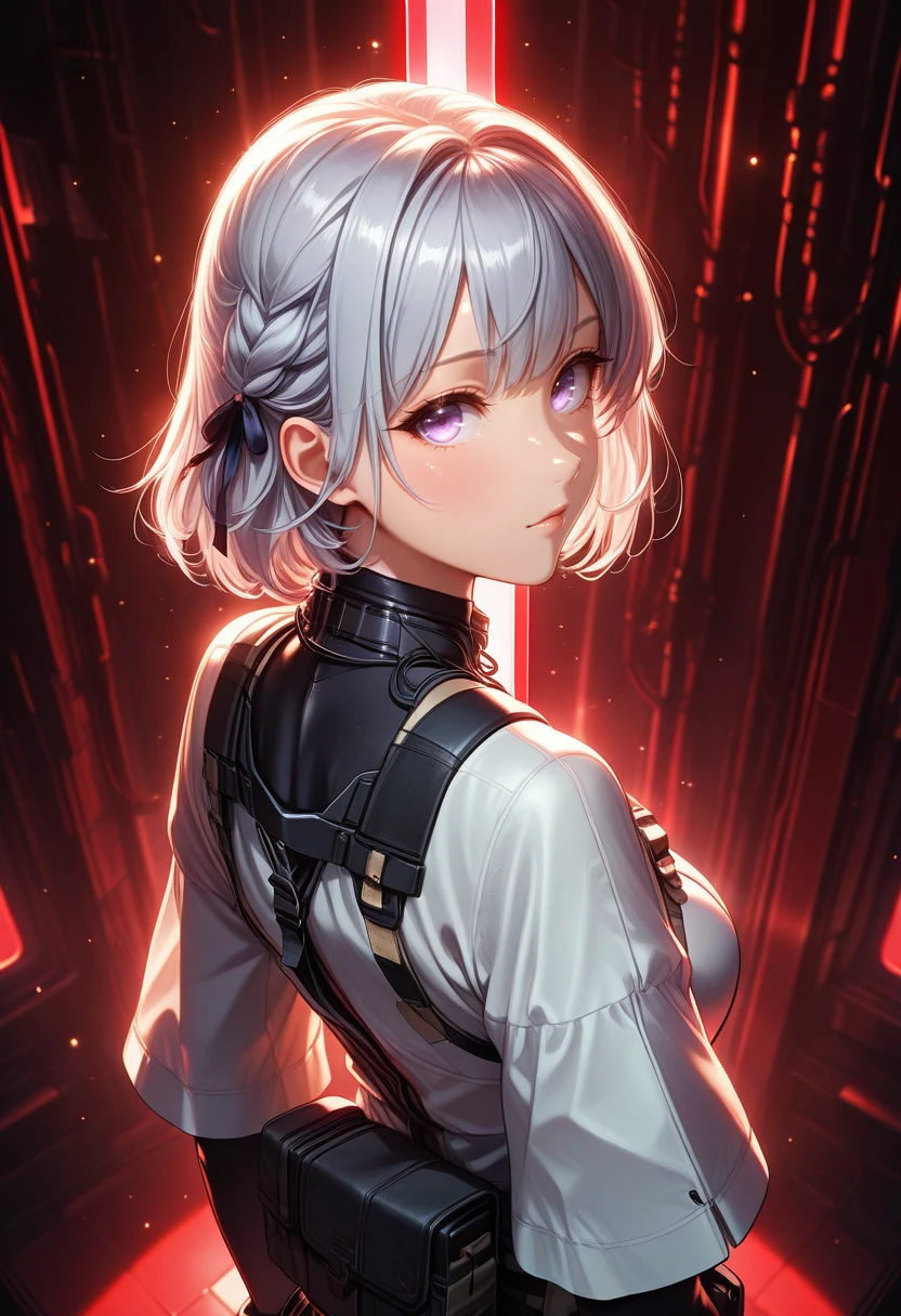Appearance: purple eyes, grey hair, short hair, hair ribbon, braid,