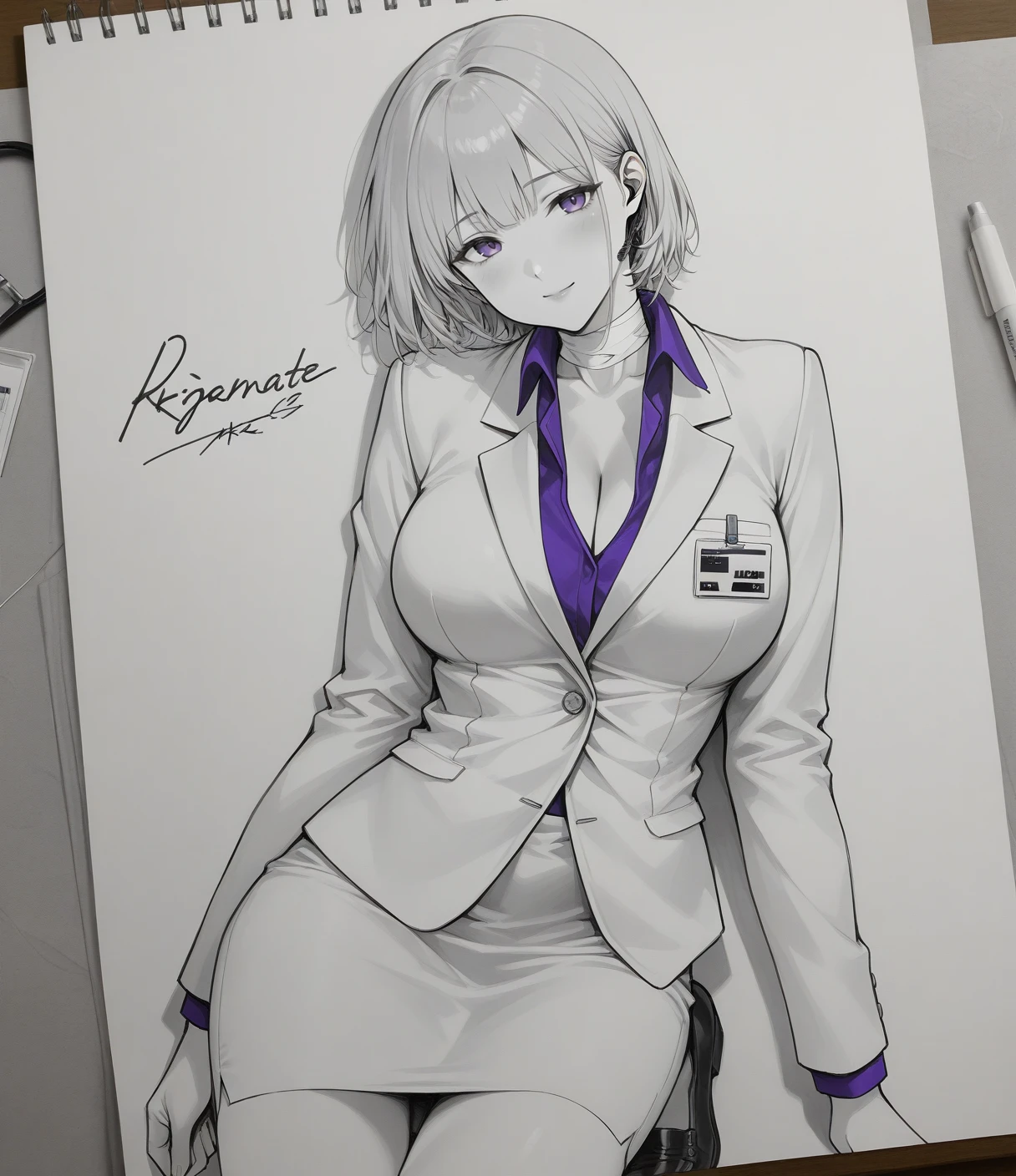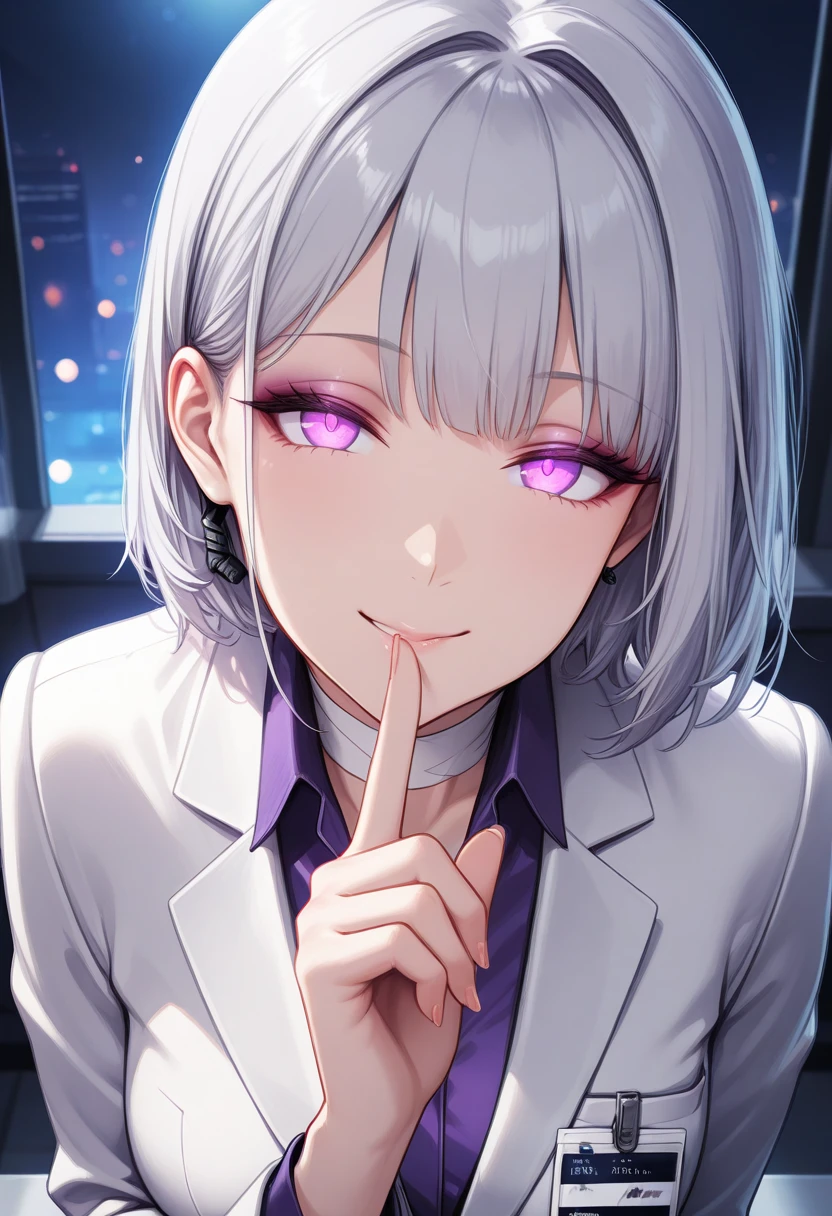 Outfit: white jacket, purple shirt, suit, business suit, id card, miniskirt, white skirt, pencil skirt, bare legs, black footwear, shoes, bandaged neck, earpiece