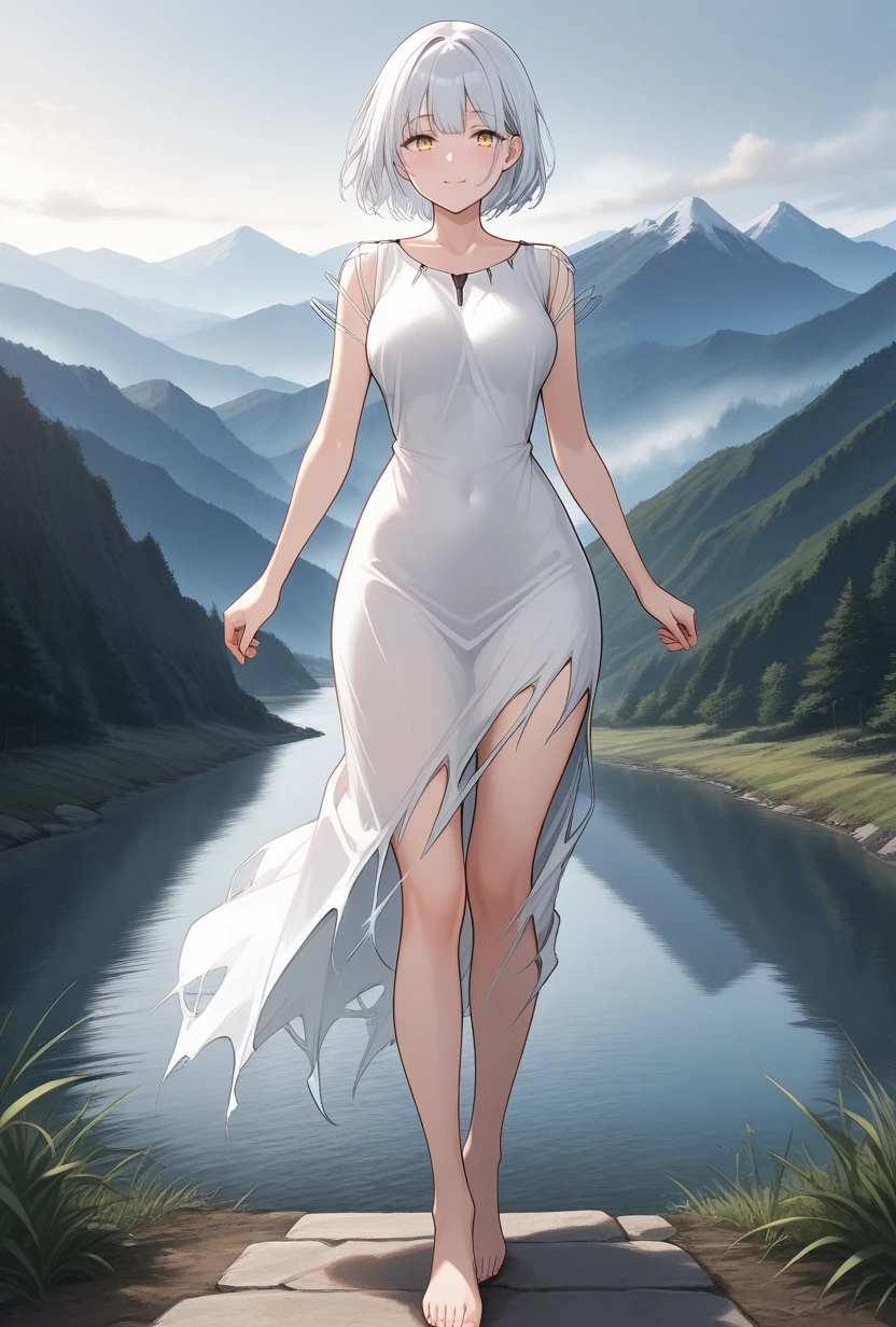Outfit: torn dress, white dress, bare legs, barefoot