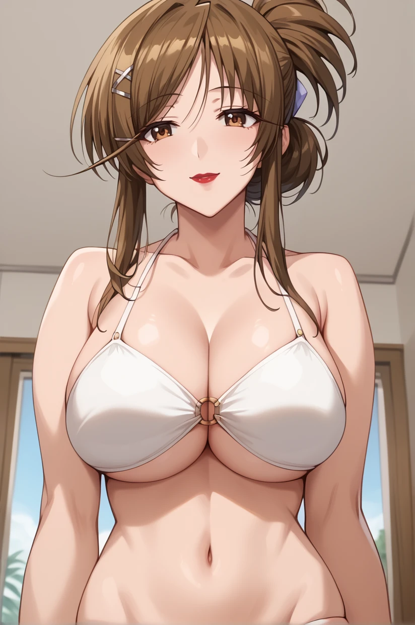 long hair, hair up, brown hair, hairclip, huge breasts, brown eyes, lipstickAttire