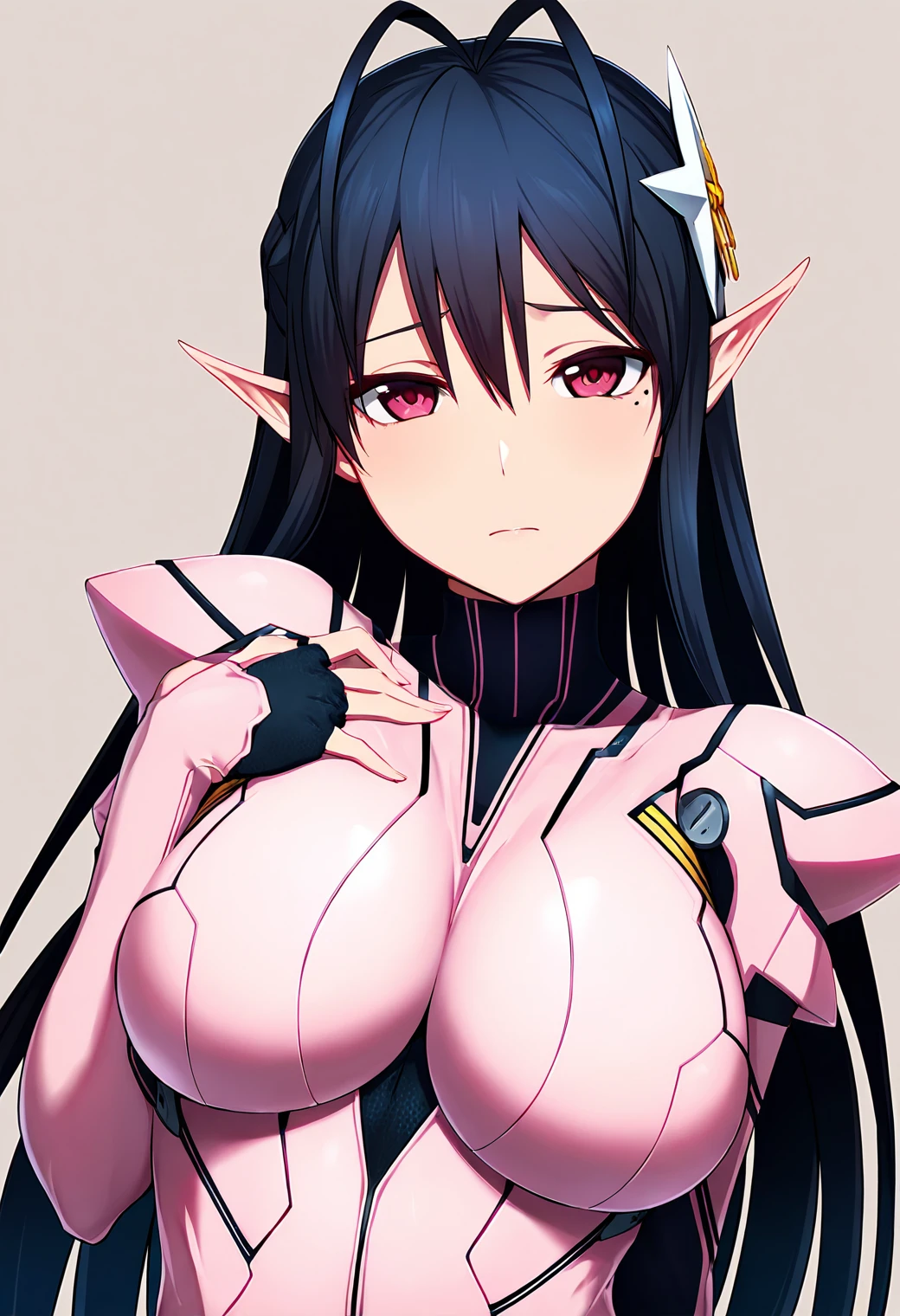 katoripso2,antenna hair,mole under eye,hair ornament,pink bodysuitDescription