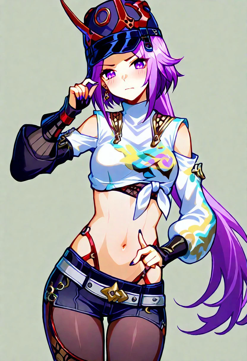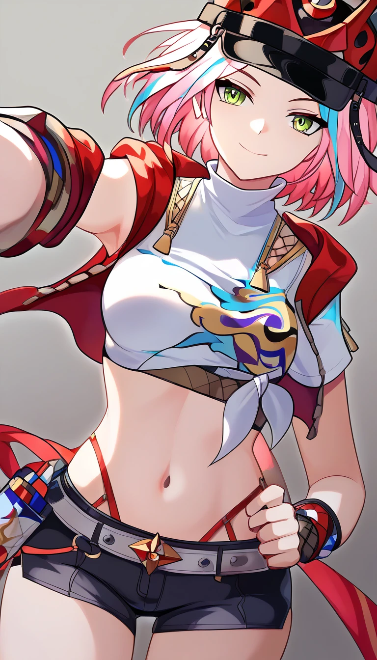 (best quality,8K, masterpiece ,simple flat background, clear background,none background:1.1),mihoyo,1girl,solo,pink hair,white shirt, short shorts,open jacket, open clothes,red jacket, short sleeves, streaked hair, helmet,tied shirt