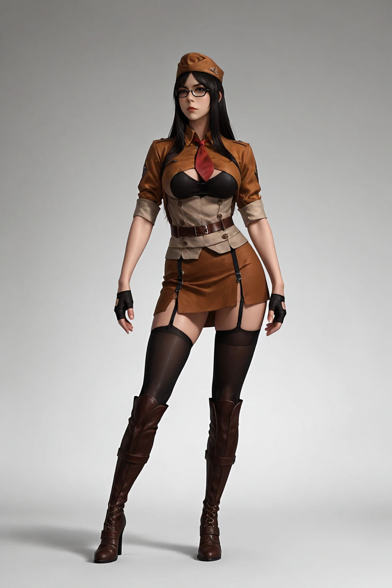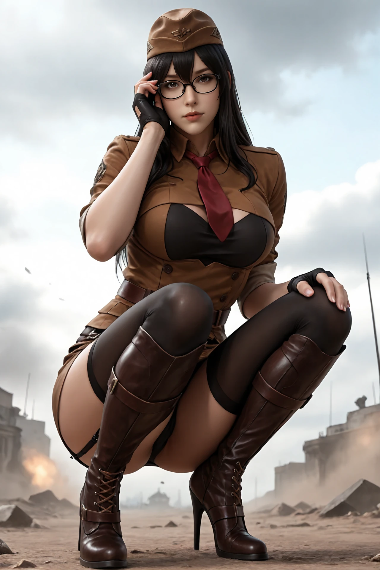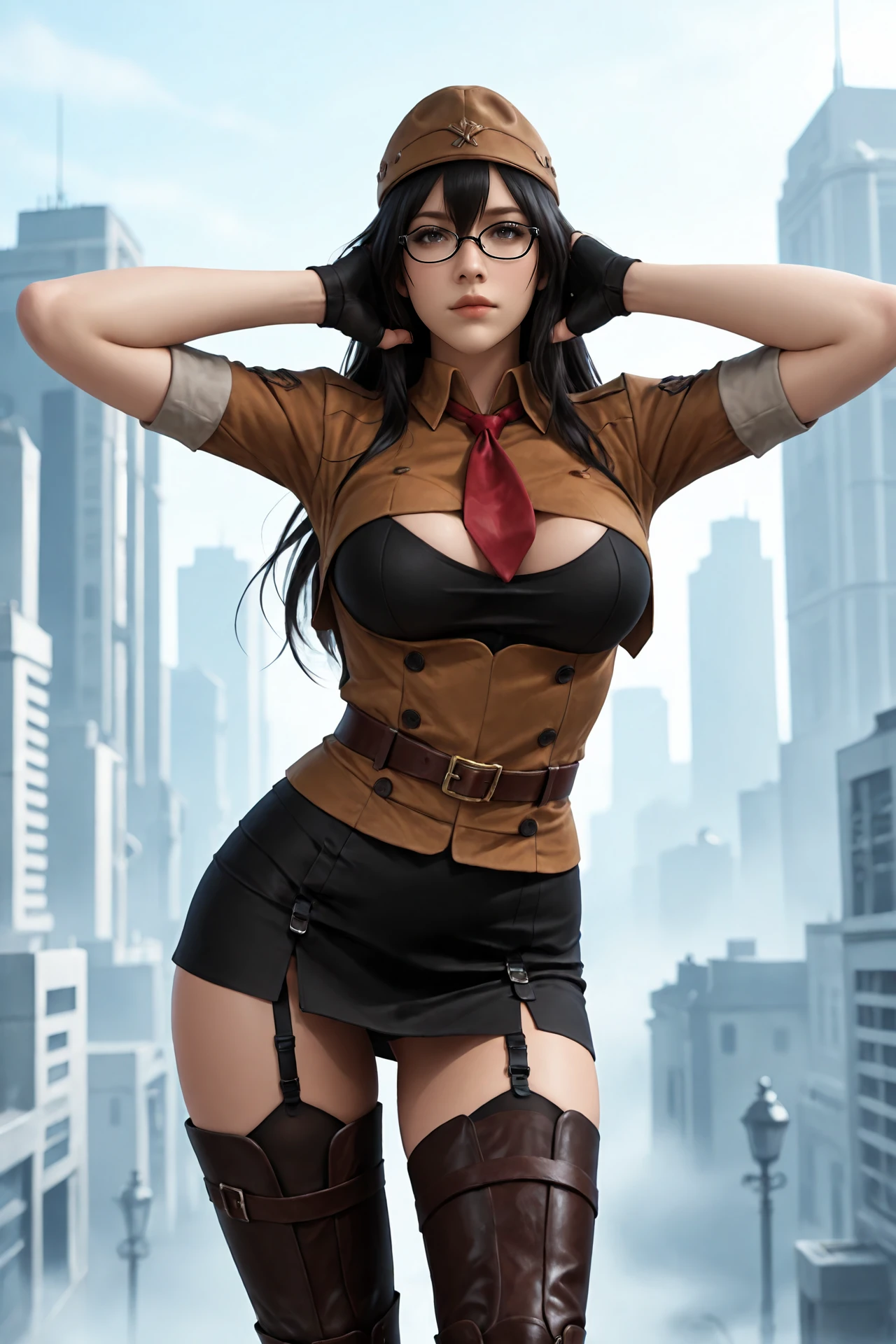 long_hair,black_hair,black-framed_eyewear,hat, large_breasts,necktie,buttons,high_collar, school_uniform,fingerless_gloves,skirt,belt,garter_belt,thighhighs, knee_boots,high_heels,