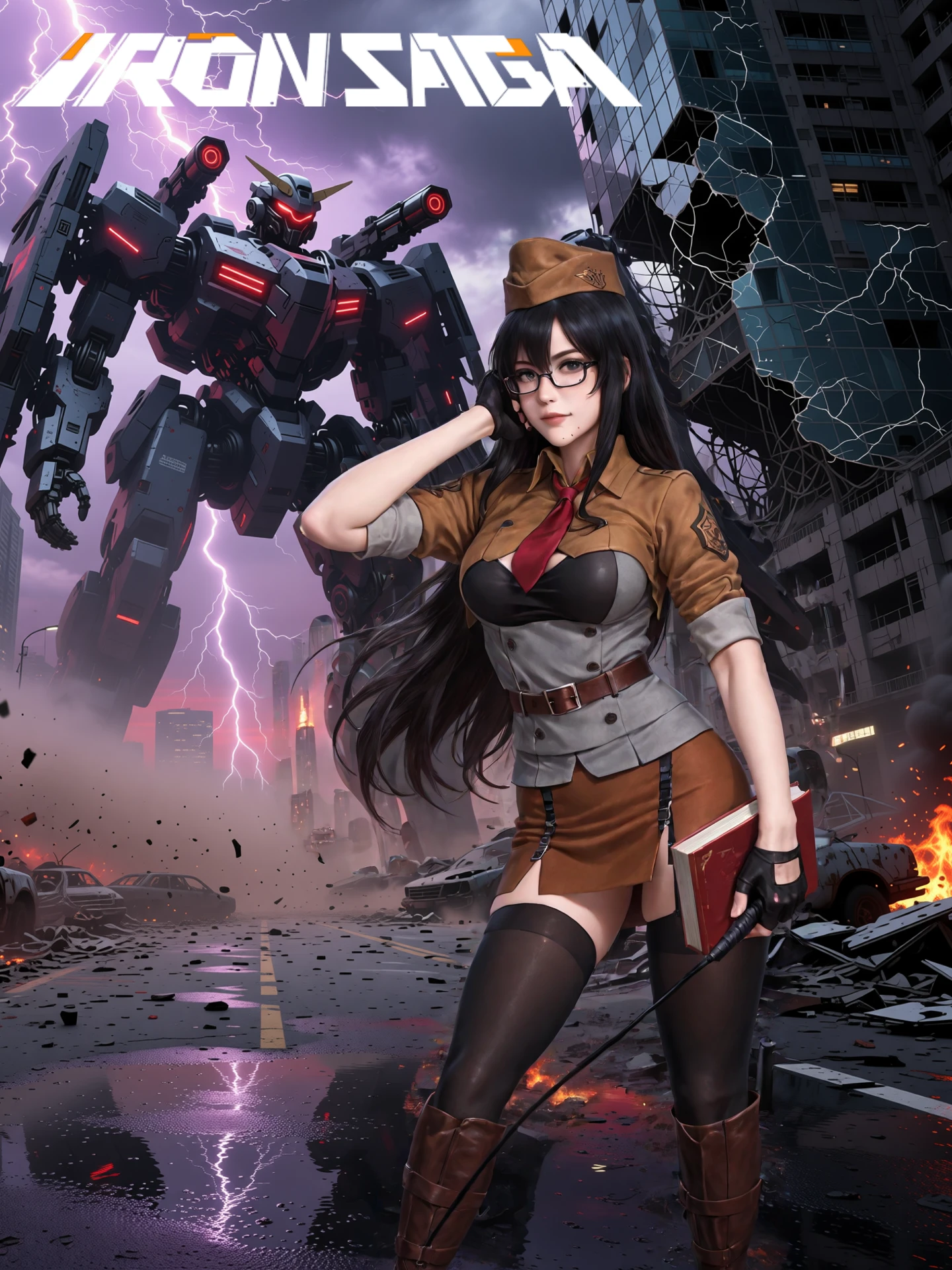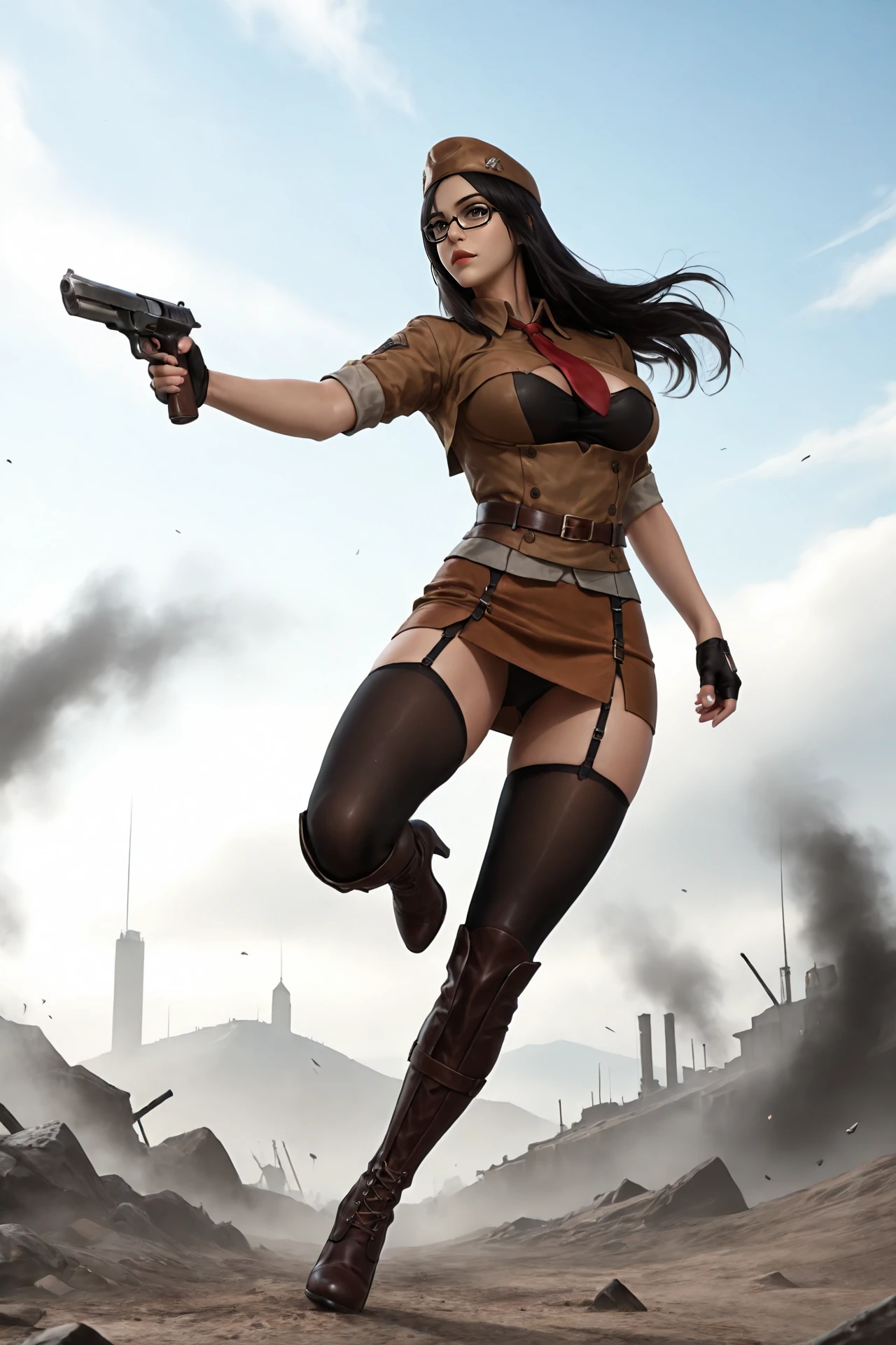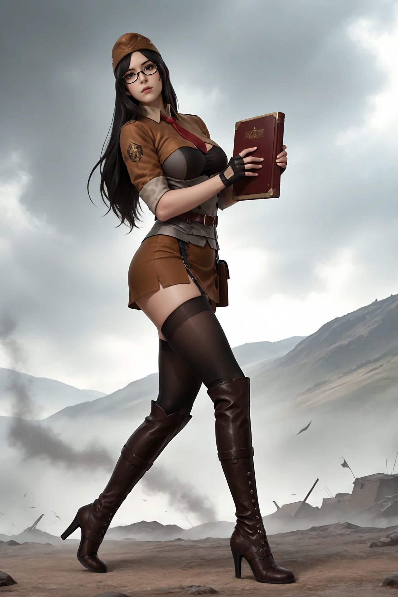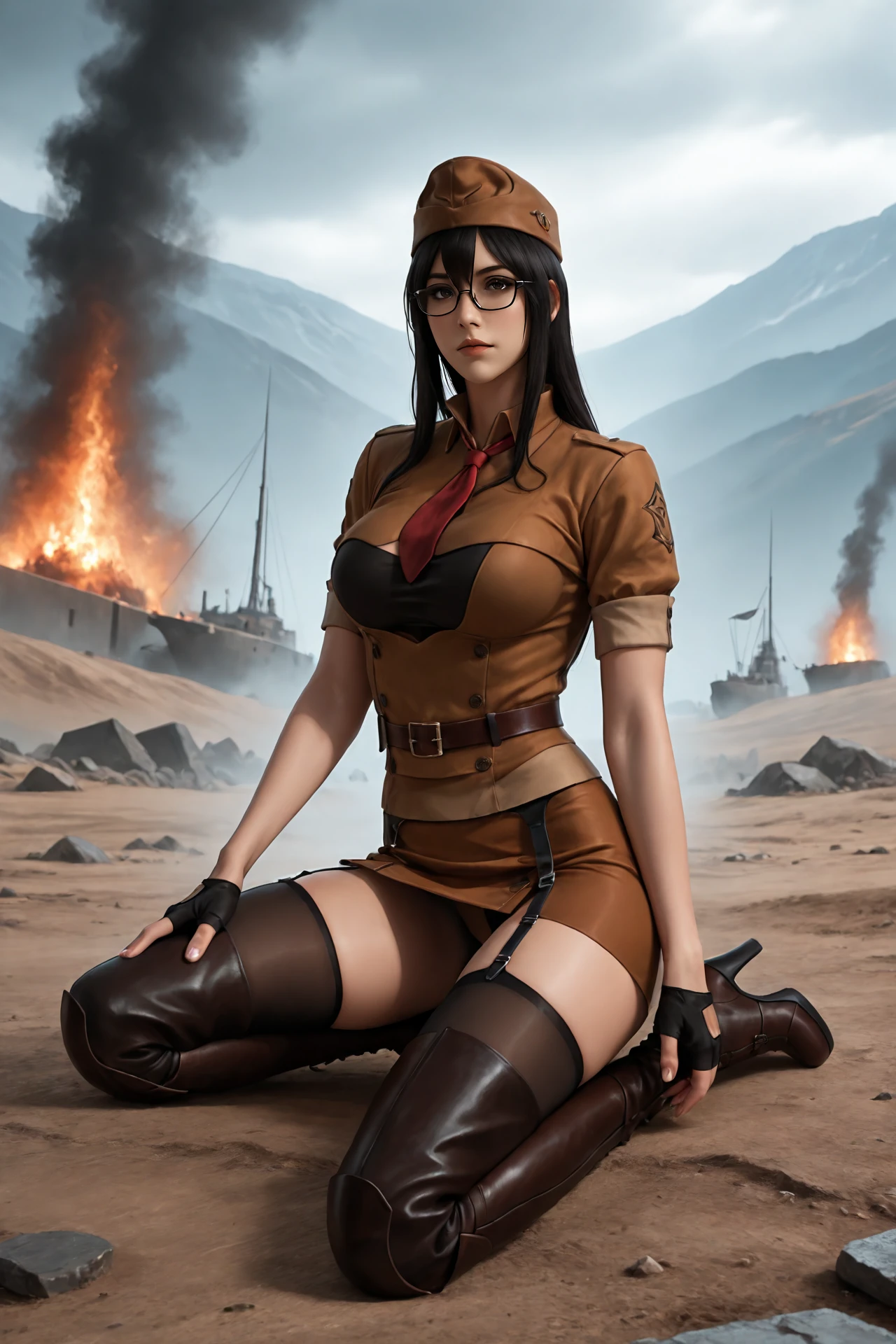 long_hair,black_hair,black-framed_eyewear,hat, large_breasts,necktie,buttons,high_collar, school_uniform,fingerless_gloves,skirt,belt,garter_belt,thighhighs, knee_boots,high_heels,