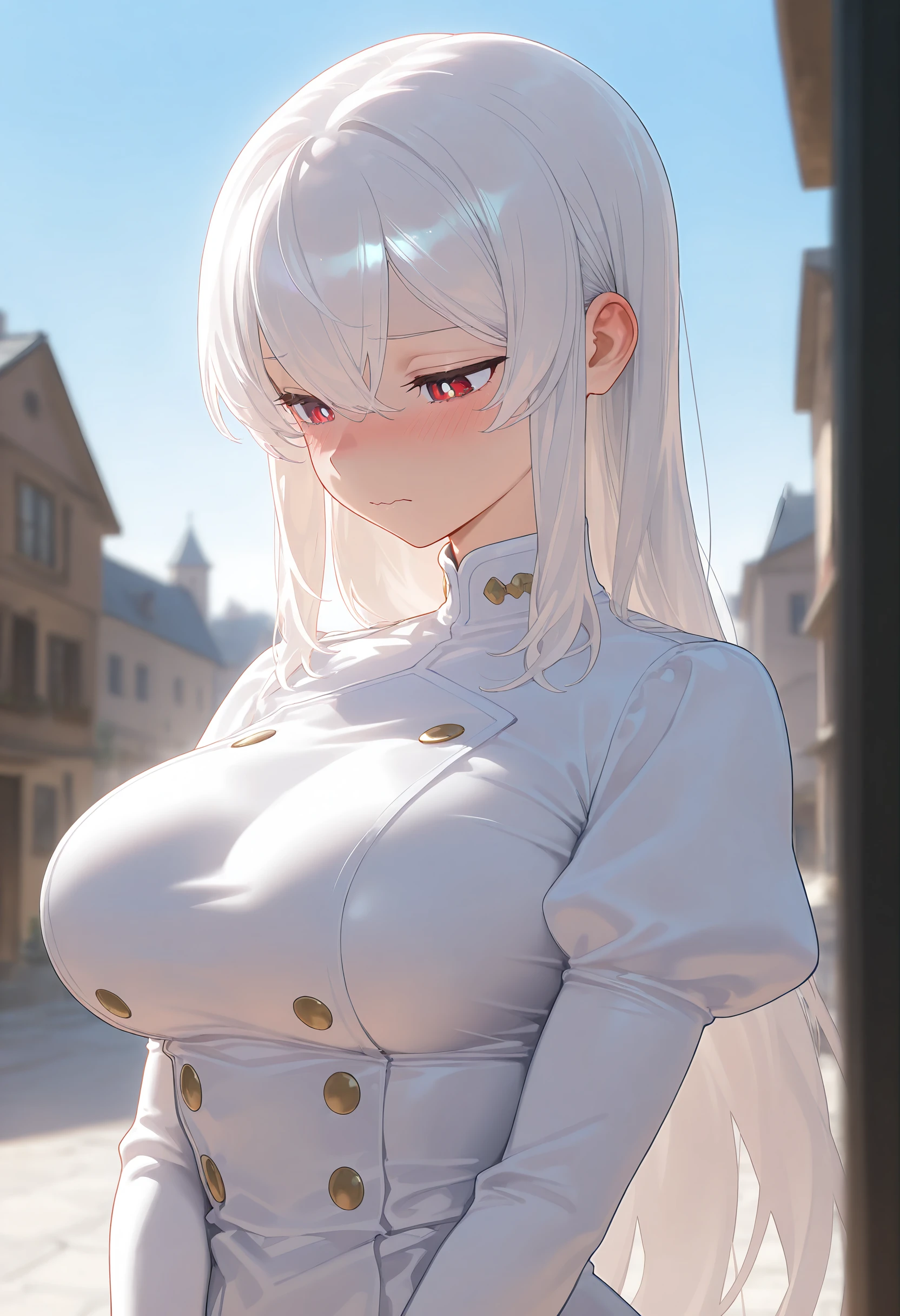 1girl, solo, long hair, large breasts, red eyes, hair between eyes, white hair, bright pupils,