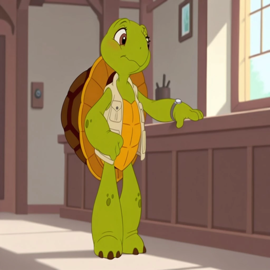 lucyturtleil, semi-anthro turtle, female, green skin, brown eyes, tan vest, tan hat, turtle shell, watch