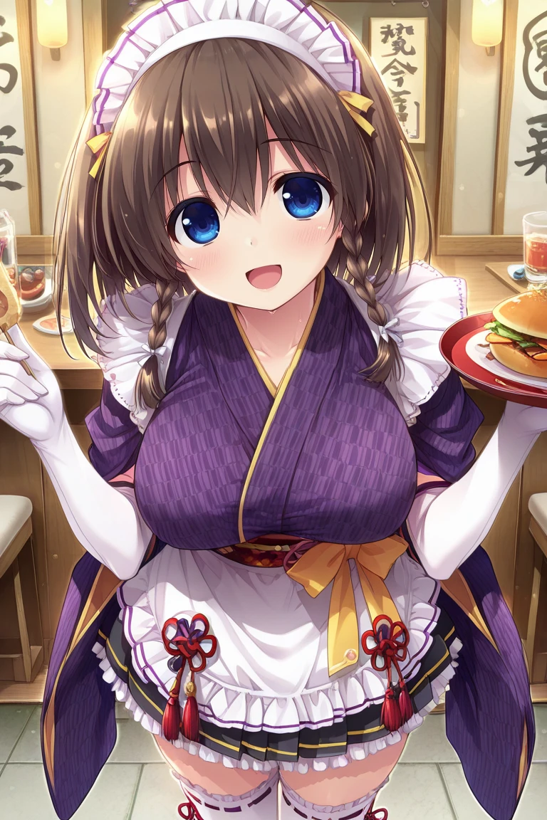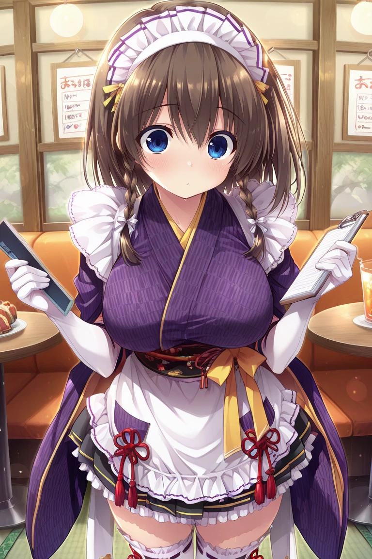 ema-waitress, japanese clothes, maid headdress, purple kimono, white apron, waist apron, white elbow gloves, black skirt, white thighhighs, ribbon-trimmed legwear, brown boots,