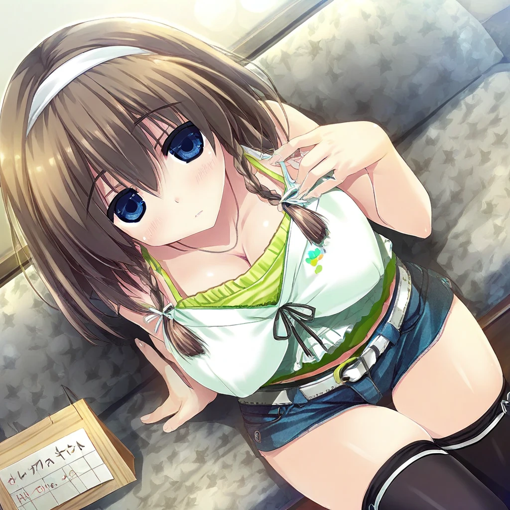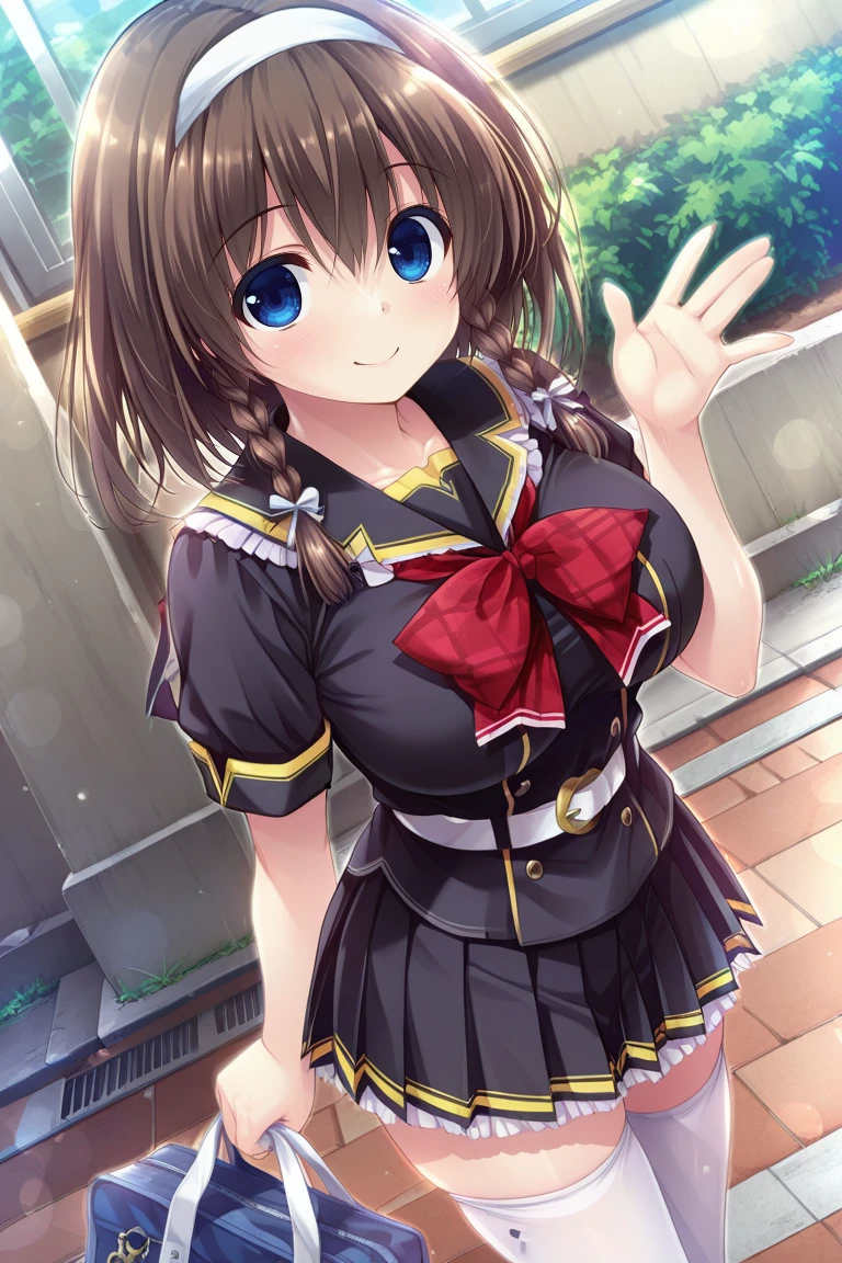 brown hair, medium hair, bangs, hair between eyes, twin braids, hairband, blue eyes, large breasts,